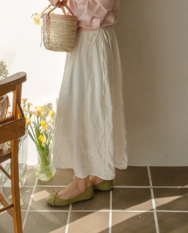 浪漫蕾絲花朵刺繡腰側綁帶感性方領連身裙 乳白色