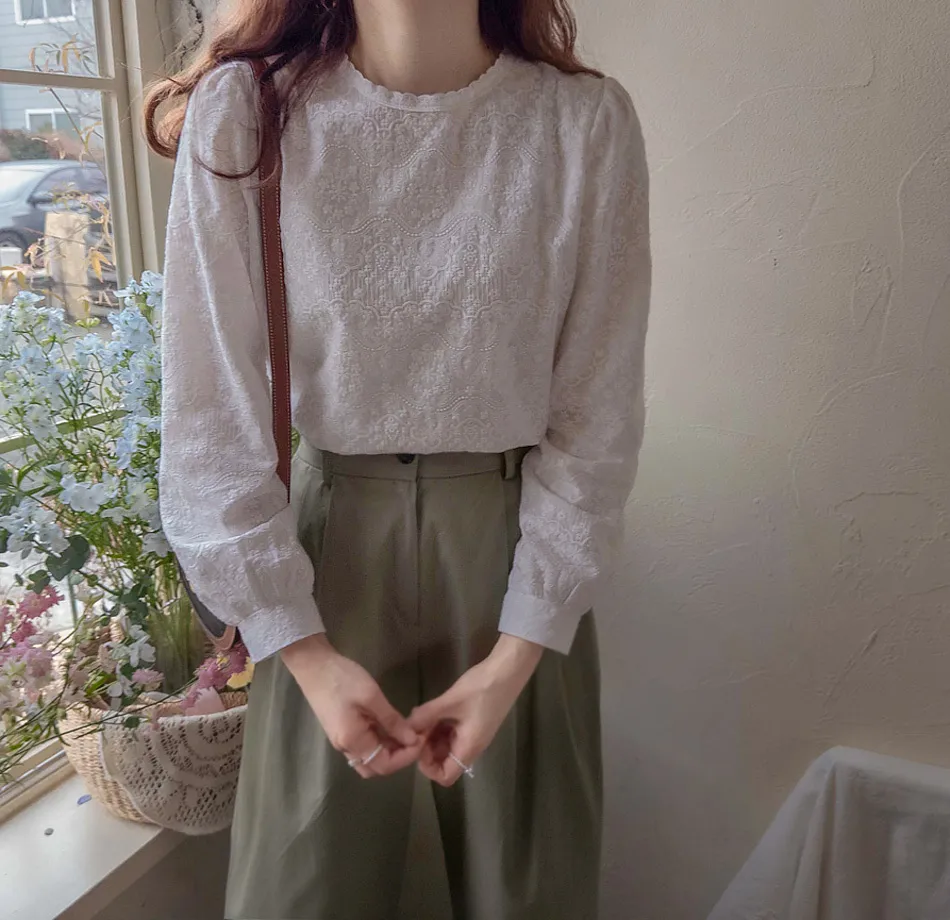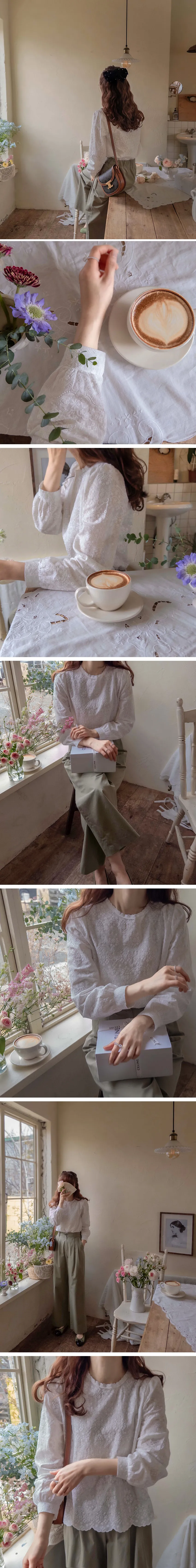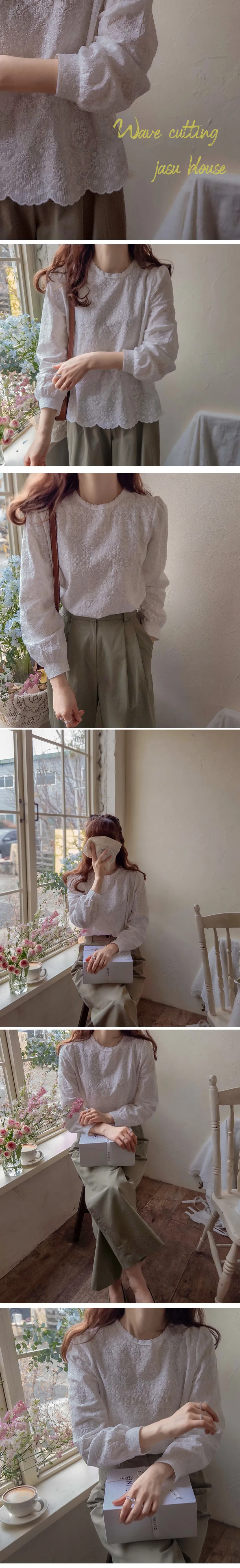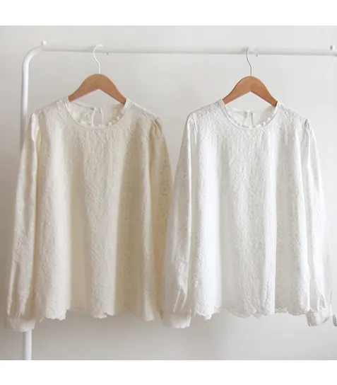 【可愛的蕾絲設計,帶有微妙的花朵刺繡】【波浪狀的蕾絲領也很漂亮】【袖子和肩部也有微妙的細摺,營造出優雅感】【明亮的春天色彩穿起來很棒】【底部的波浪也很漂亮