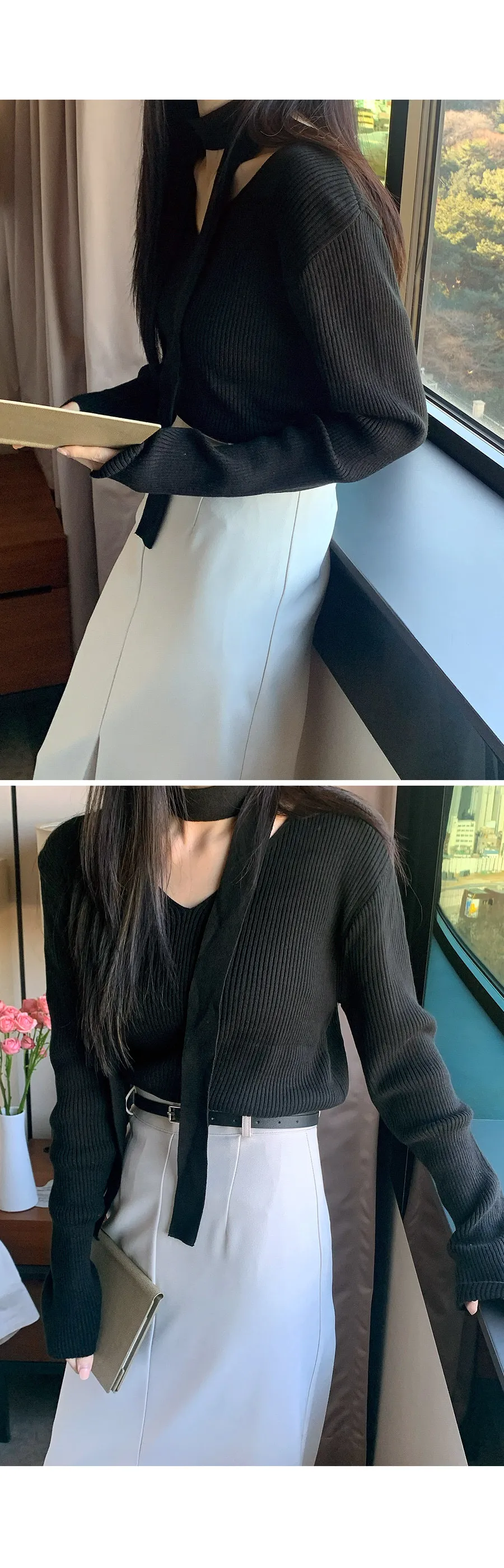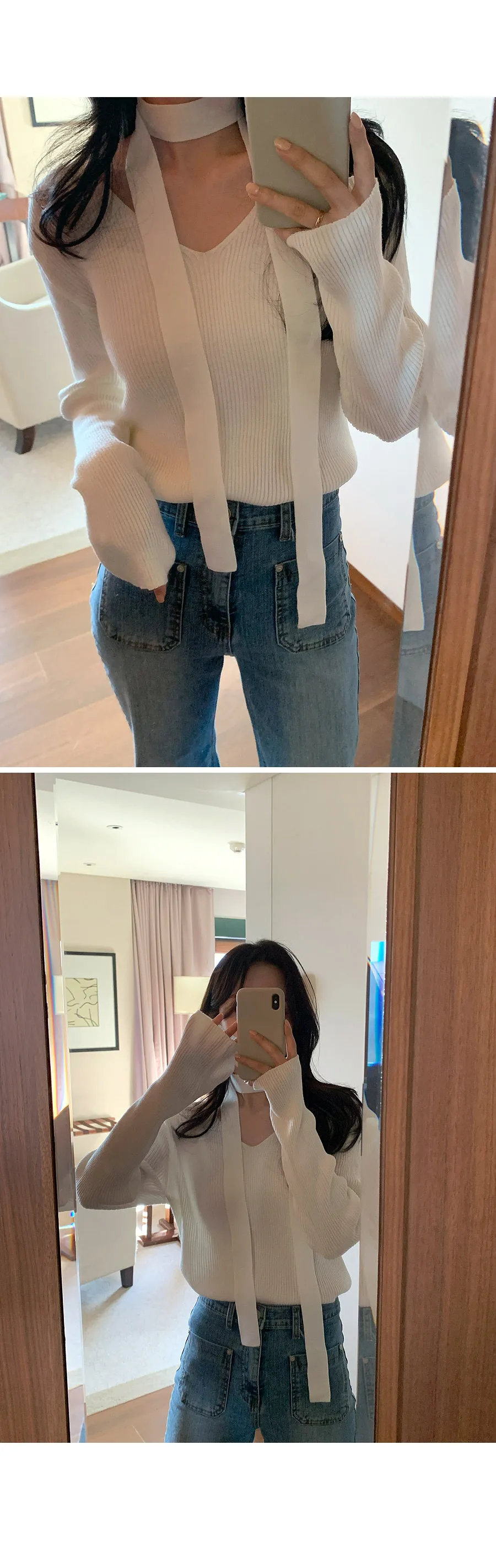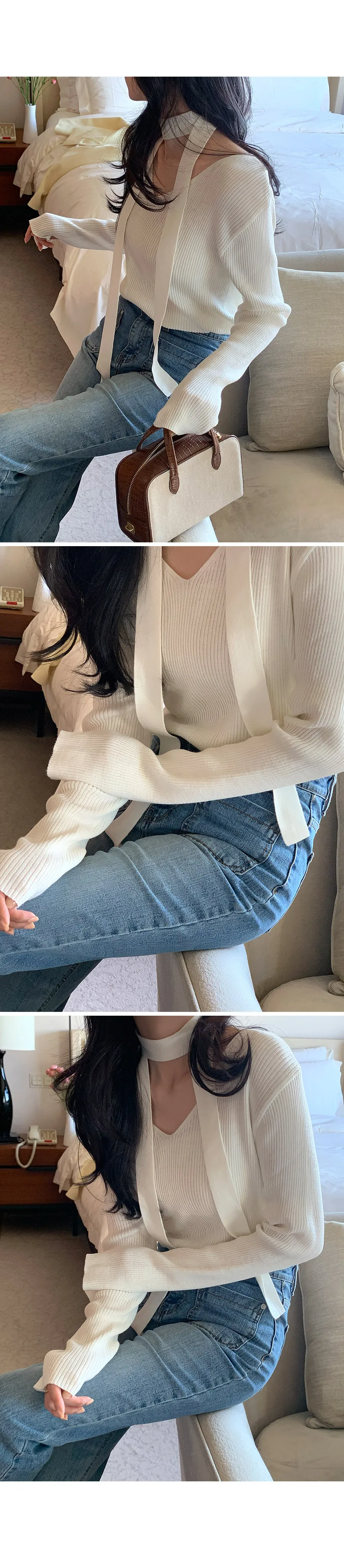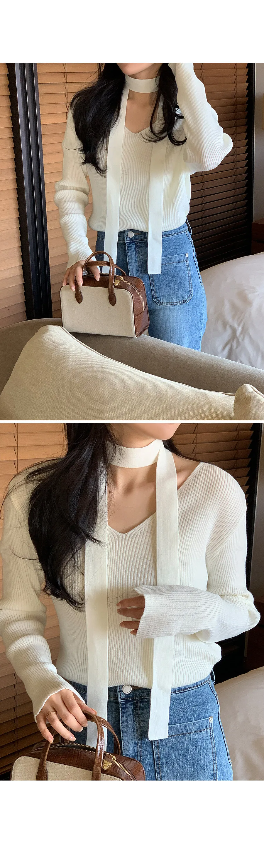 感性V領露鎖骨風格圍巾羅紋針織上衣