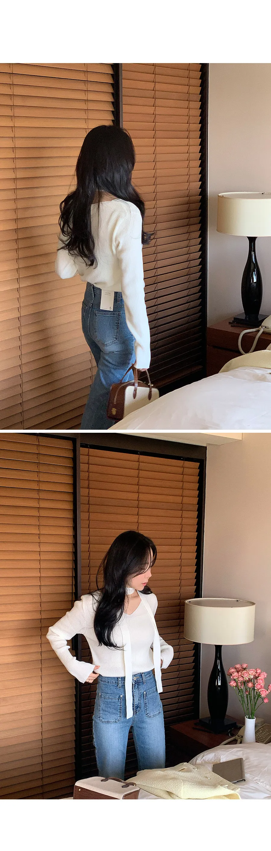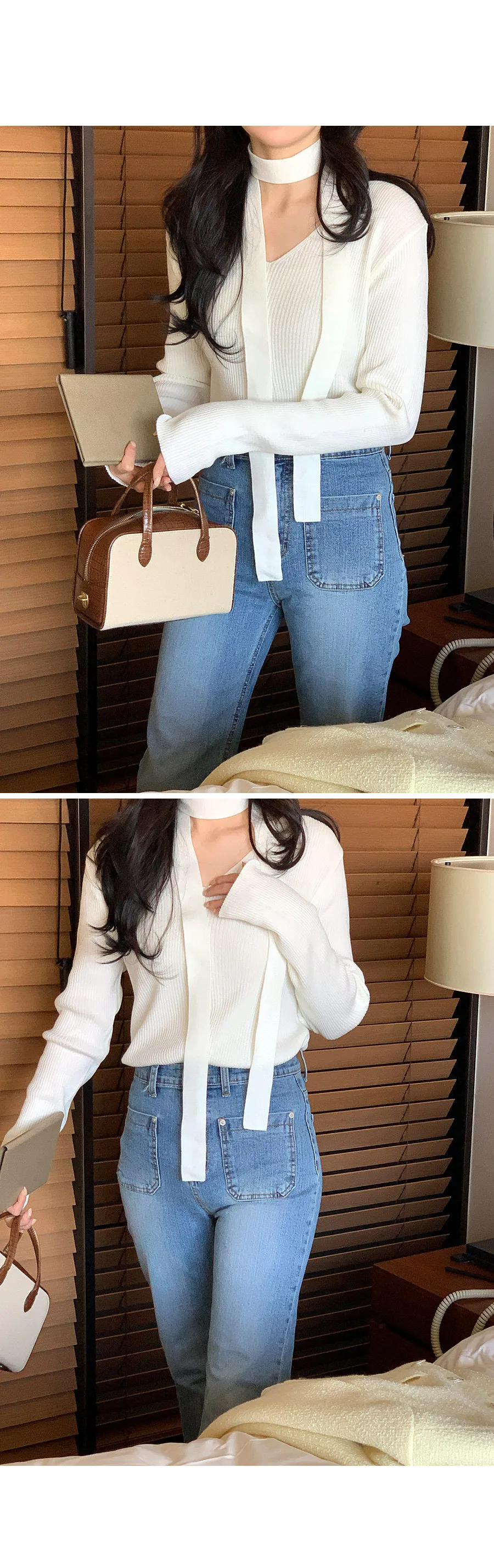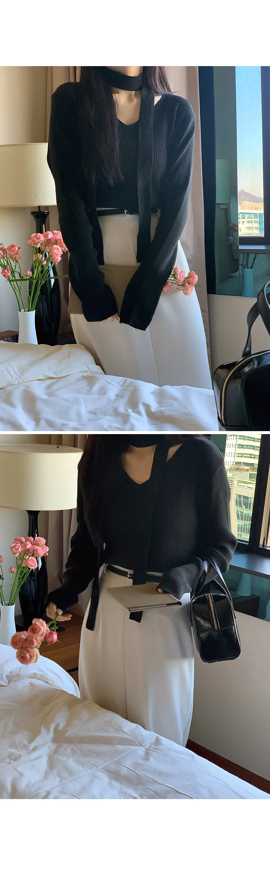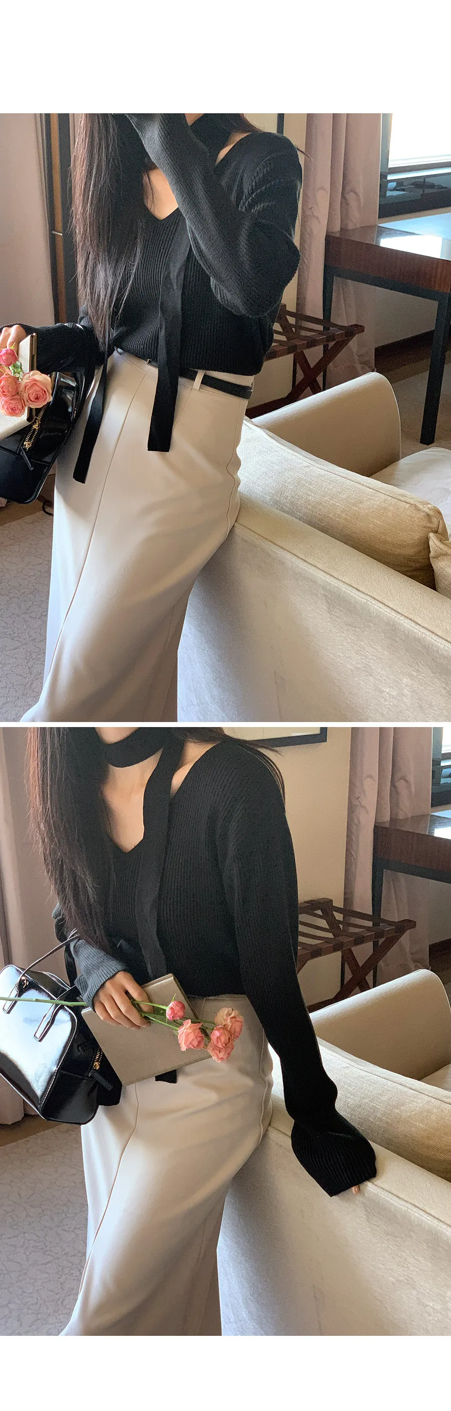 感性V領露鎖骨風格圍巾羅紋針織上衣