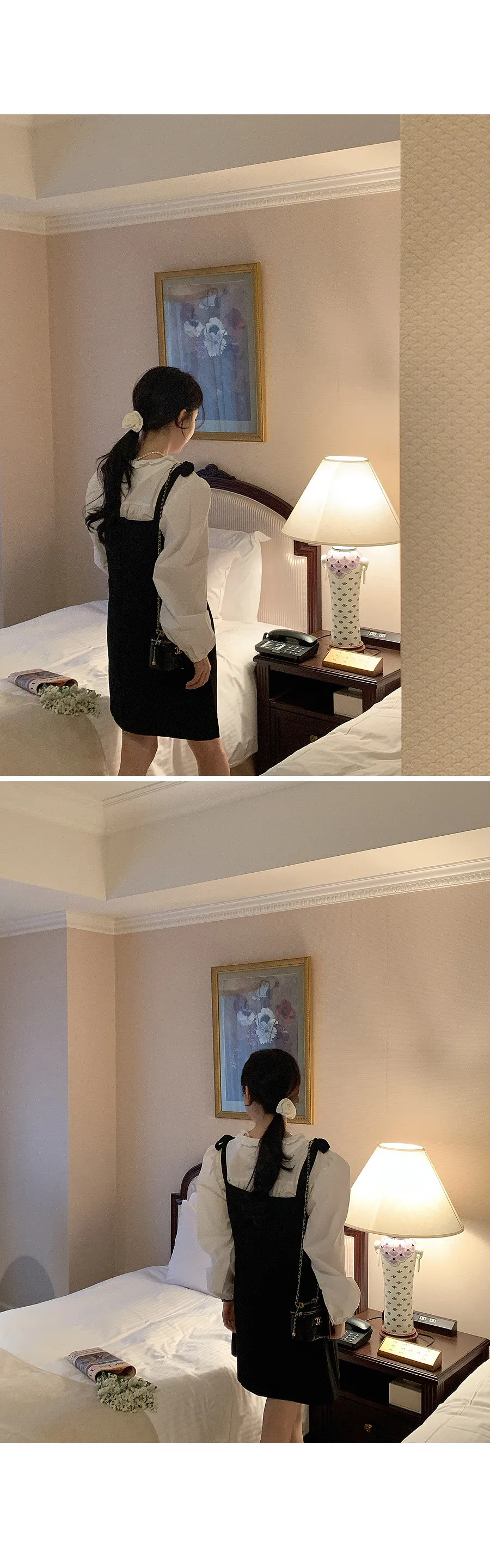 肩帶直接系結,自然的絲帶點營造出可愛的氛圍 - 腰線處的別針褶皺凸顯裙子的修身效果,適合婚禮賓客造型!