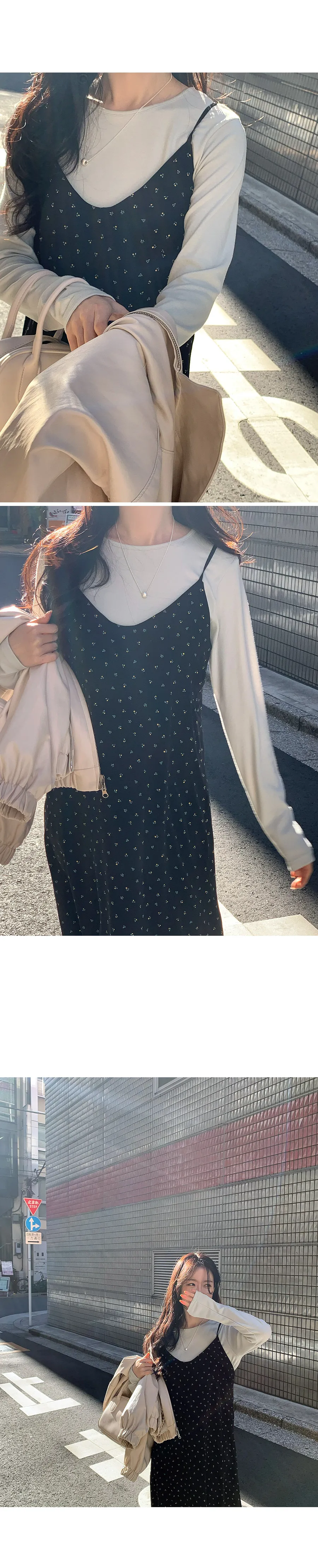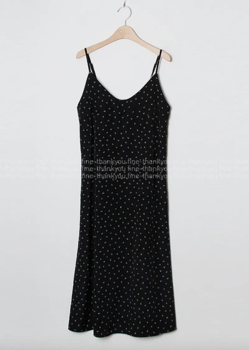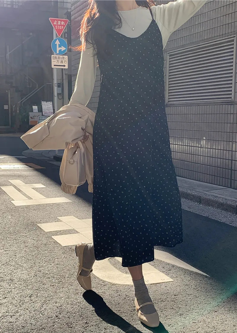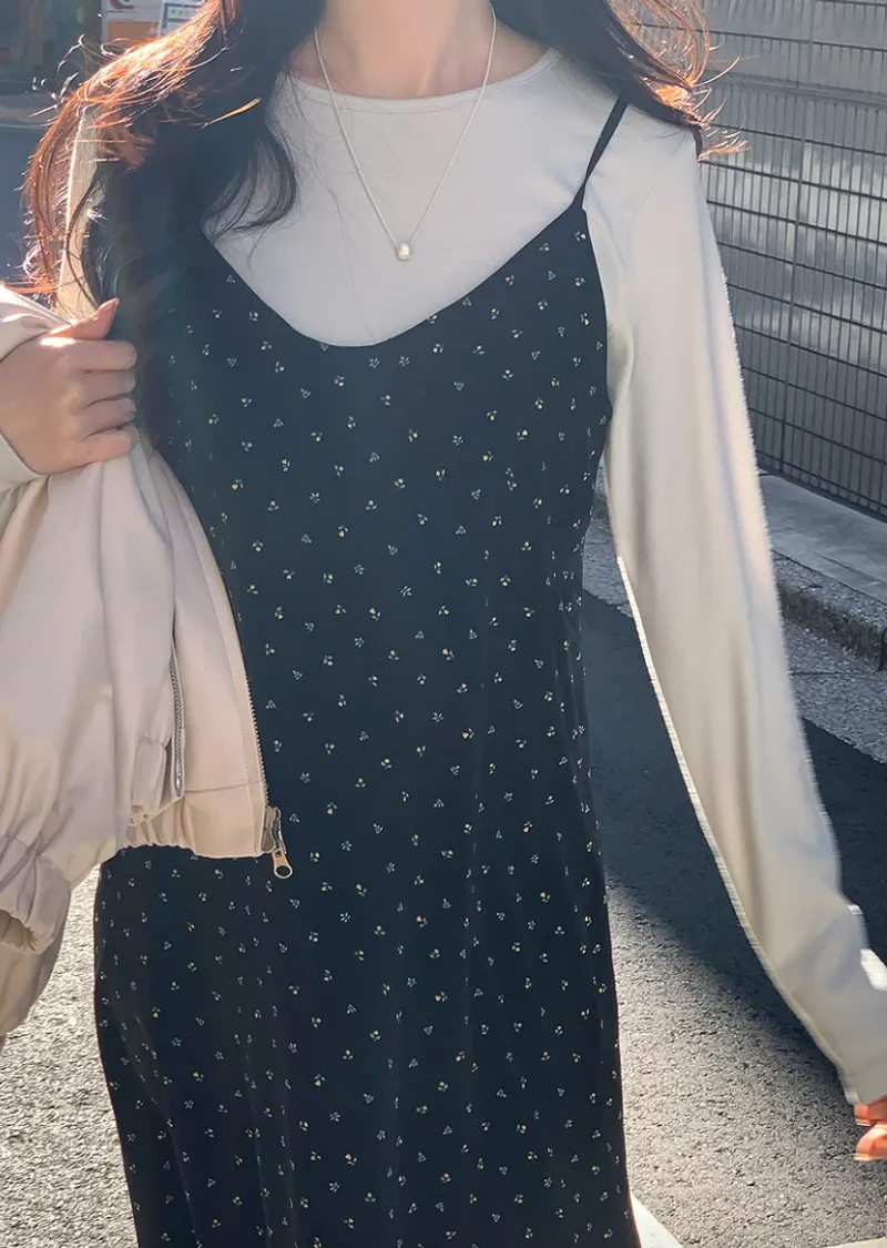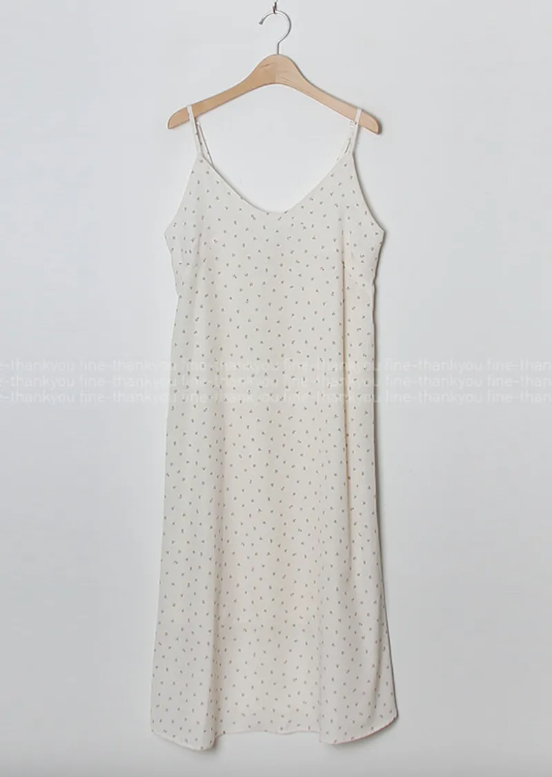 帶有微妙花朵圖案的長款連身裙,乾淨清新,非常適合搭配各種外衣,它的版型乾淨俐落:)