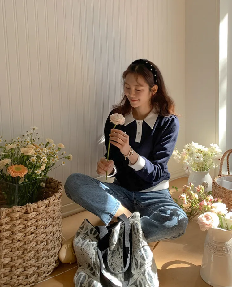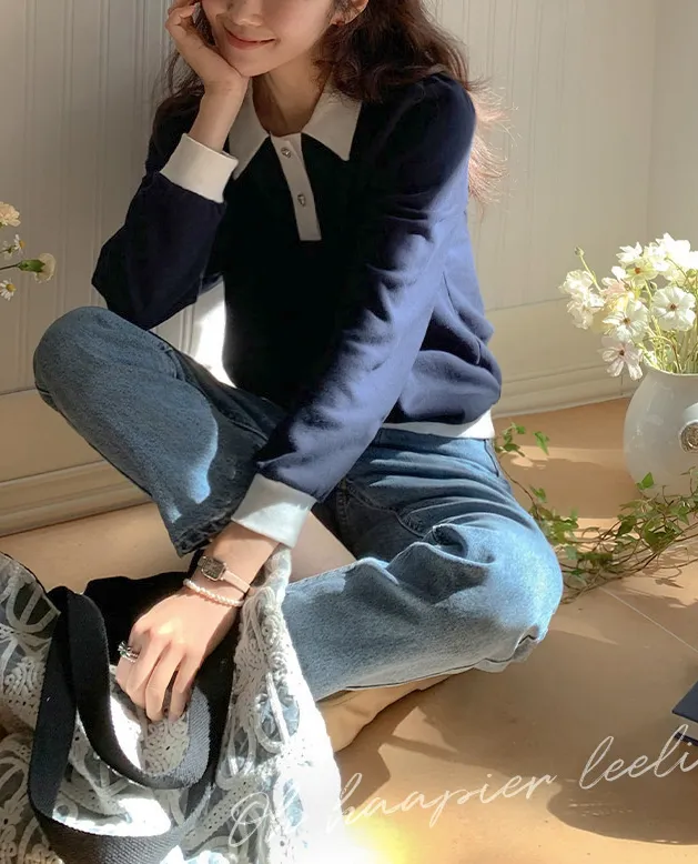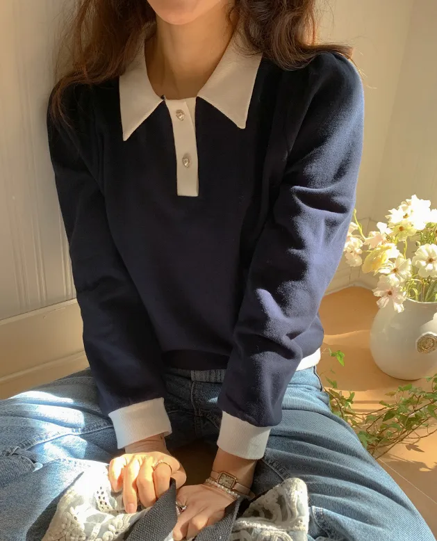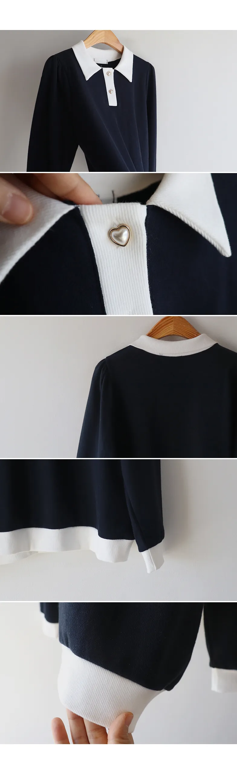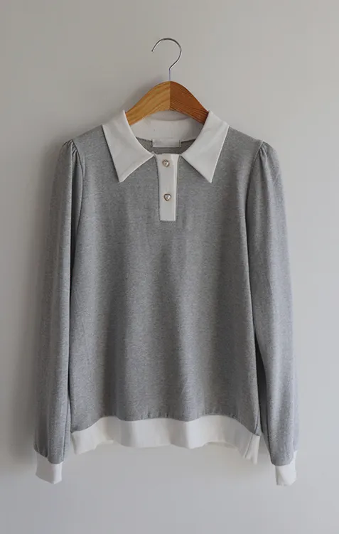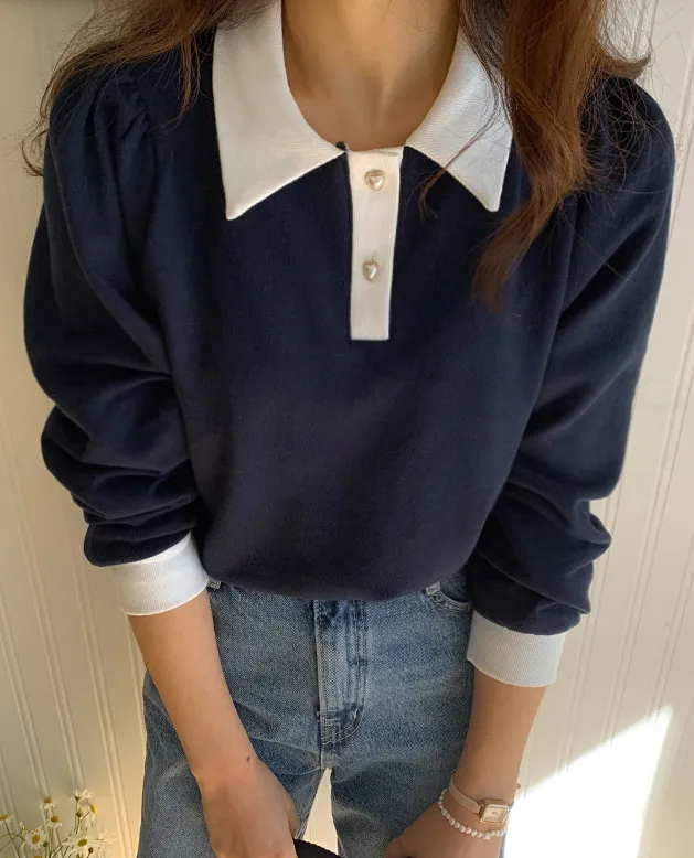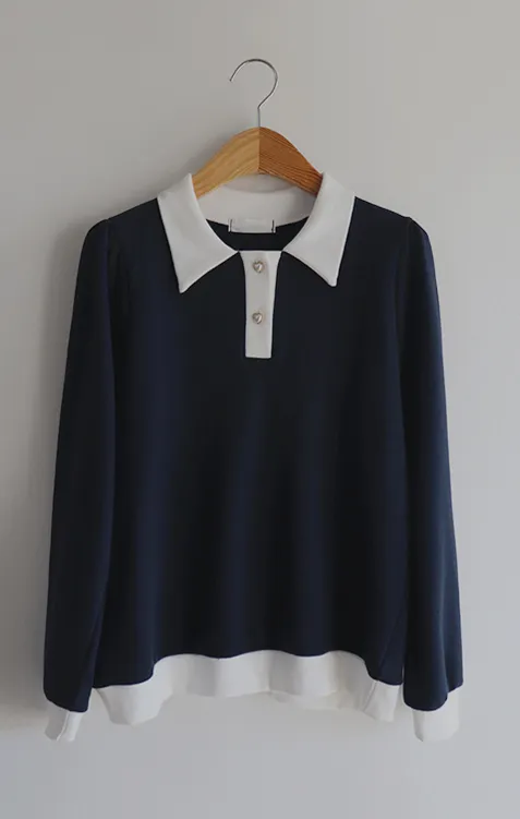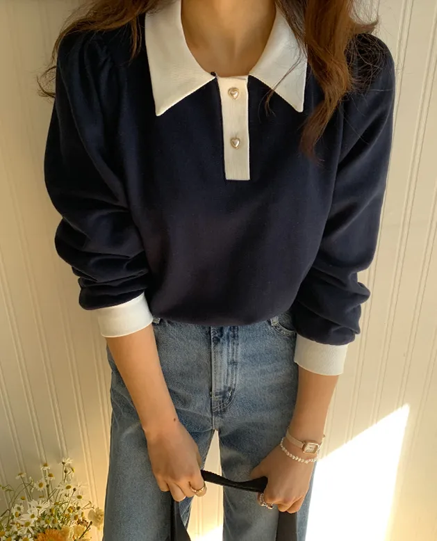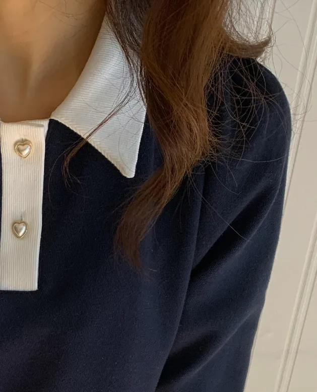 [乾淨俐落的心情配色領上衣♡][心形珍珠鈕扣增添可愛感!][帶有肩部抽褶的可愛肩線]
