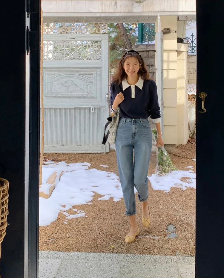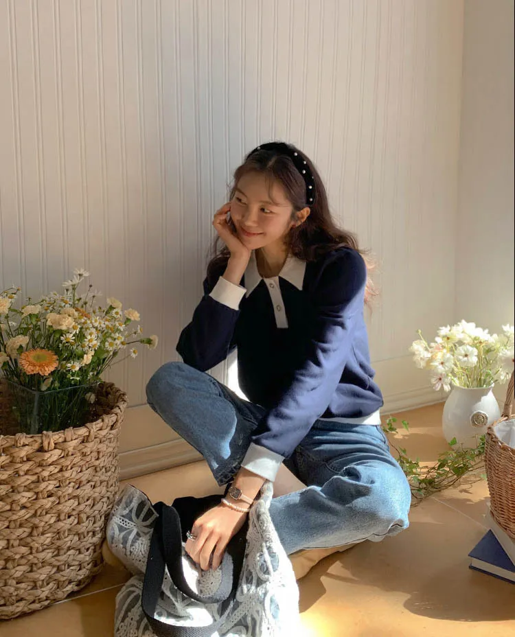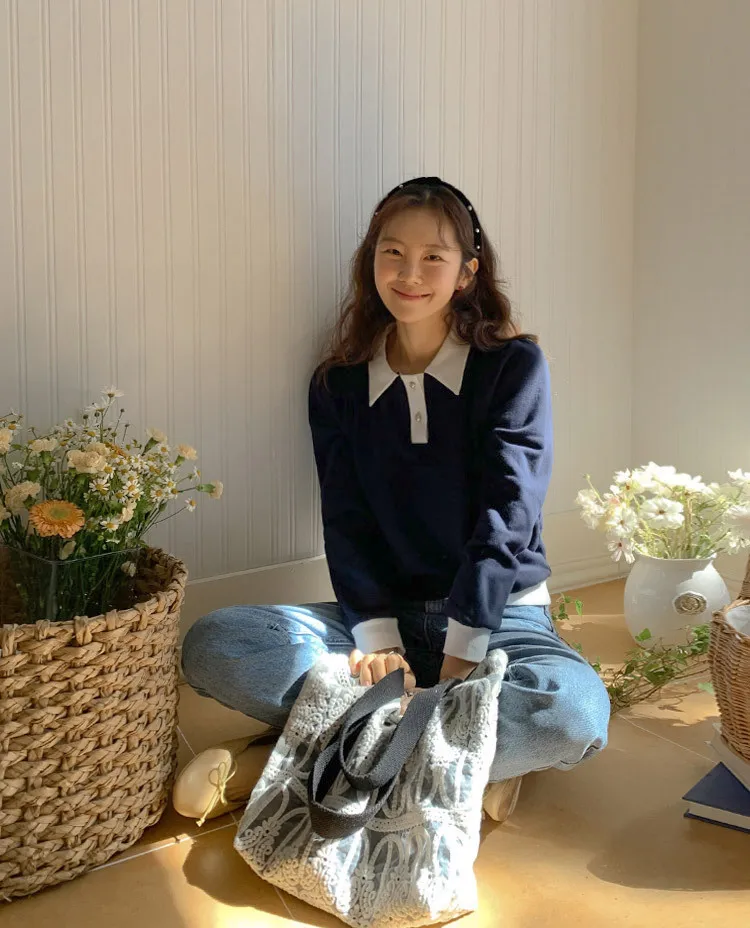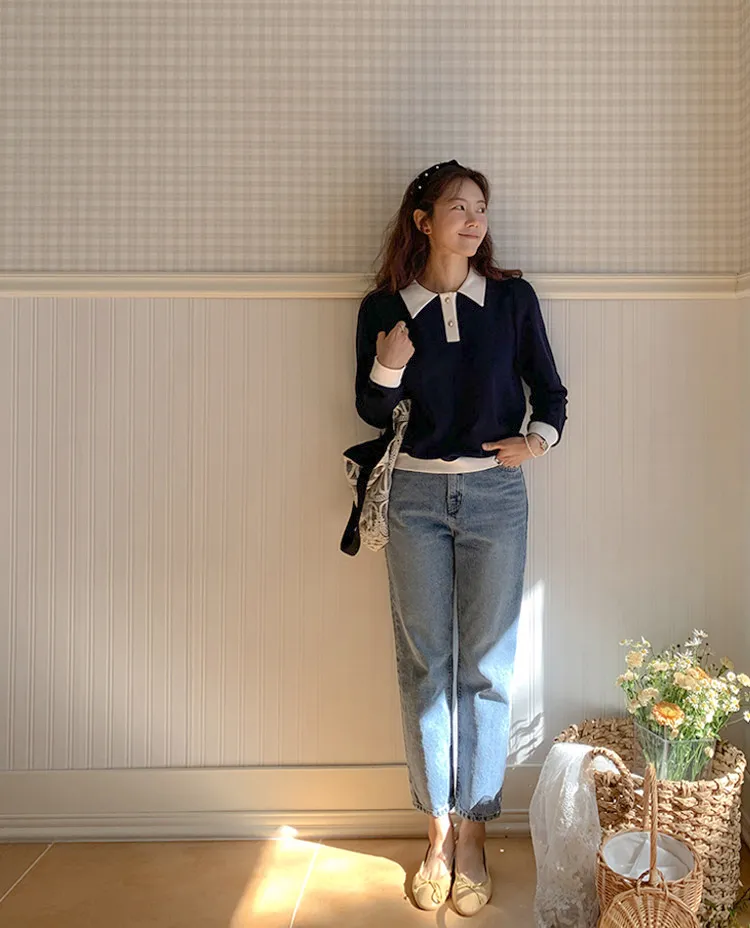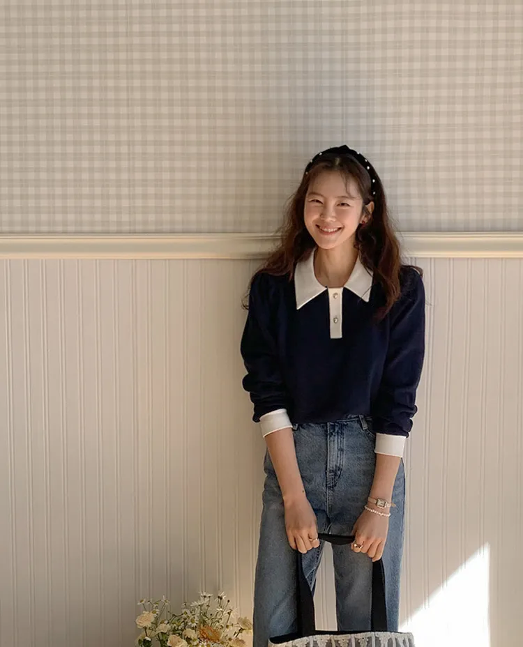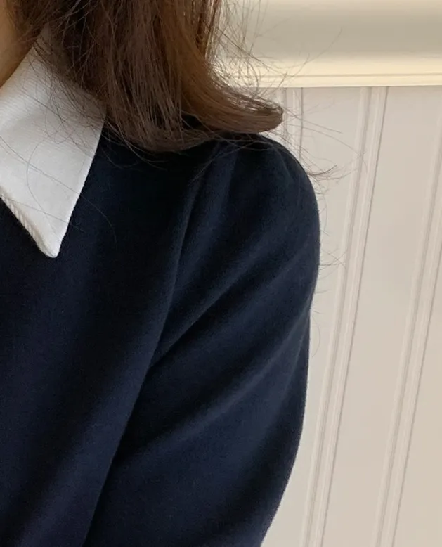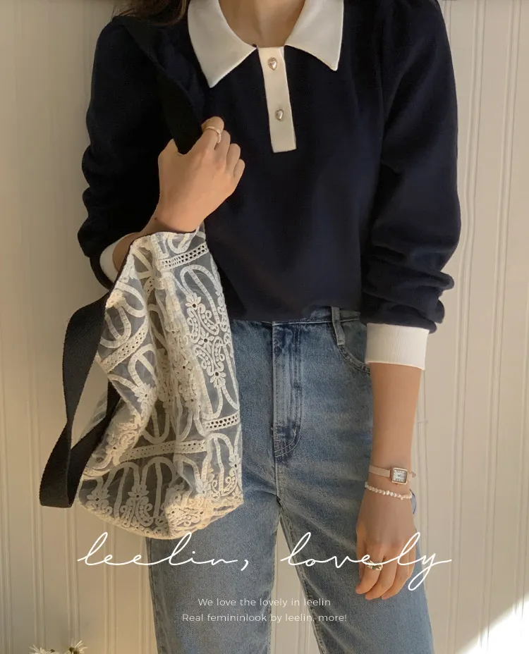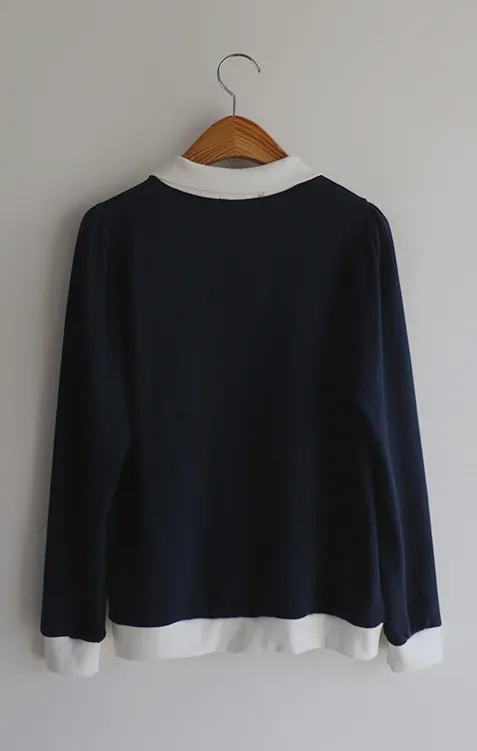 [乾淨俐落的心情配色領上衣♡][心形珍珠鈕扣增添可愛感!][帶有肩部抽褶的可愛肩線]
