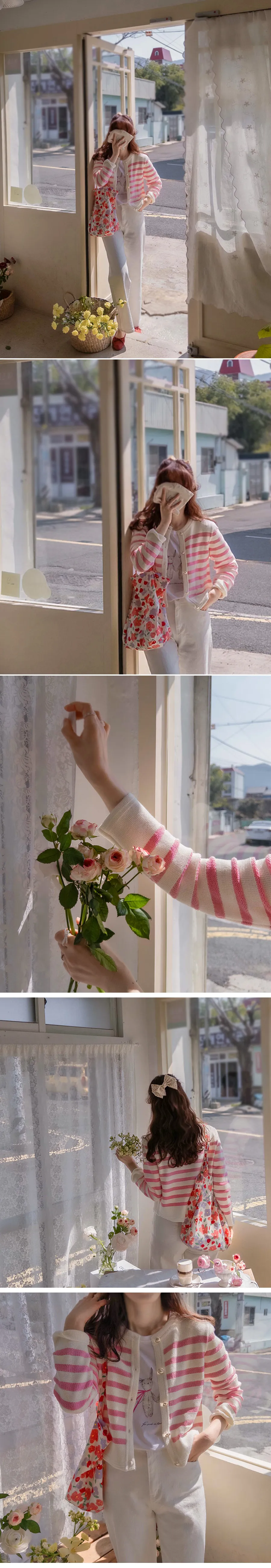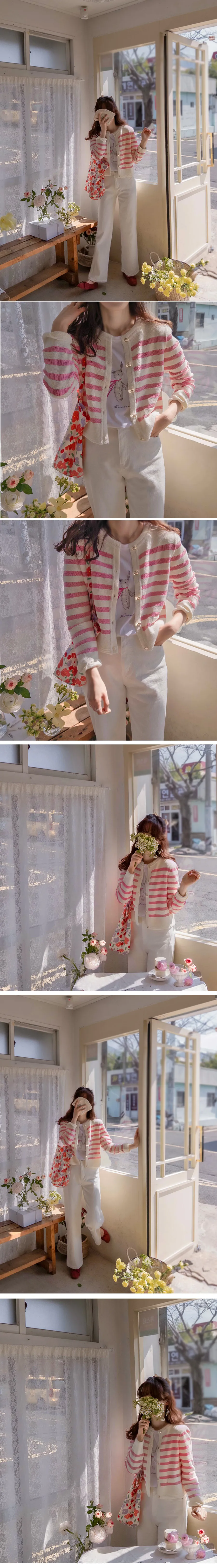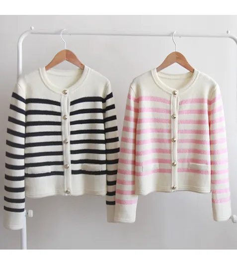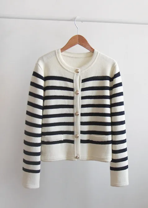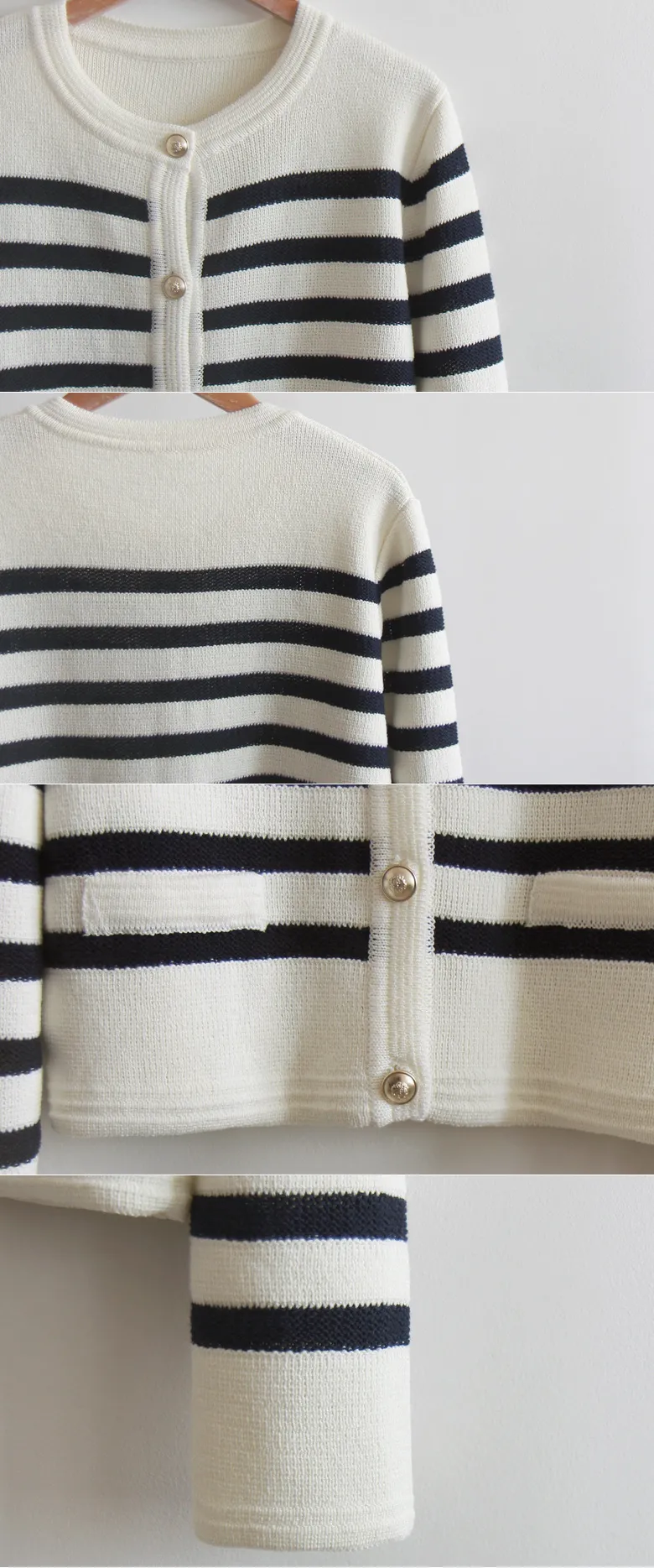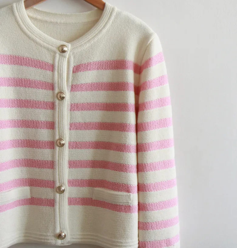 [給人清新感覺的條紋圖案][奢華材質][非常適合作為春季外套,時尚合身][帶有金色鈕扣的精緻設計][具有明亮而精緻的春天感]