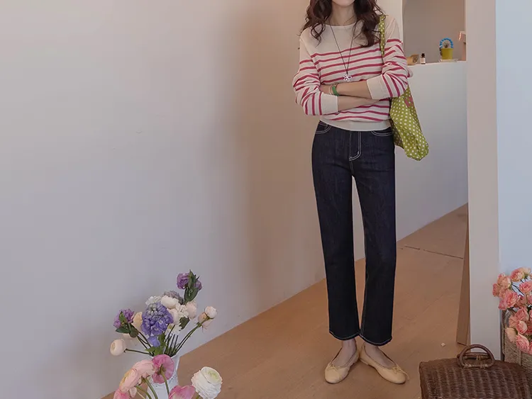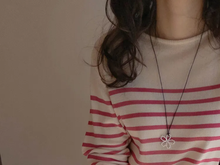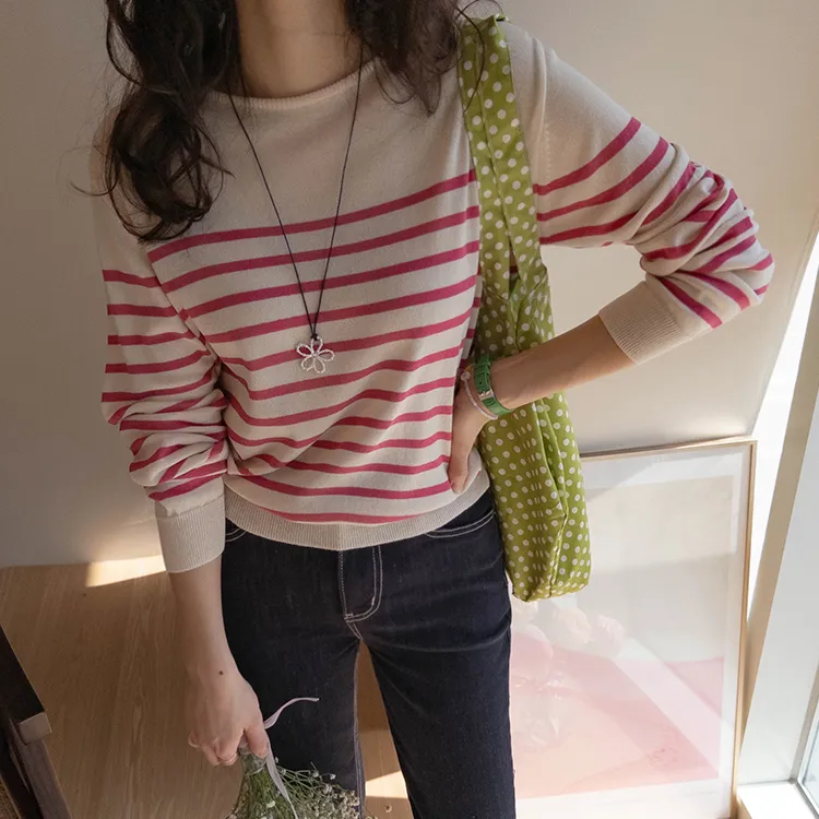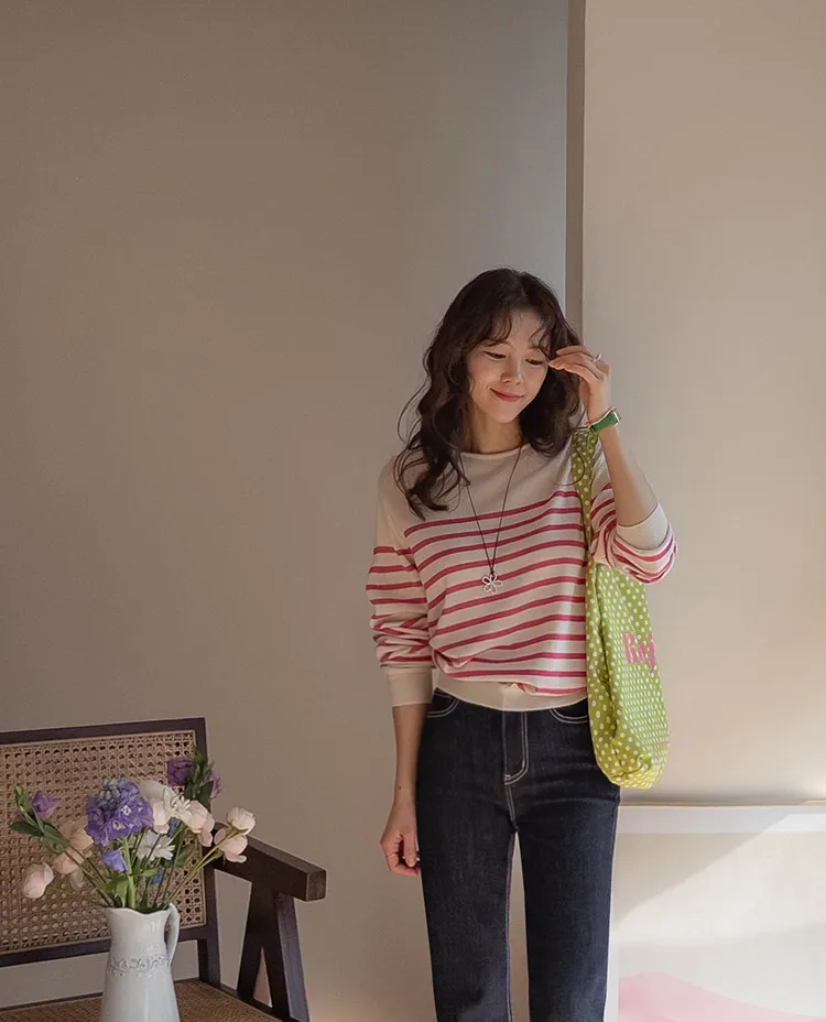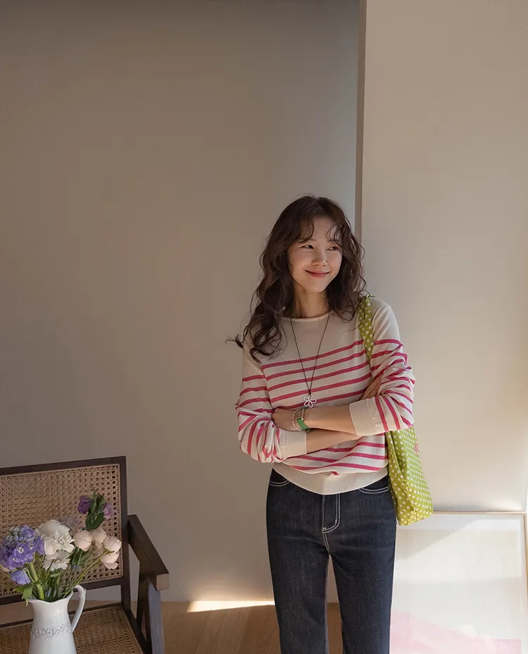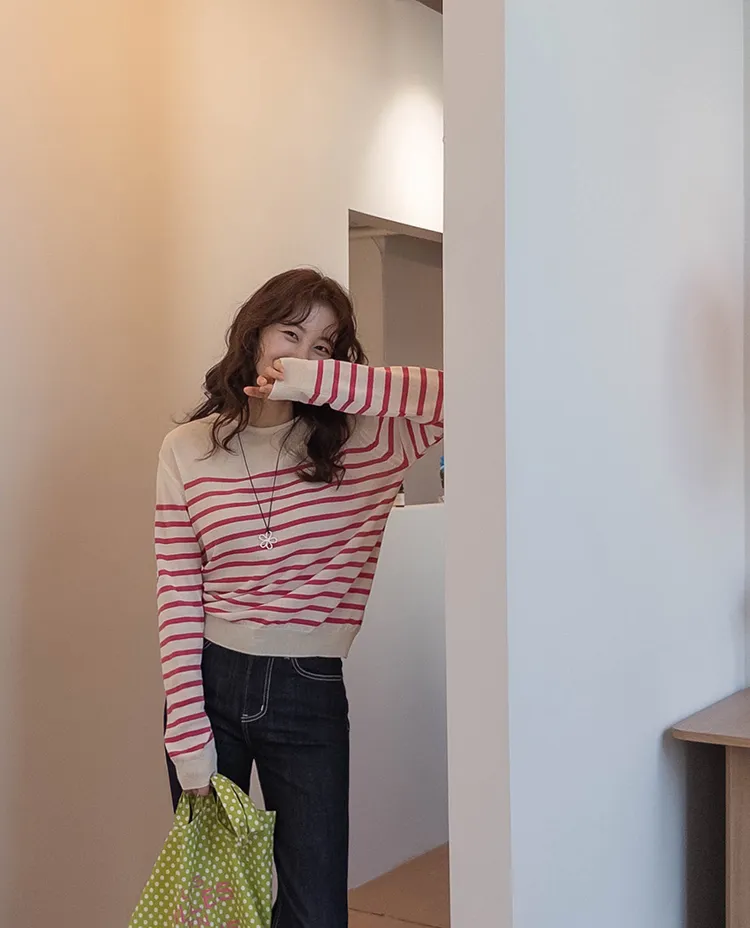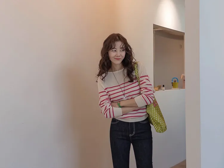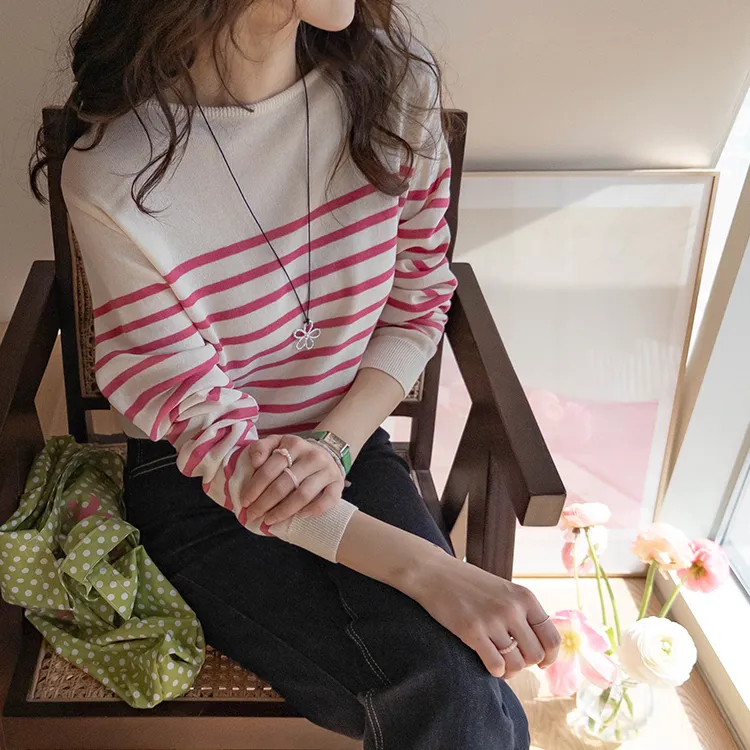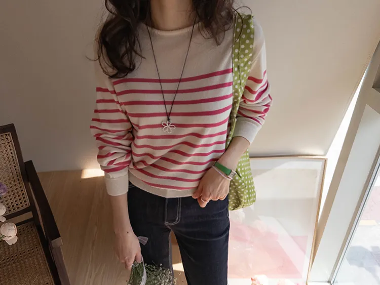 感性領口線條條紋針織上衣