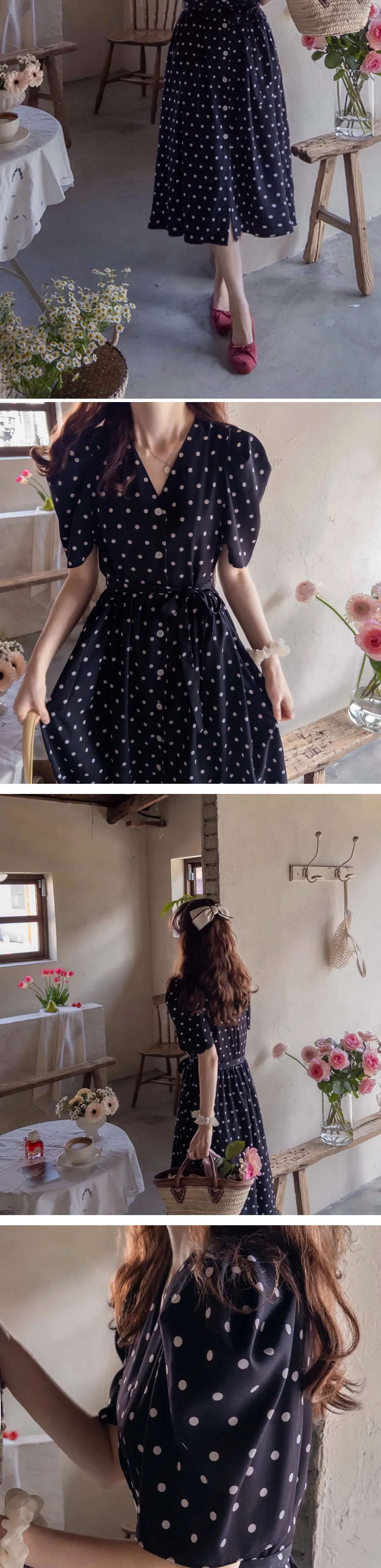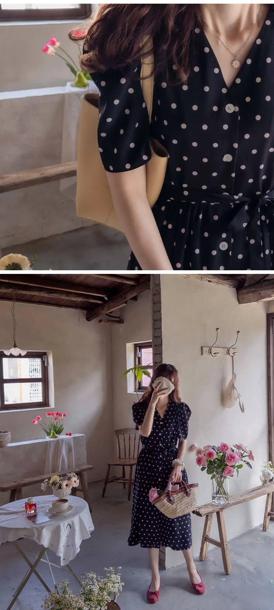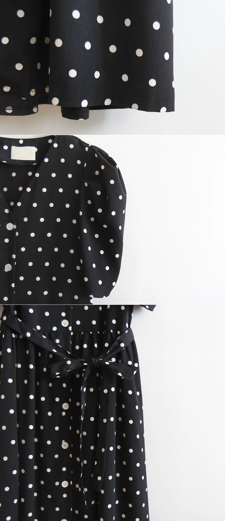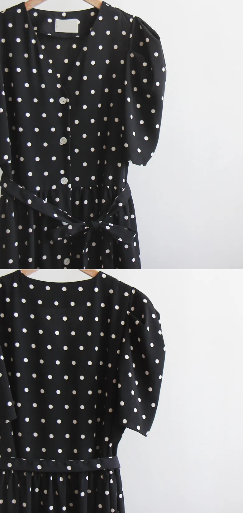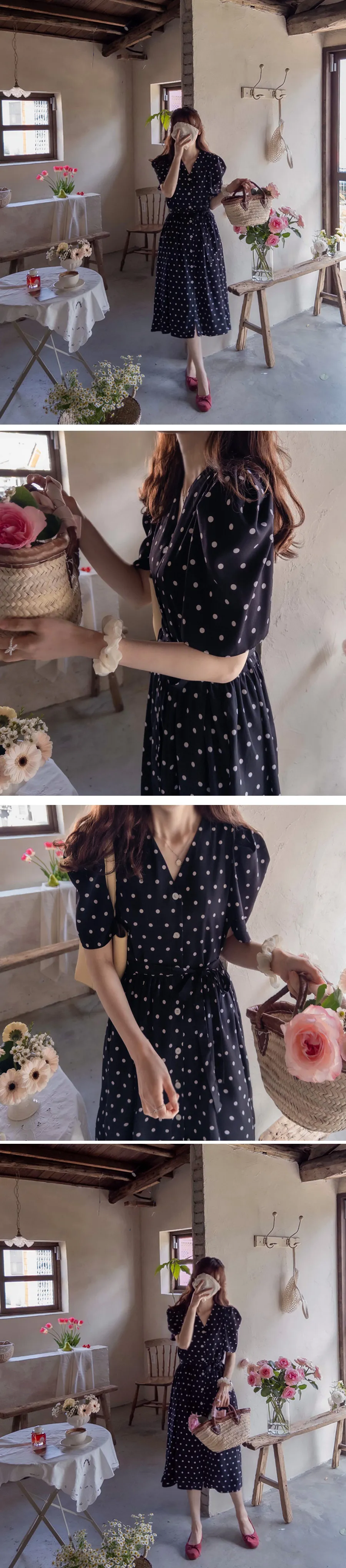 [腰帶組:可拆][鈕扣帶開合][圓點圖案,活潑的造型][泡泡袖也很漂亮][在腰帶上繫上絲帶,時尚合身][換季也可以穿][採用柔韌材質,穿著舒服,用來穿外套也很棒!]