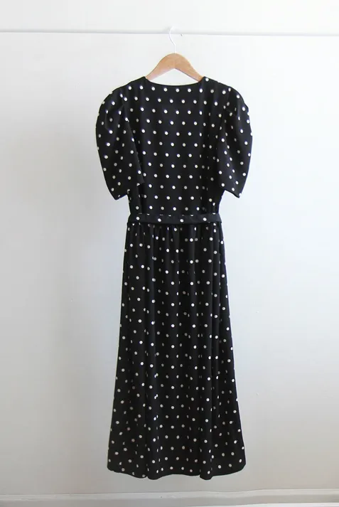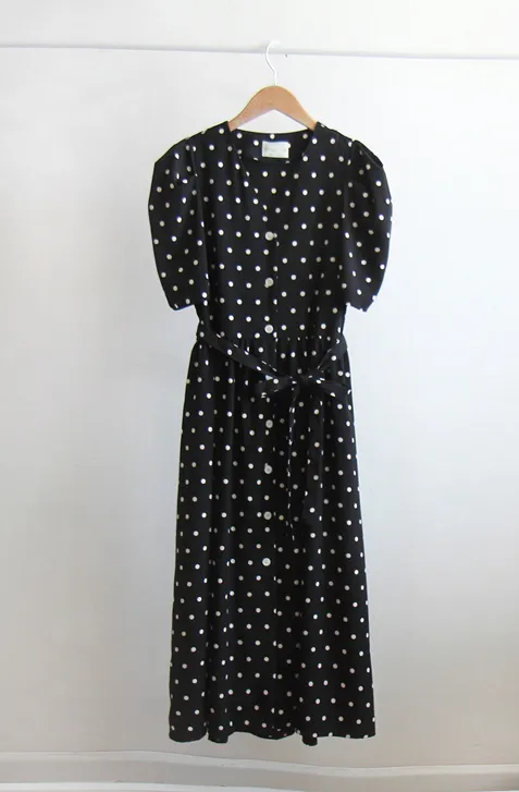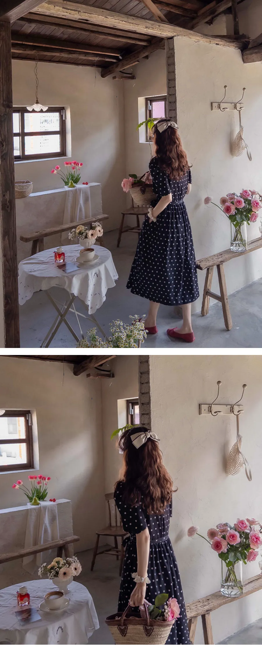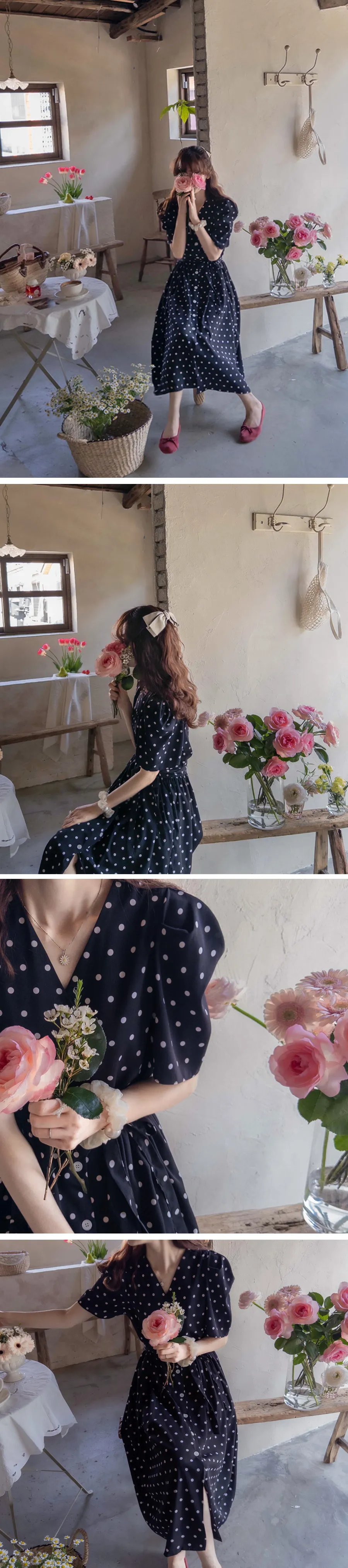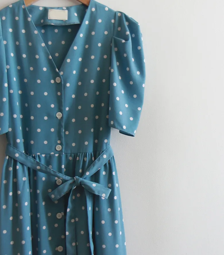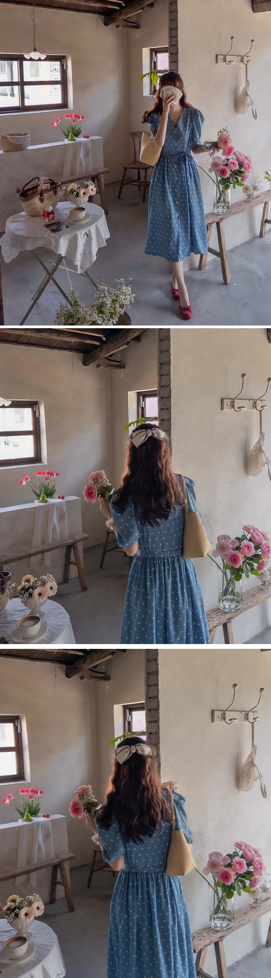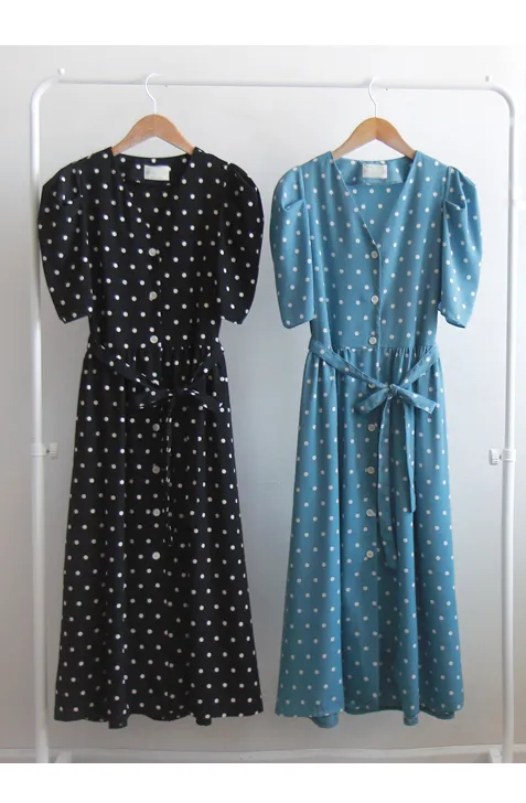 [腰帶組:可拆][鈕扣帶開合][圓點圖案,活潑的造型][泡泡袖也很漂亮][在腰帶上繫上絲帶,時尚合身][換季也可以穿][採用柔韌材質,穿著舒服,用來穿外套也很棒!]
