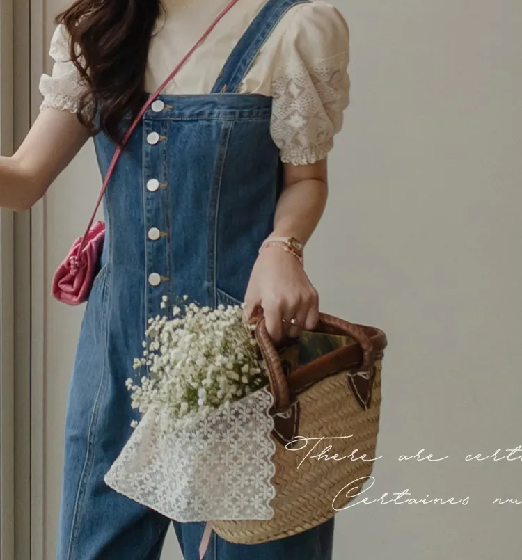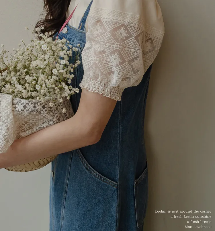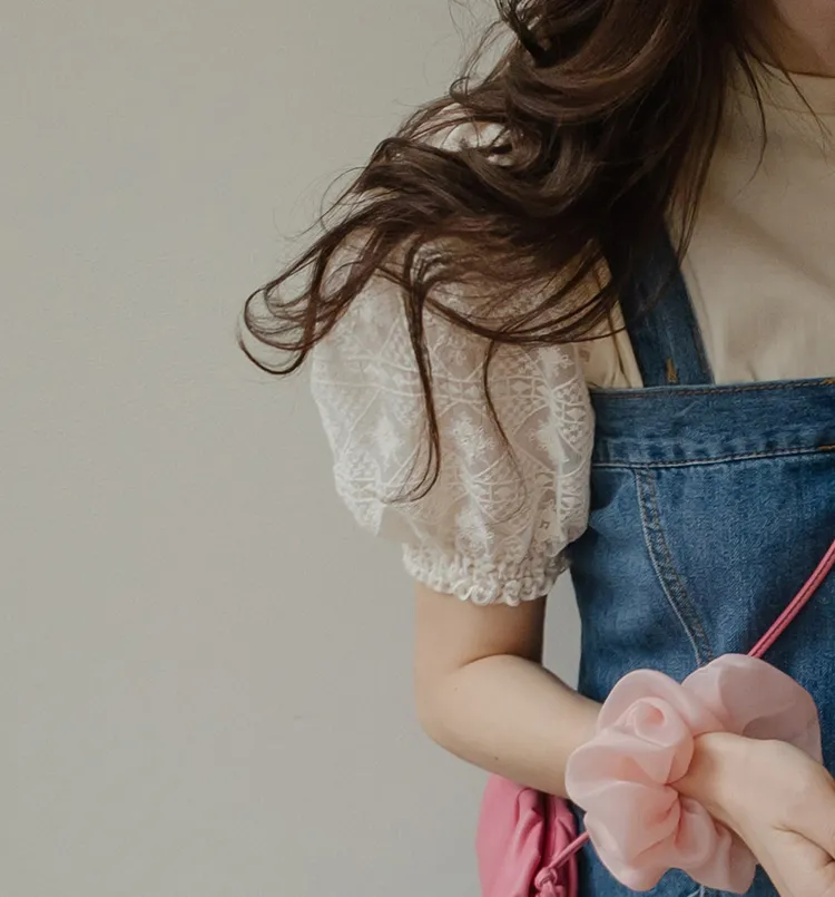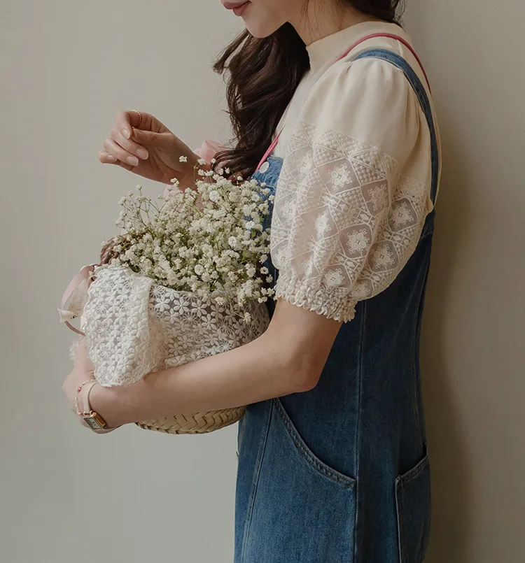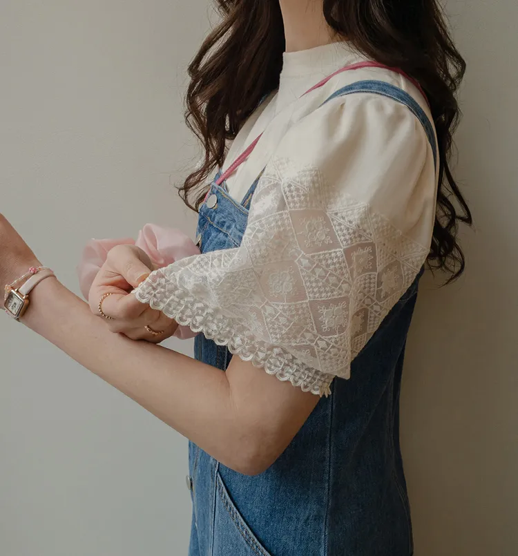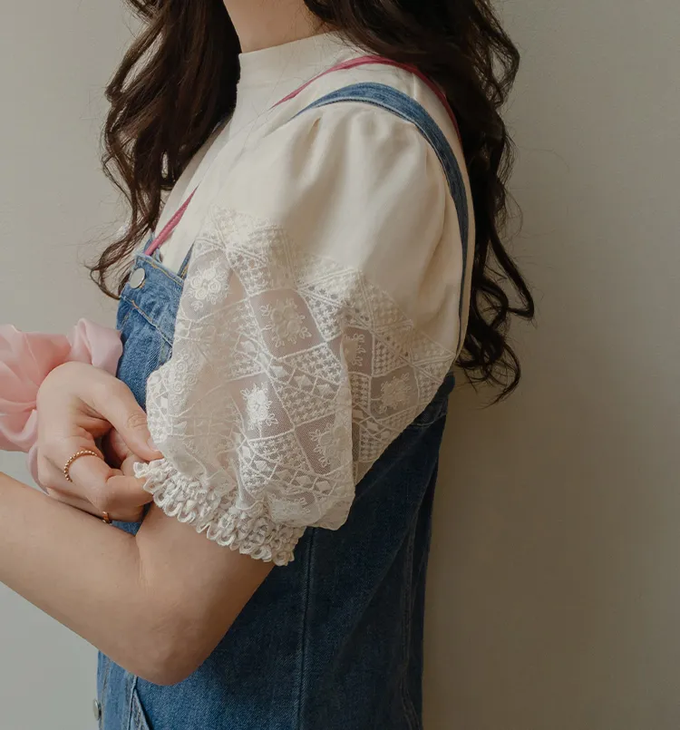 漂亮方形花朵蕾絲袖末鑲邊短袖上衣 現貨