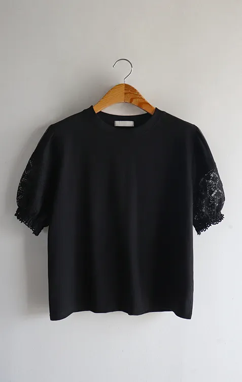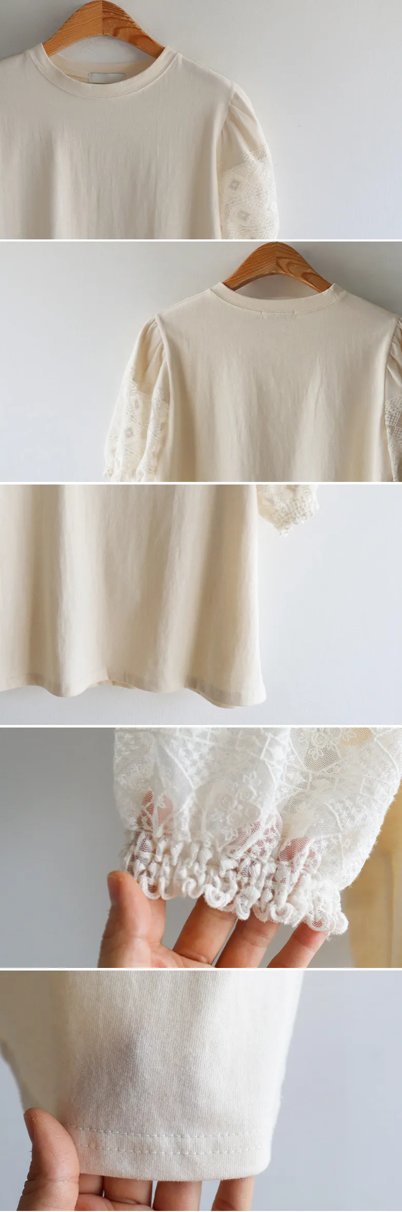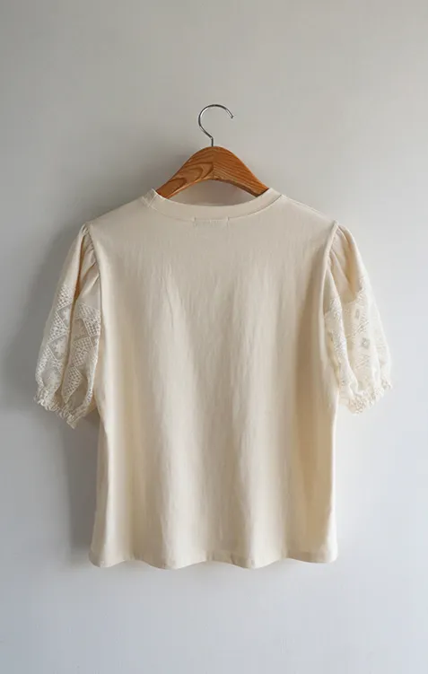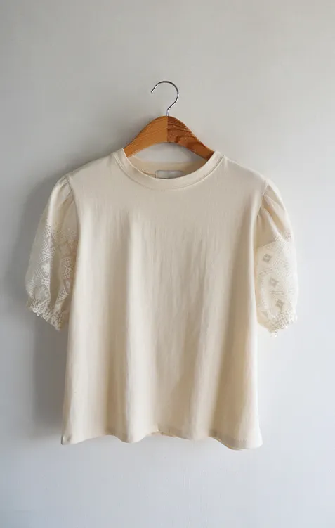 【特別觸感的蕾絲短袖T卹♡】【泡泡袖充滿女人味,可愛!】【舒適無刺激!!】【標準版型,有點寬鬆】