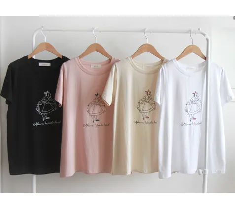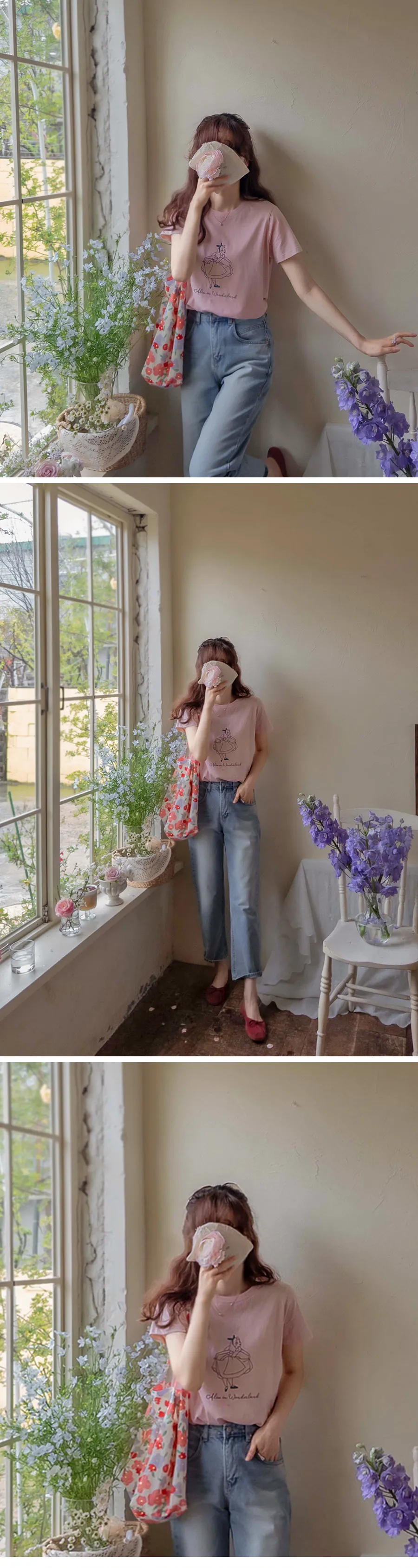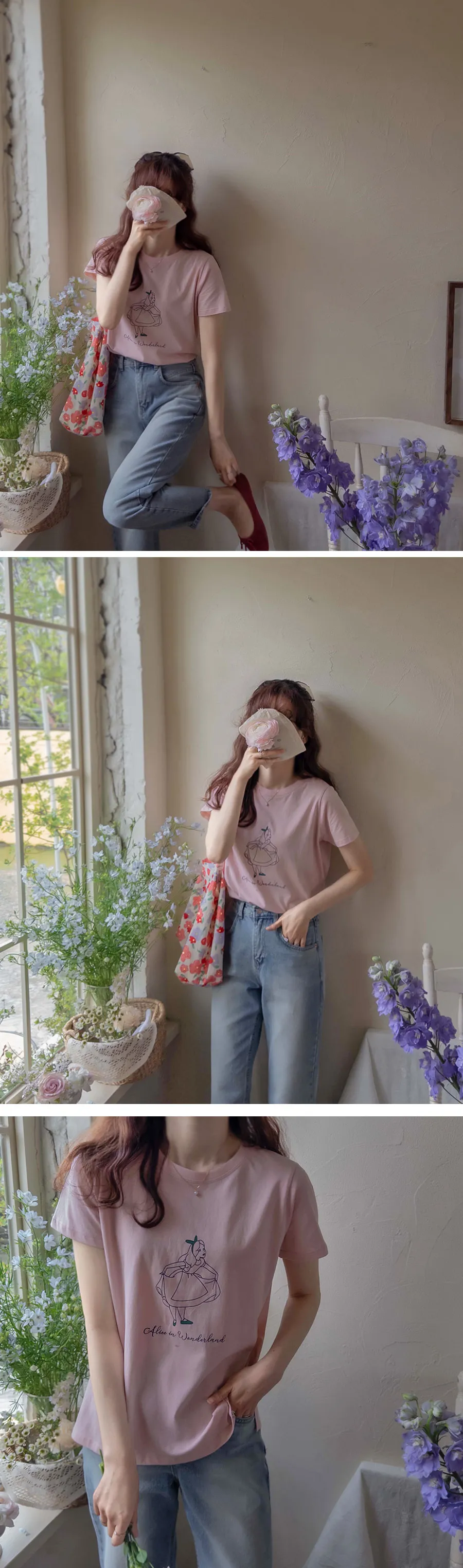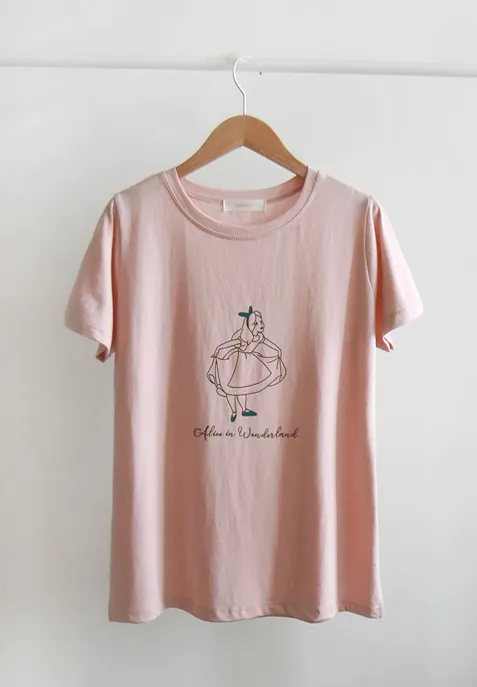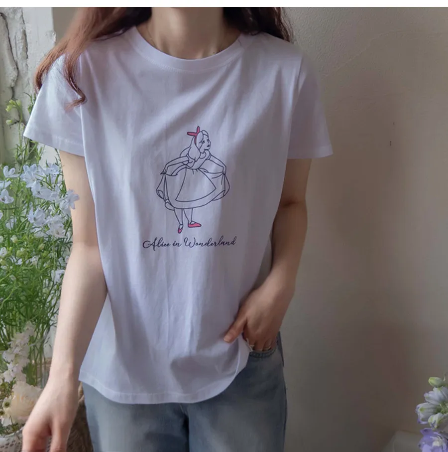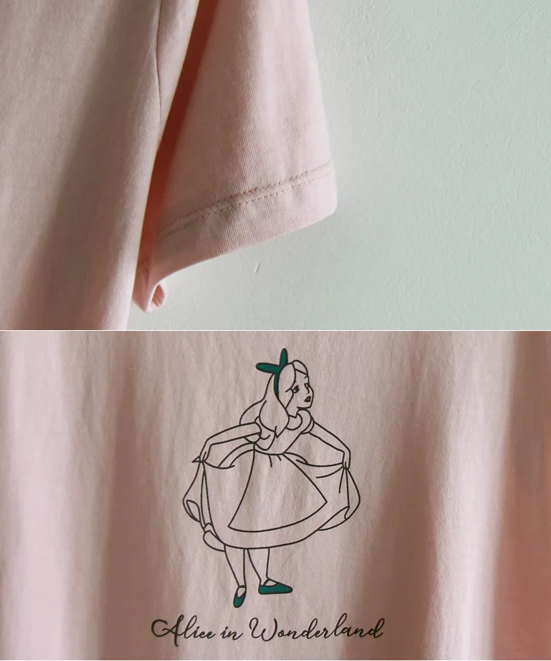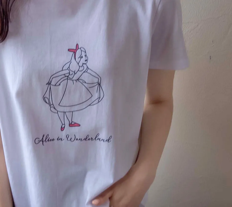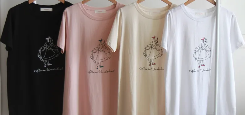 【柔和色調的T卹,穿起來很舒服】【可愛的愛麗絲印花】【可以換成不同的顏色】【印花搭配起來很活潑】【底部的開叉也很漂亮】 [從現在起整個季節都可以使用。][
