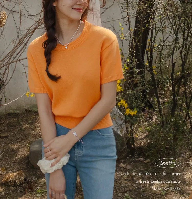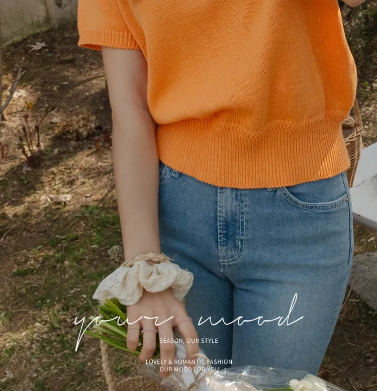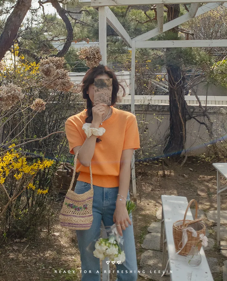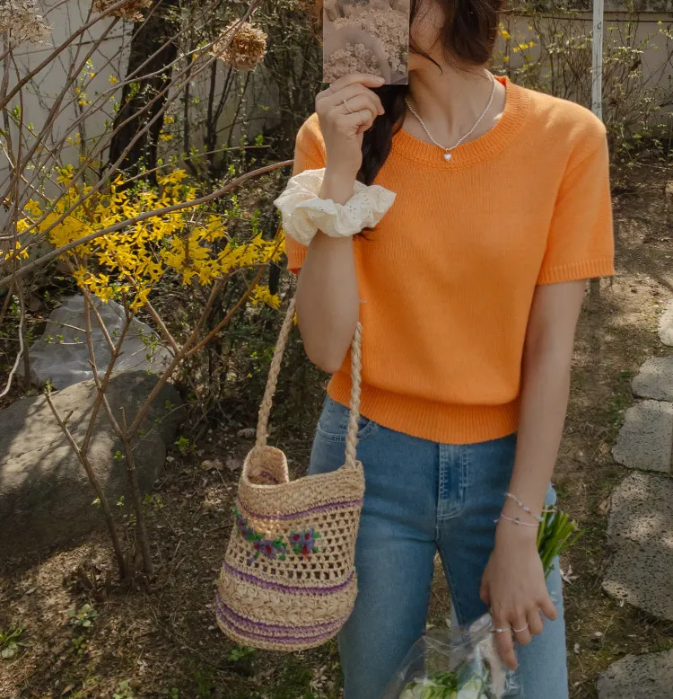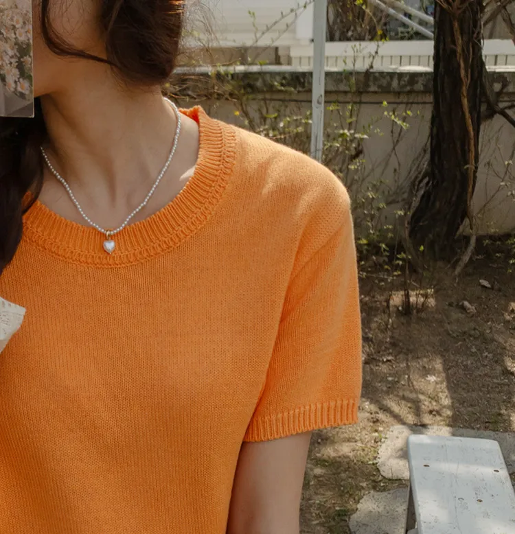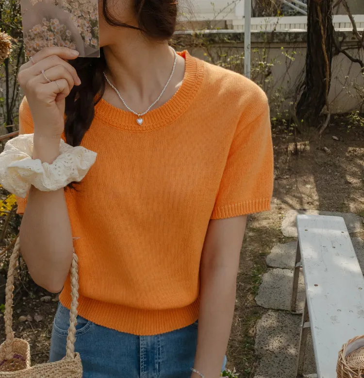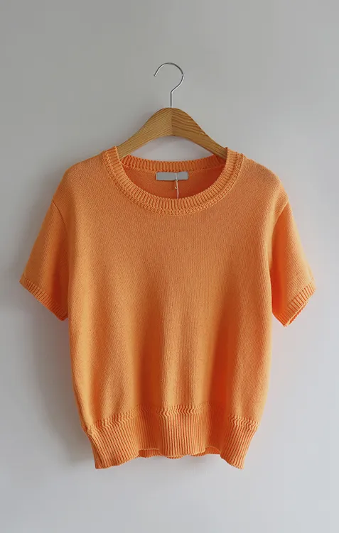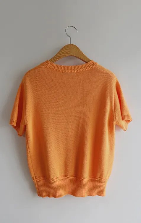 獨特收邊編織舒適短袖針織上衣 現貨橘