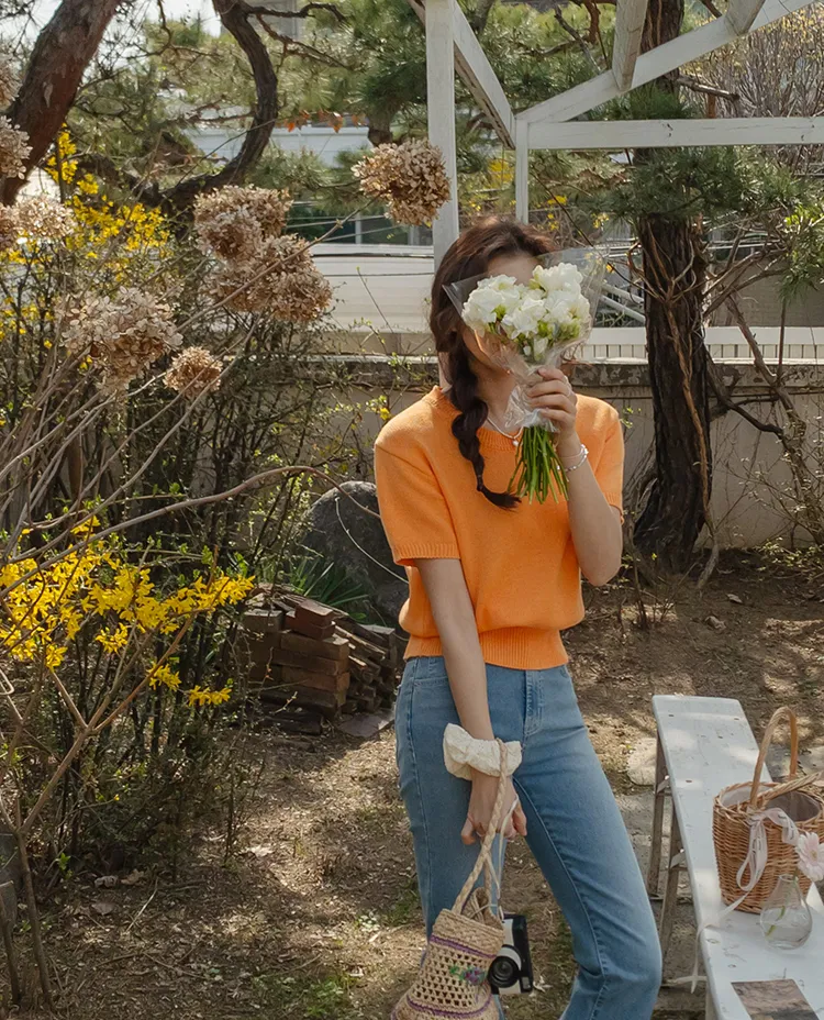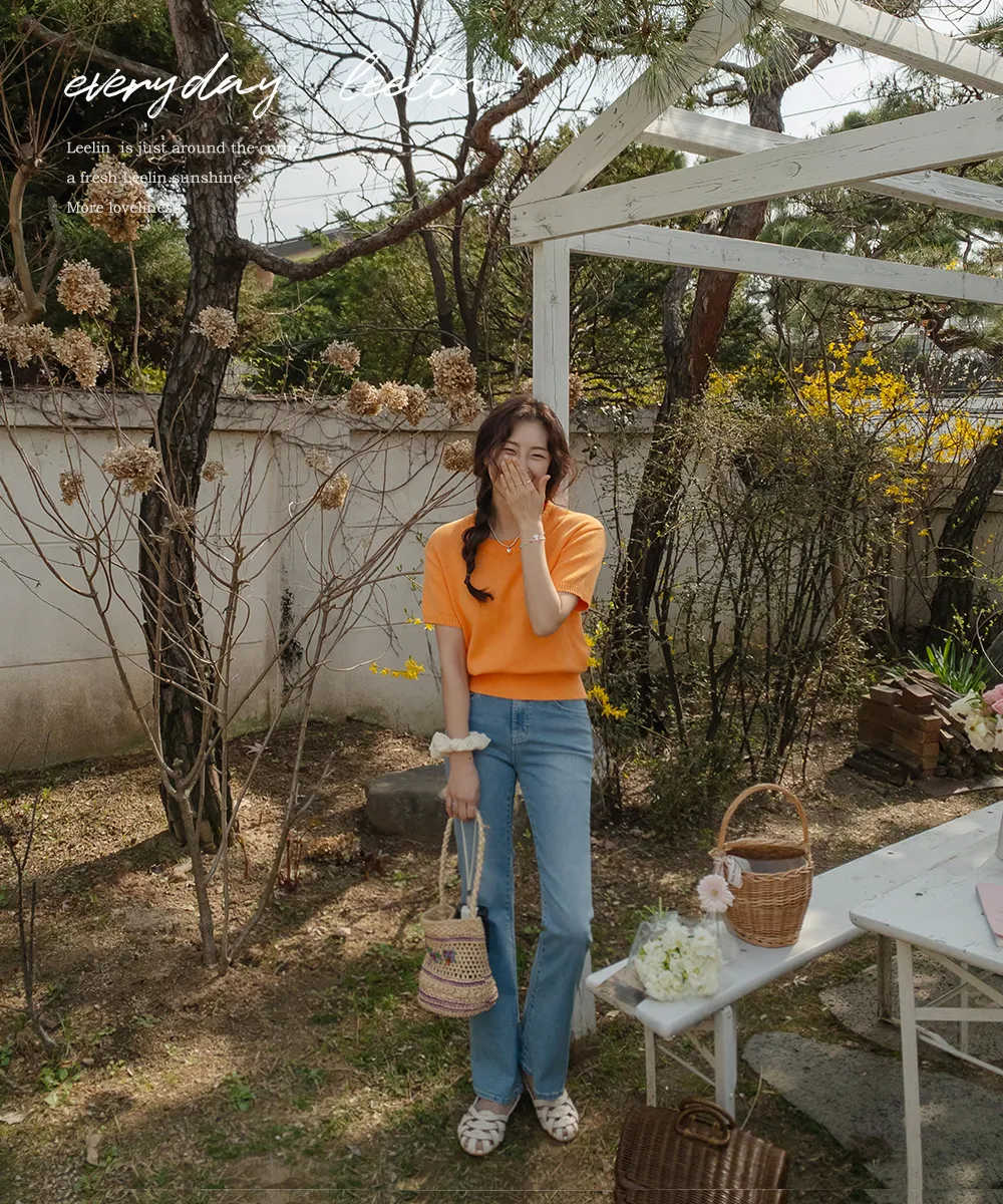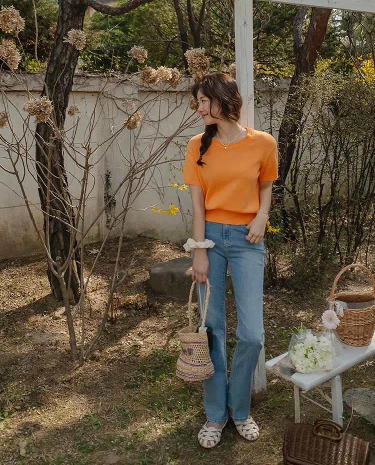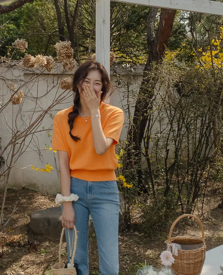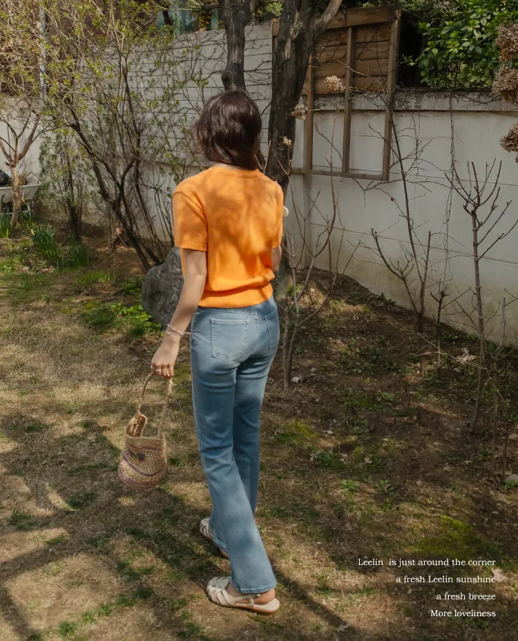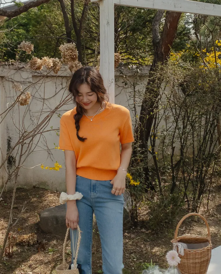獨特收邊編織舒適短袖針織上衣 現貨橘
