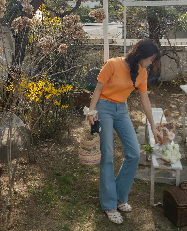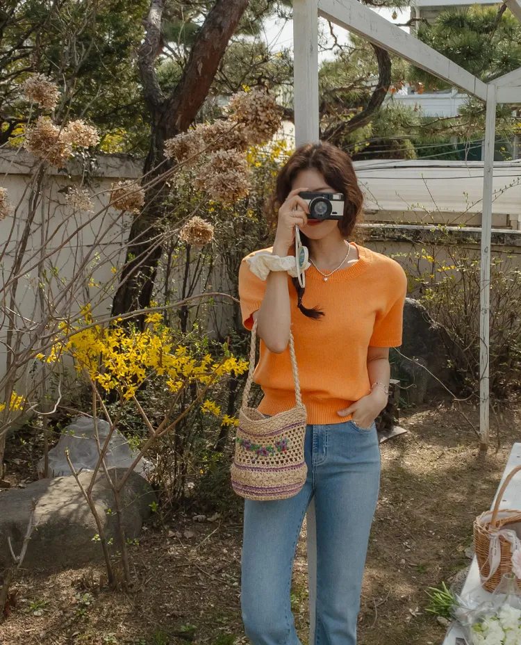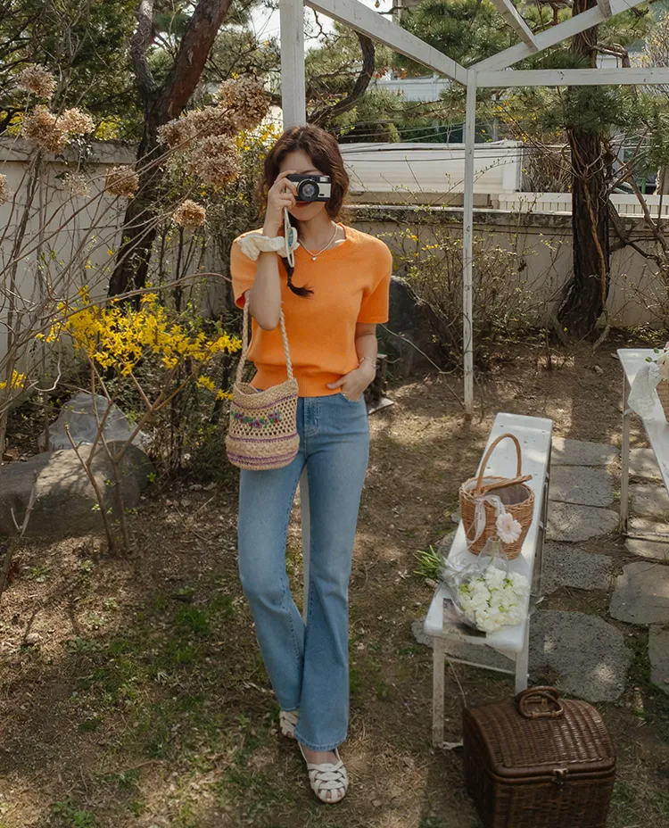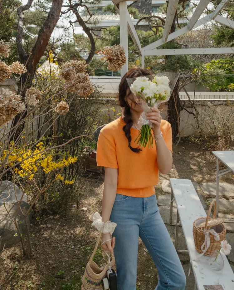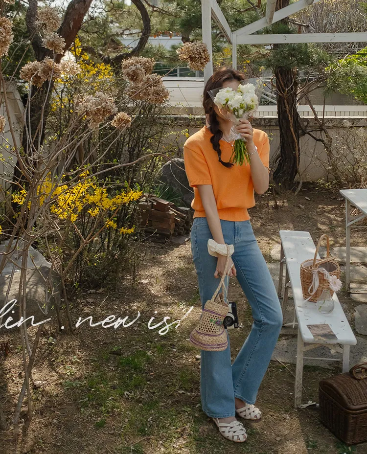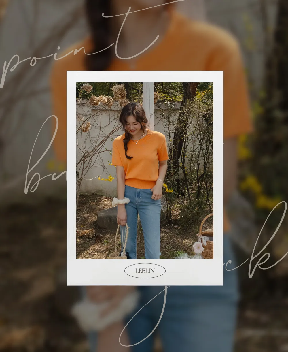 獨特收邊編織舒適短袖針織上衣 現貨橘