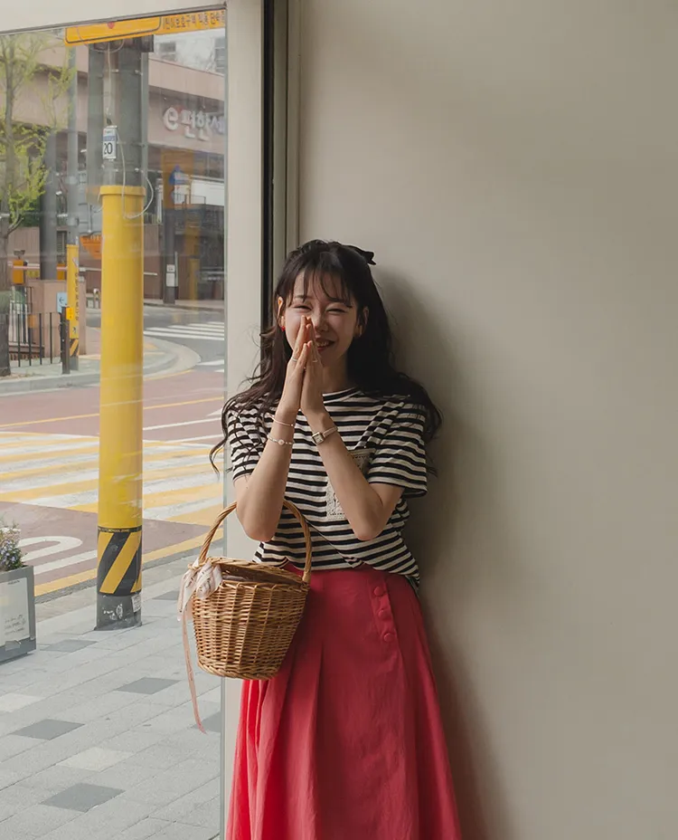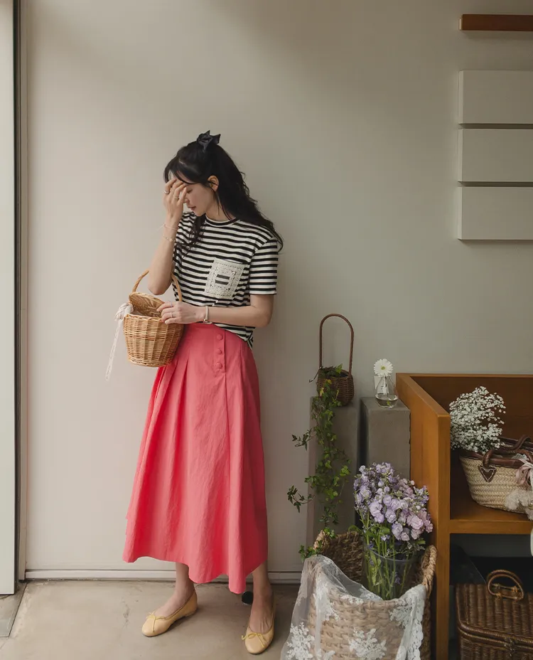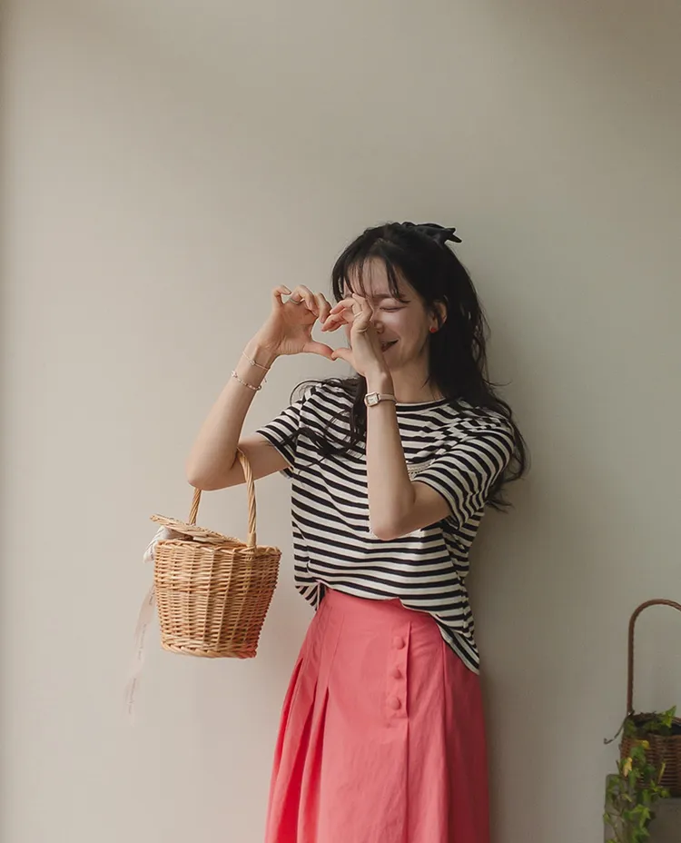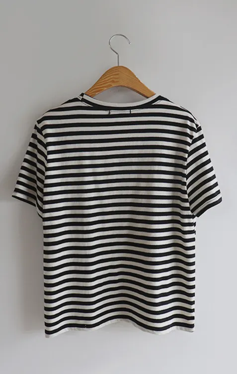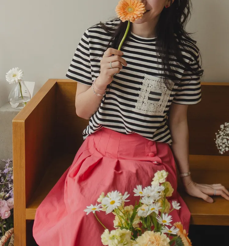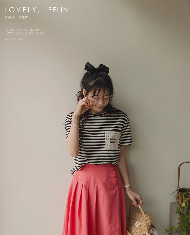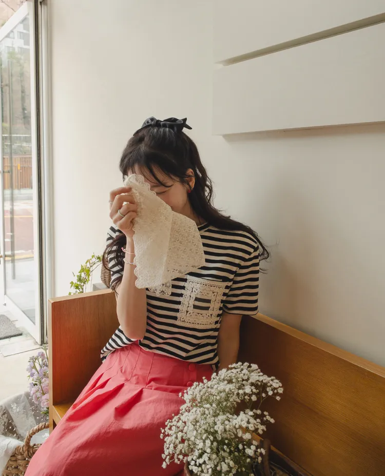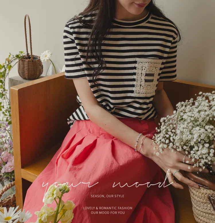 [口袋設計條紋短袖上衣♡][帶有蕾絲的可愛方形口袋,增添女性氣息!!][柔軟觸感][穿著舒適!!]