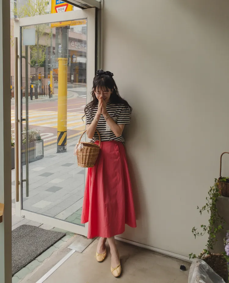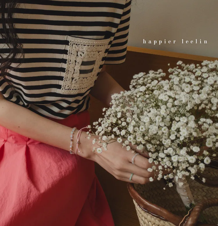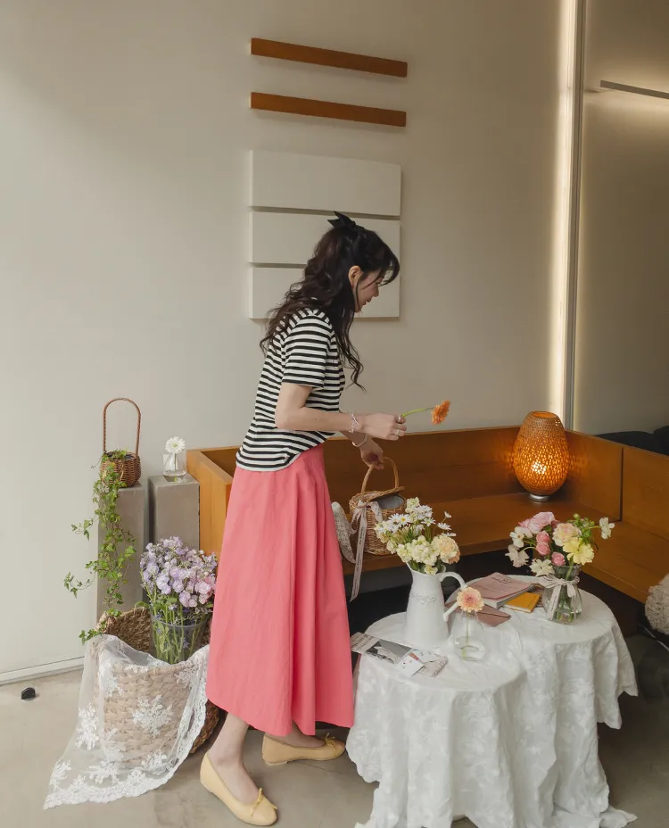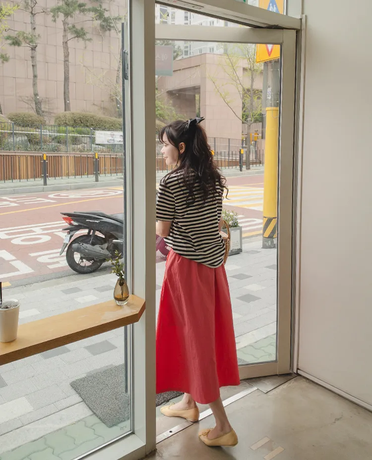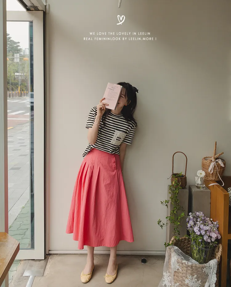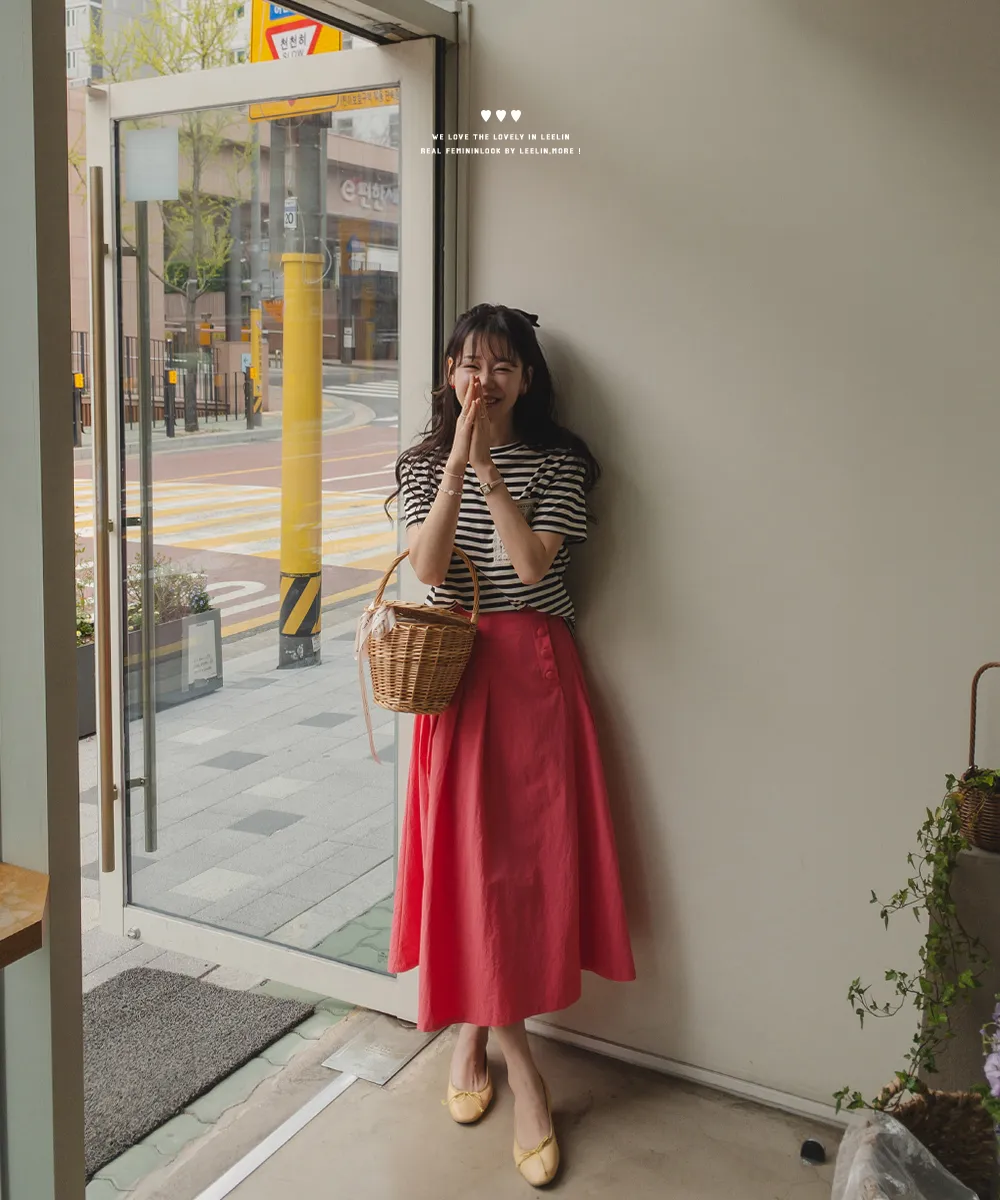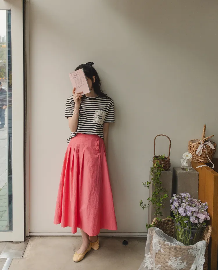 [口袋設計條紋短袖上衣♡][帶有蕾絲的可愛方形口袋,增添女性氣息!!][柔軟觸感][穿著舒適!!]