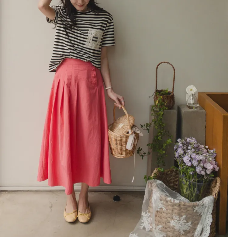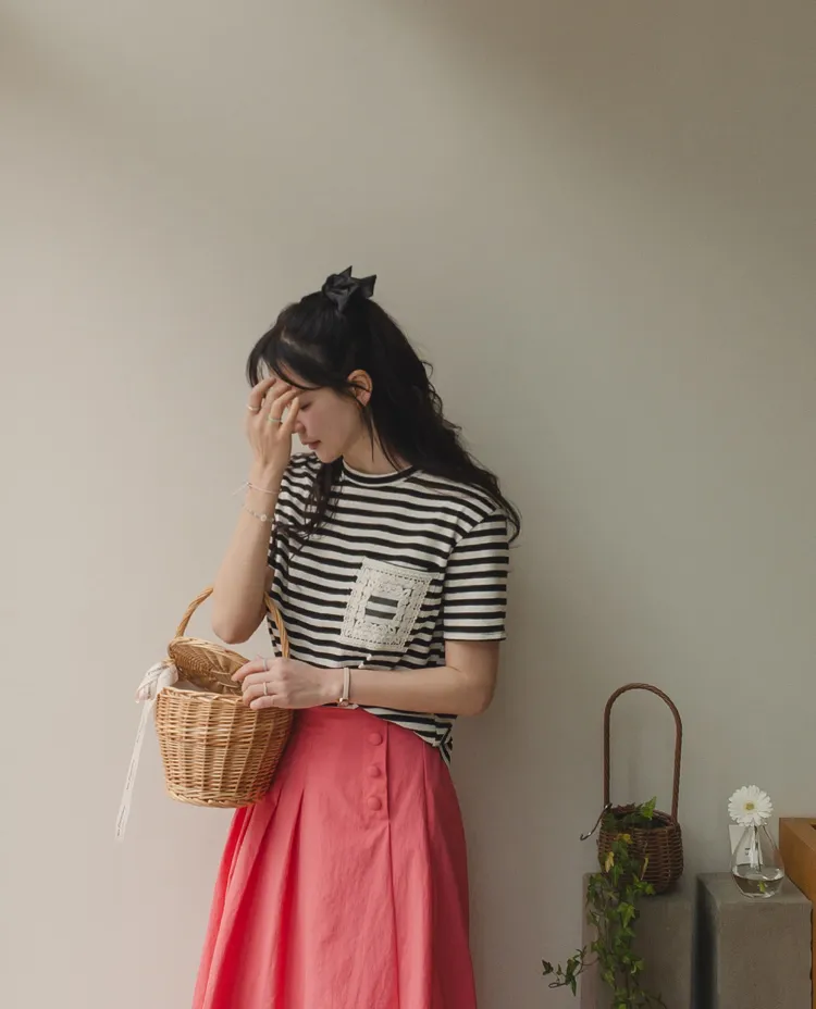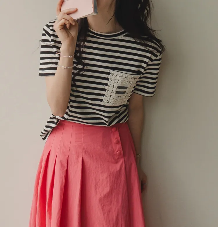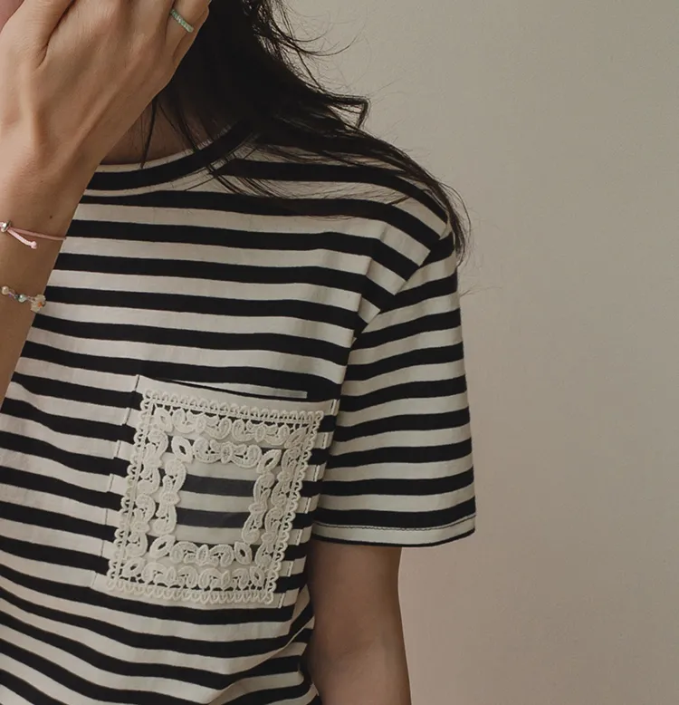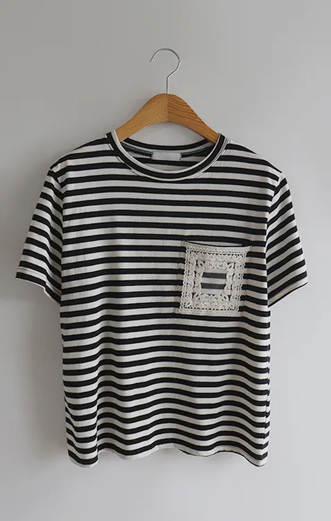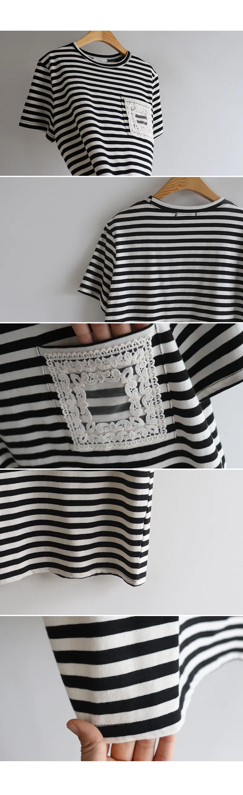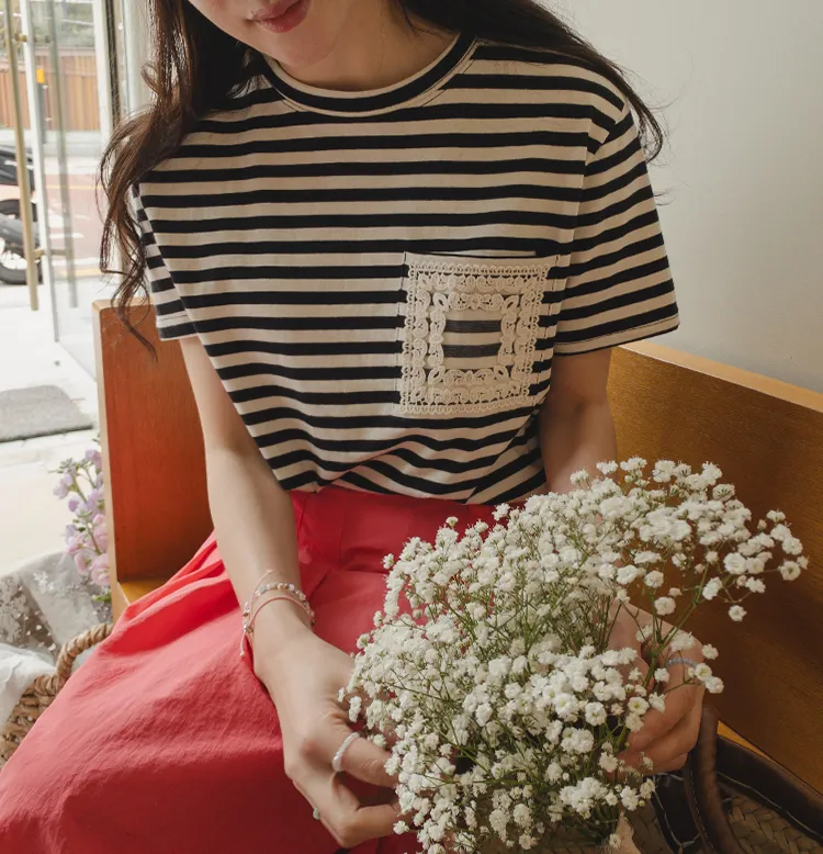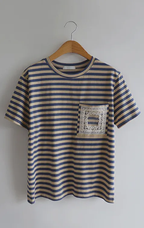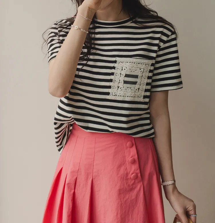 可愛方領蕾絲口袋設計條紋短袖上衣