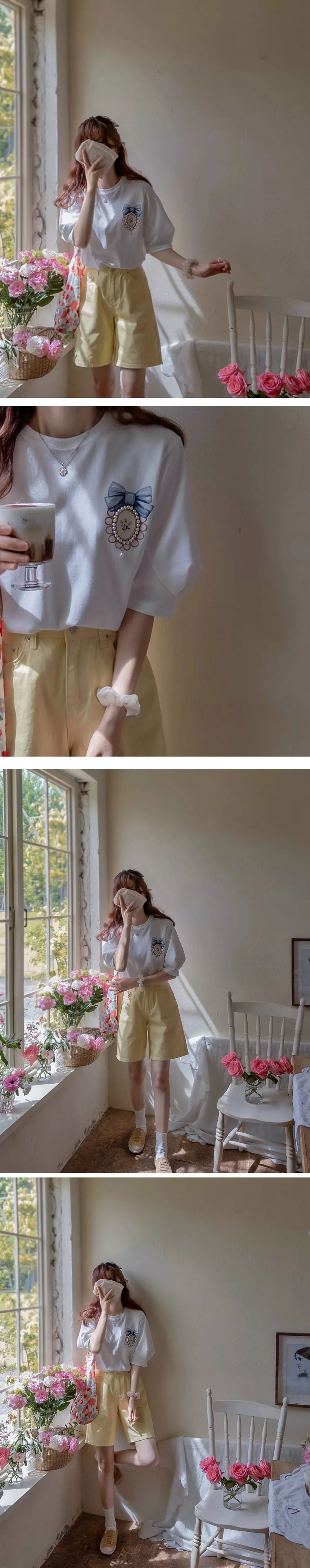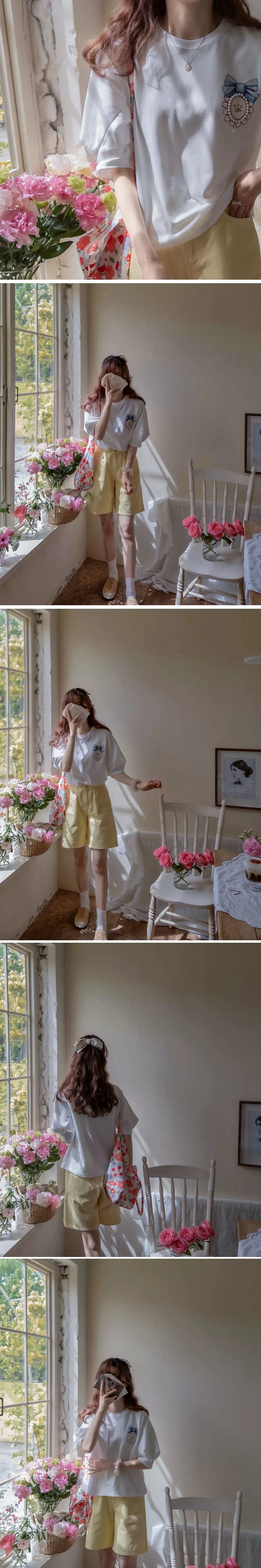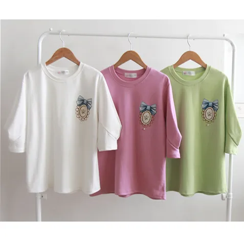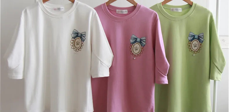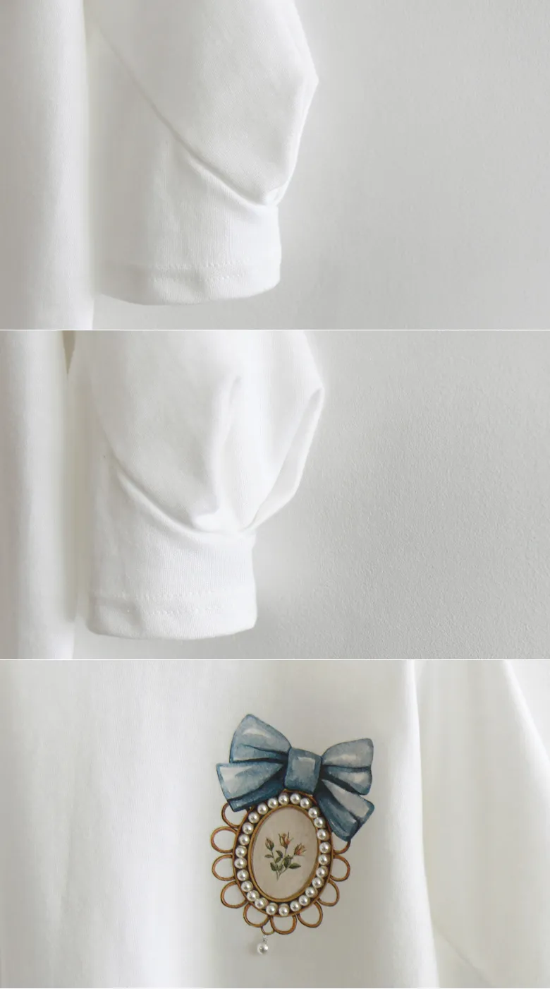 【胸針的立體珍珠裝飾】【給人清新感的顏色】【珍珠胸針和絲帶印花的上衣】【袖子很漂亮,獨特的寬鬆造型】【充滿愉快氛圍,從現在開始一直到夏天都可以穿搭