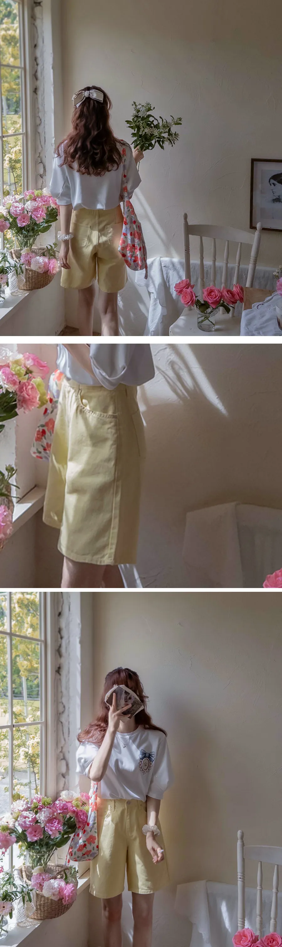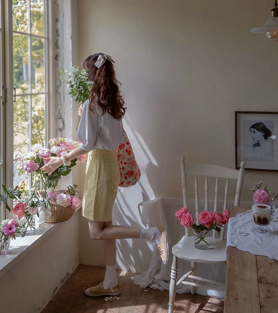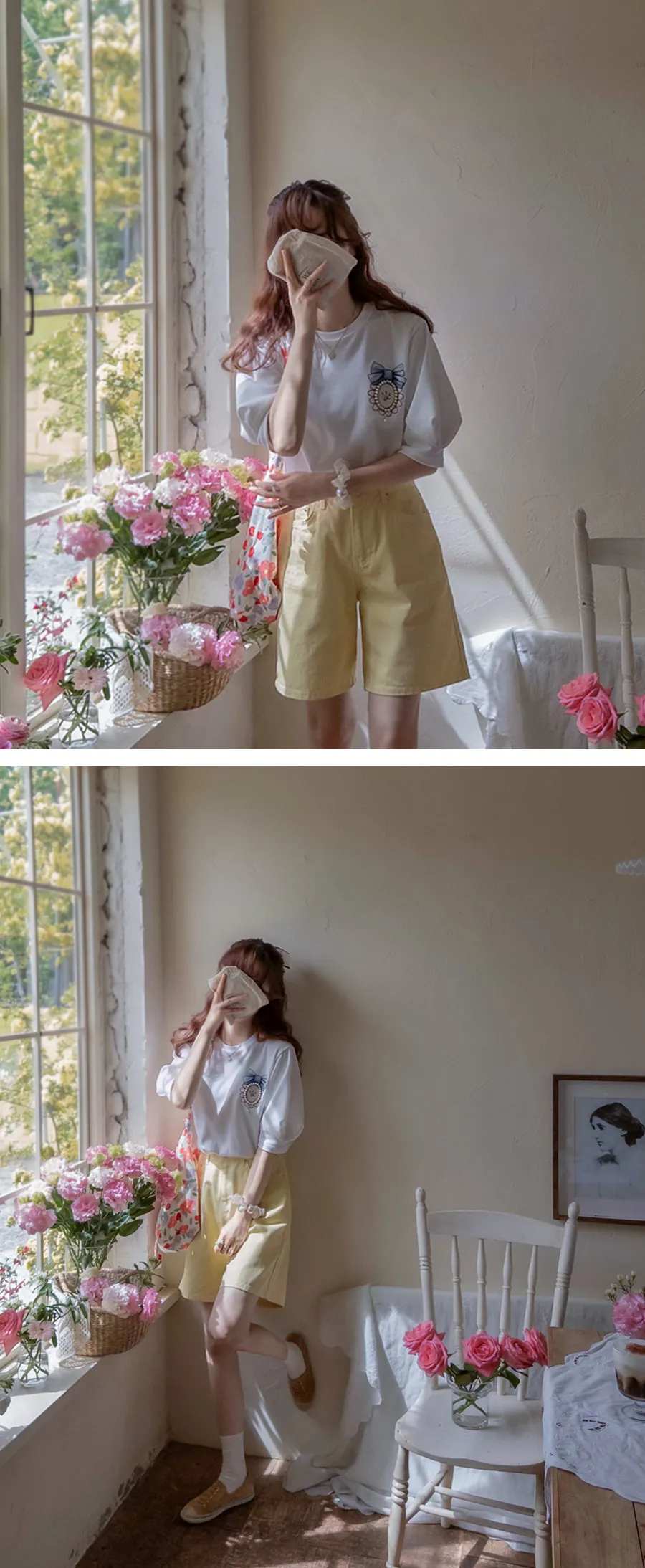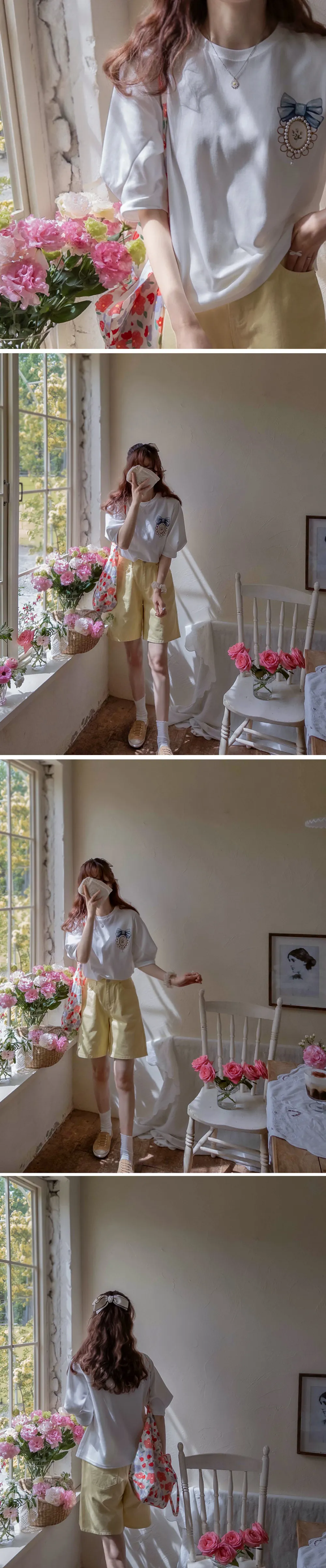 【胸針的立體珍珠裝飾】【給人清新感的顏色】【珍珠胸針和絲帶印花的上衣】【袖子很漂亮,獨特的寬鬆造型】【充滿愉快氛圍,從現在開始一直到夏天都可以穿搭