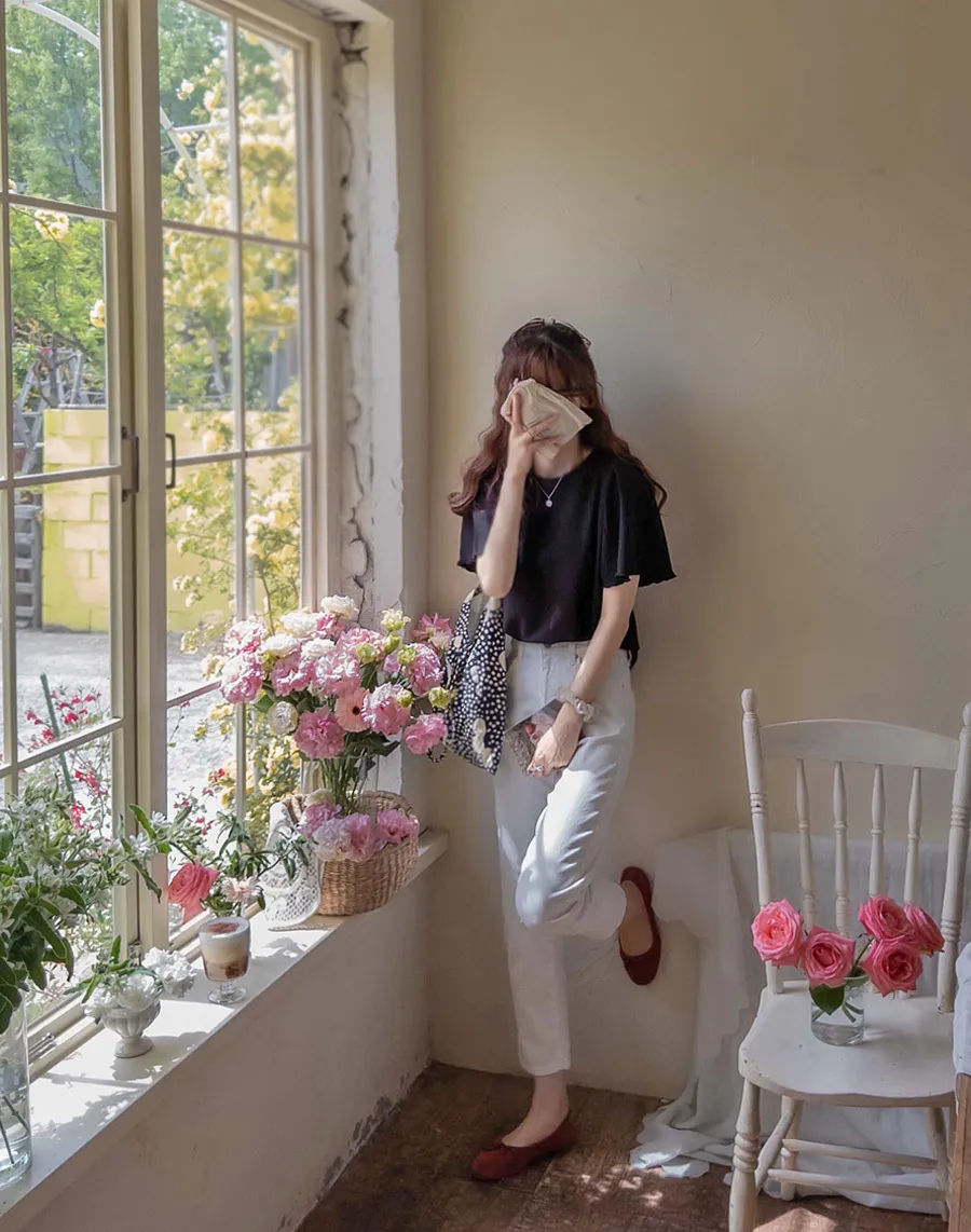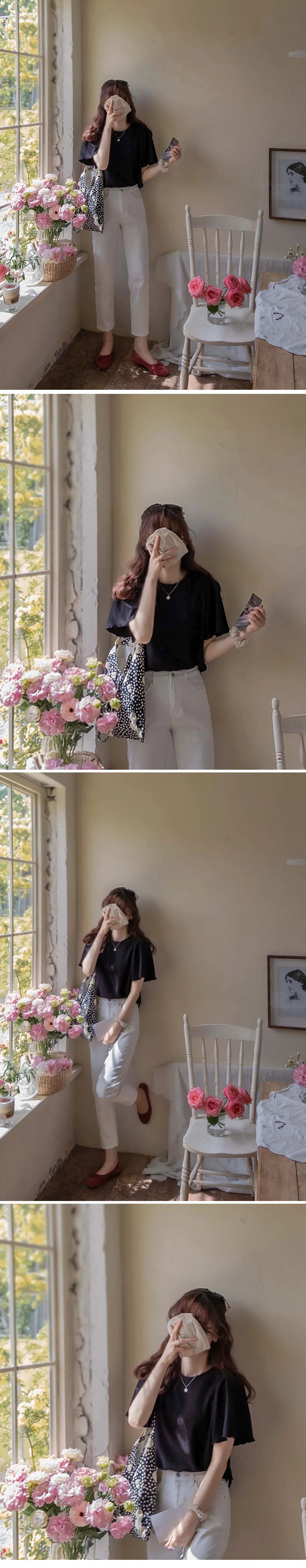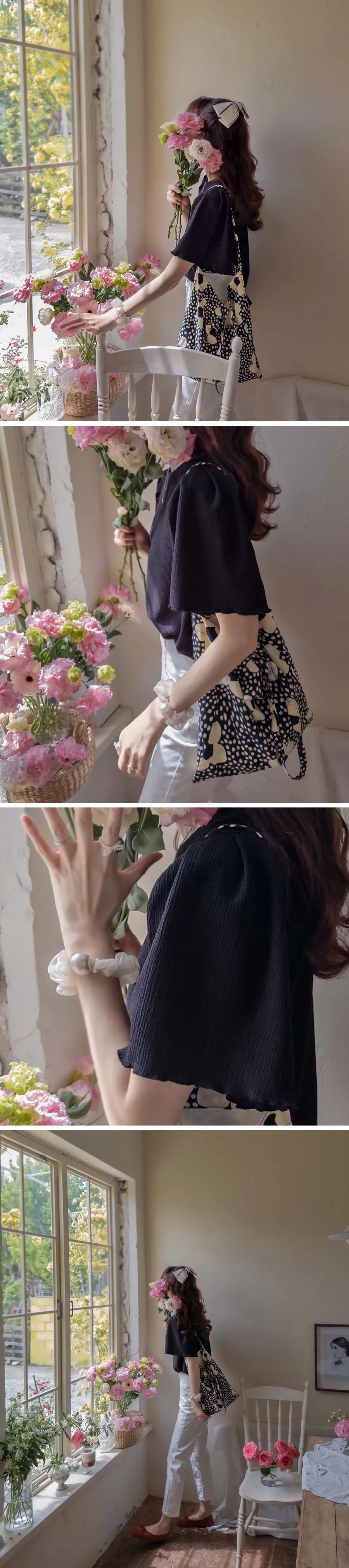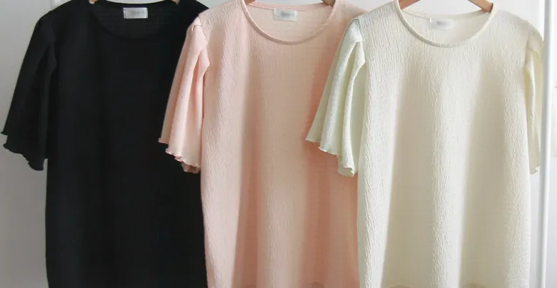 【清新感上衣,不用擔心褶皺】【輕盈透氣的感覺,還具有3%氨綸彈性】【肩部剪裁的袖子也很漂亮】【遮住手臂】【風格升級