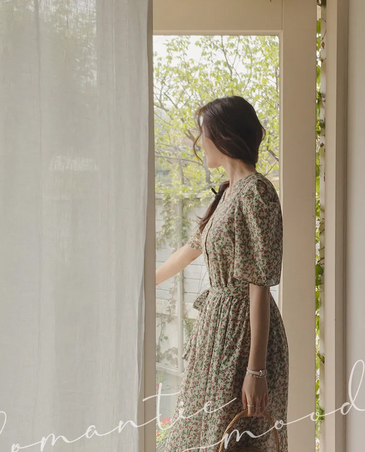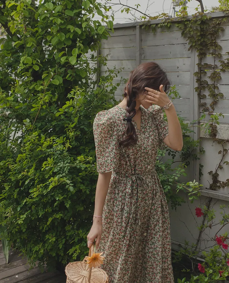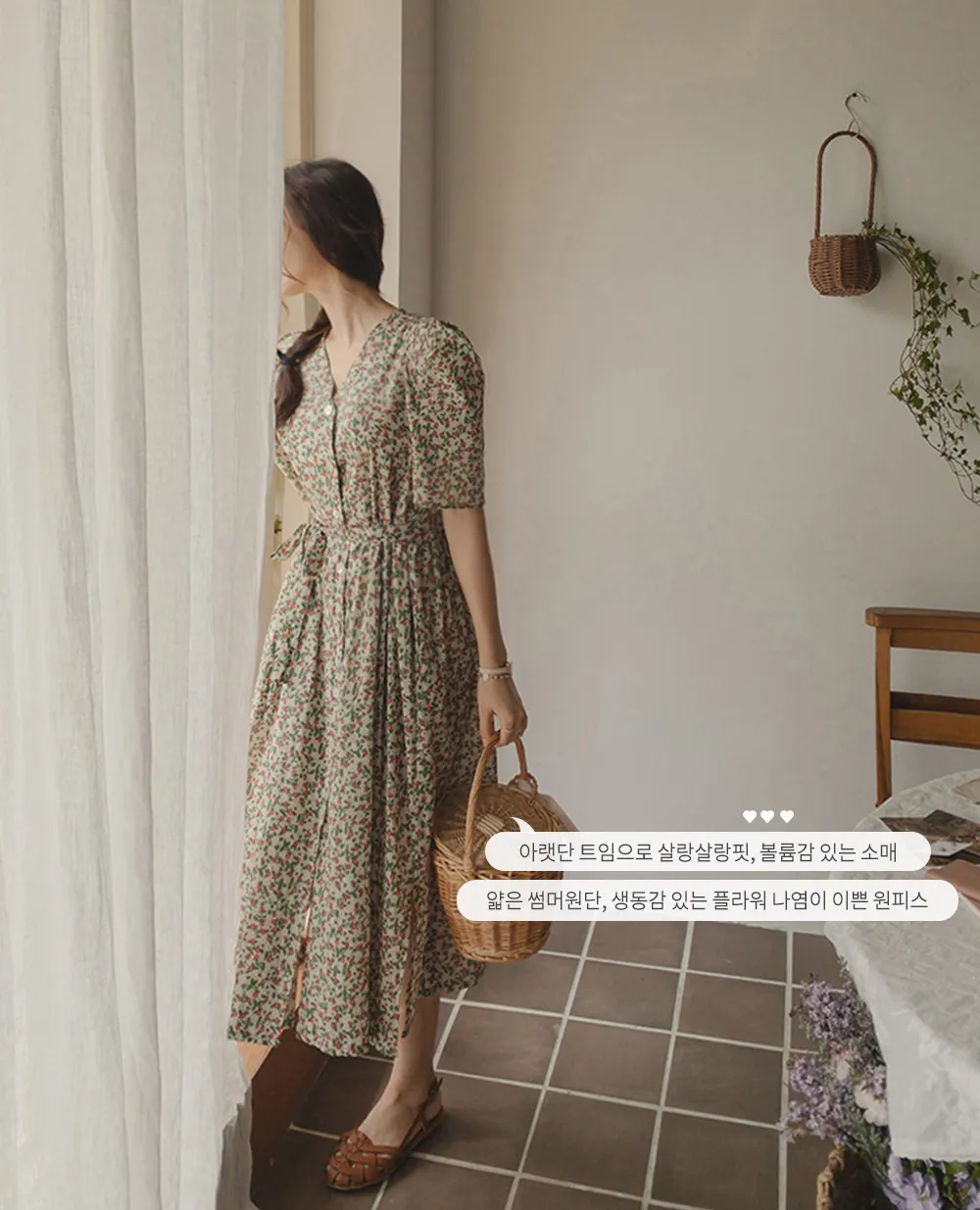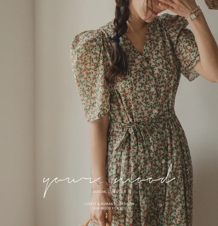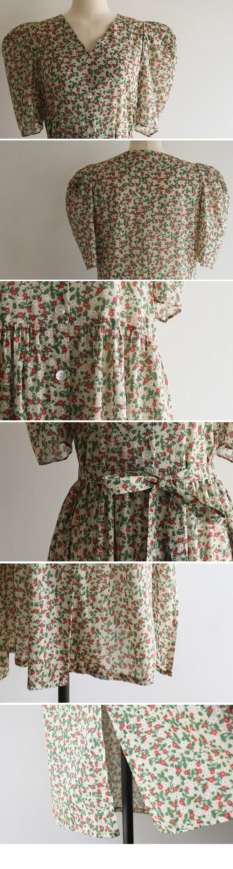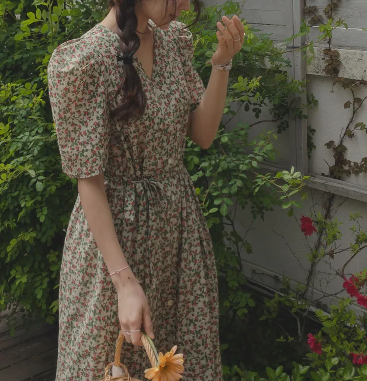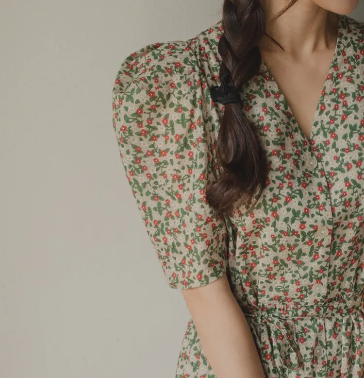浪漫小花V領排扣泡泡袖連身裙 米色