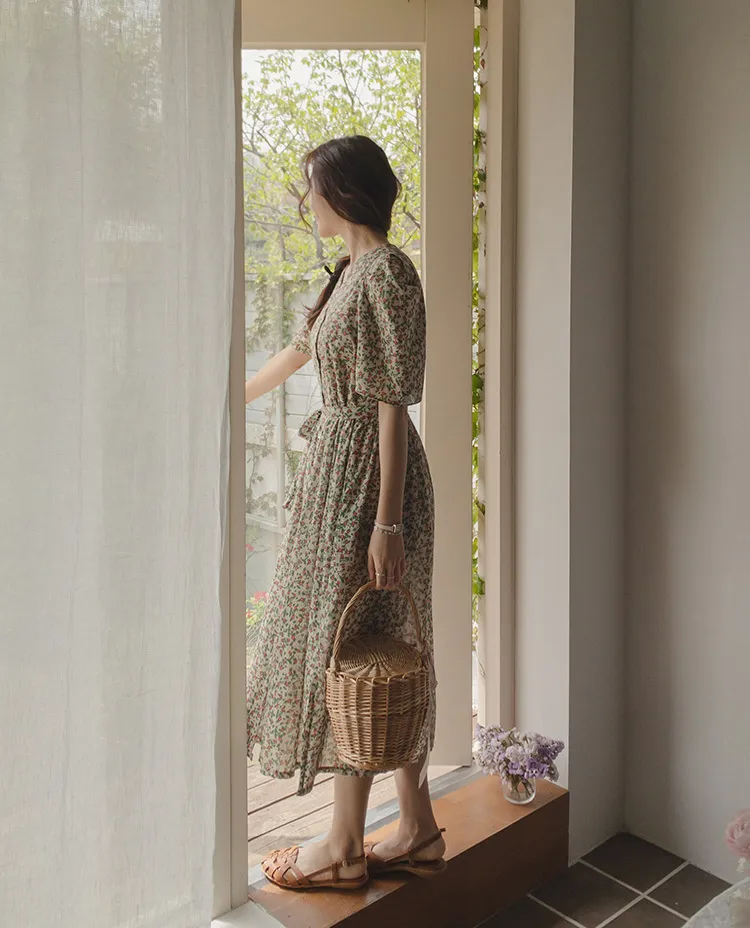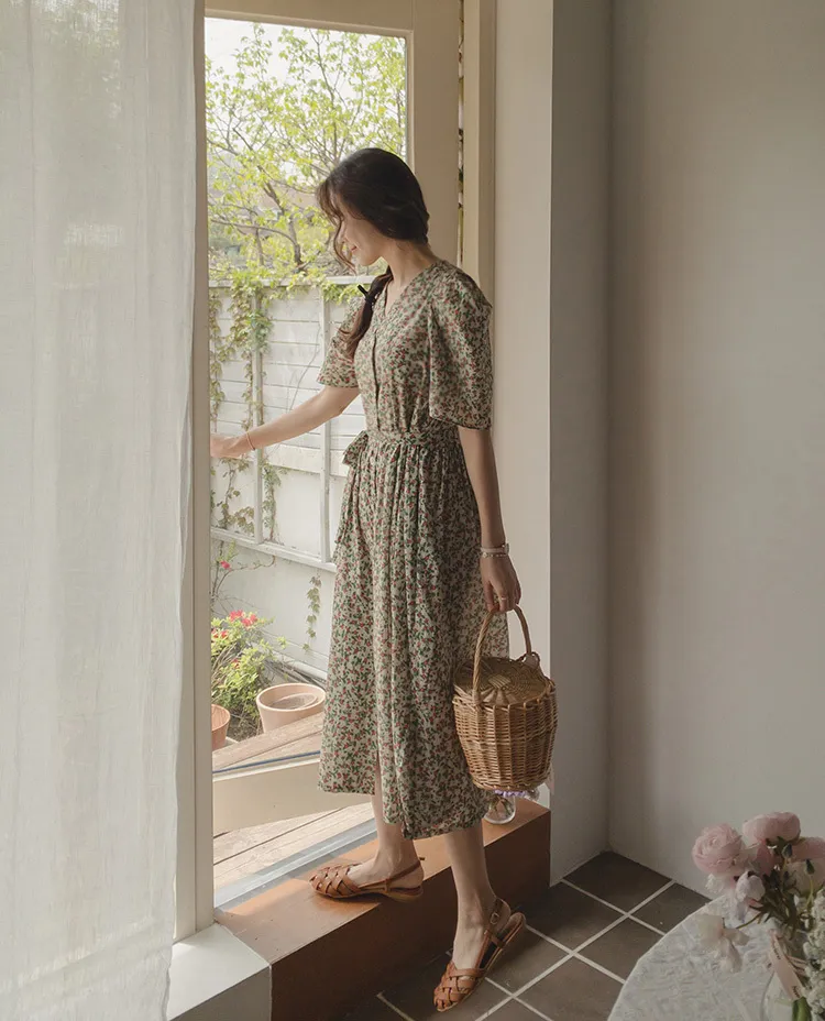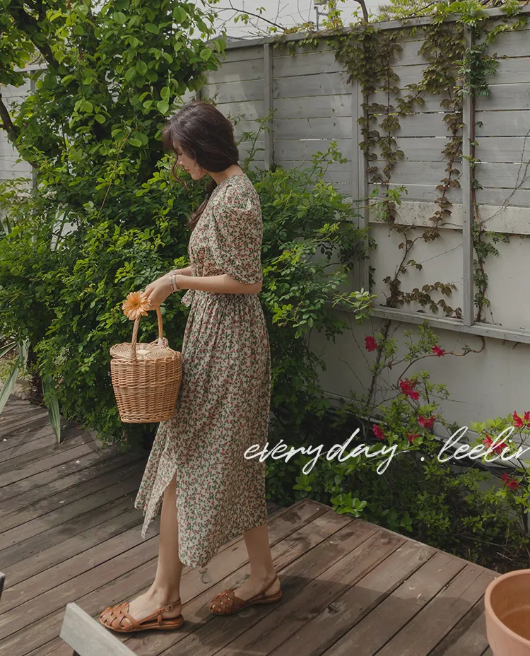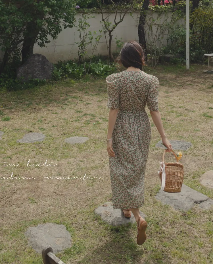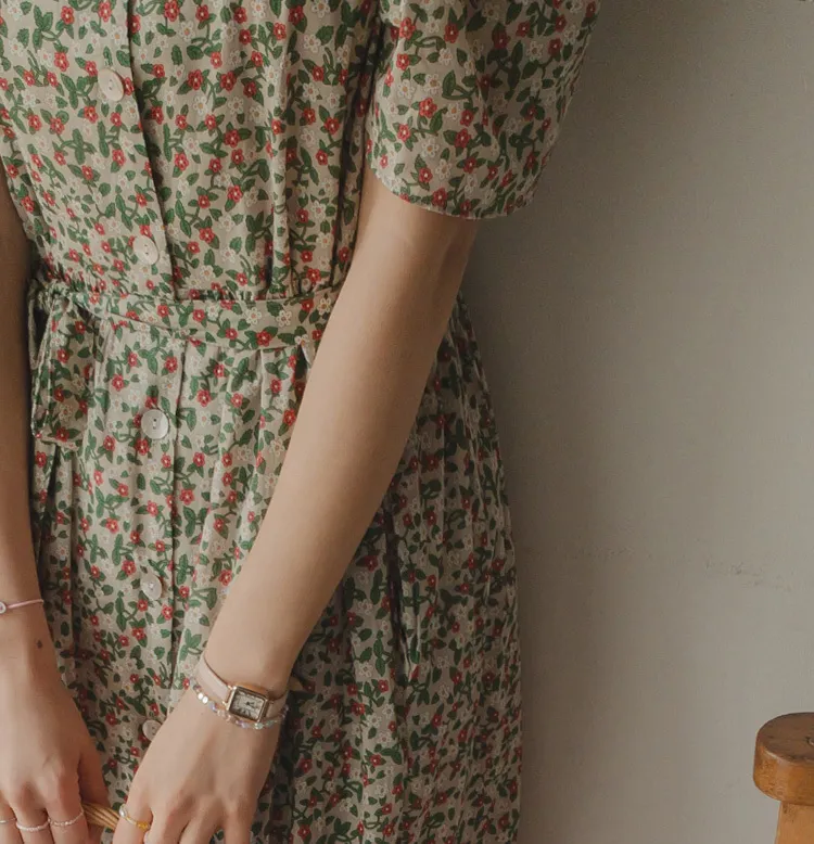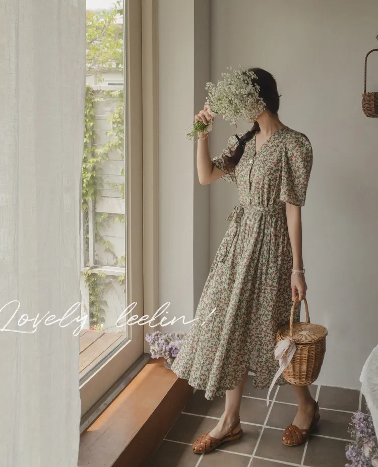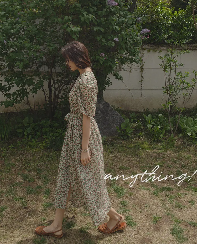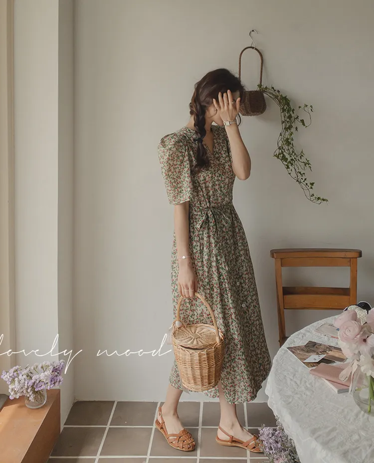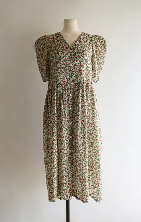 浪漫小花V領排扣泡泡袖連身裙 米色