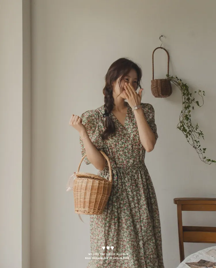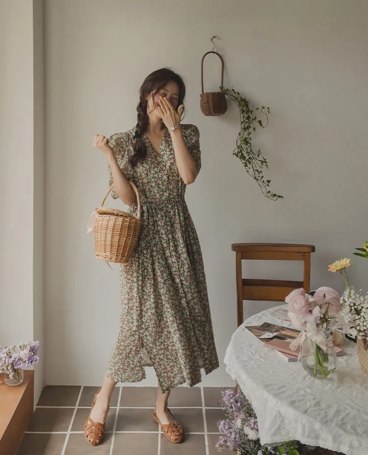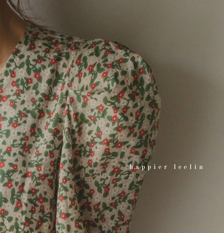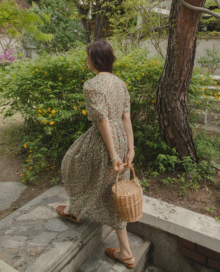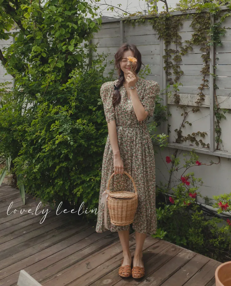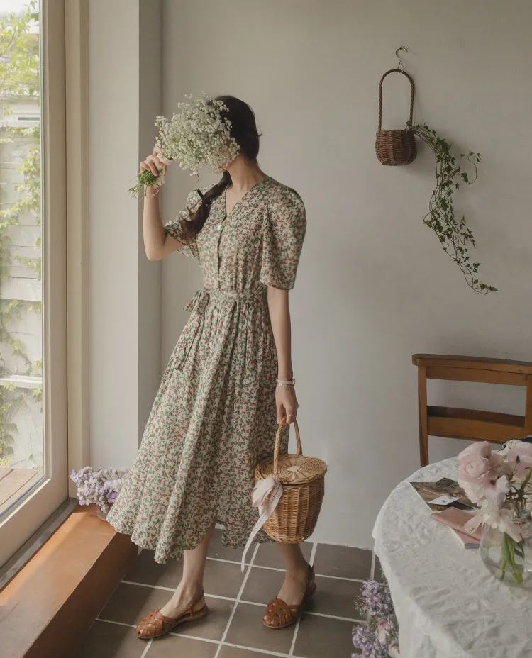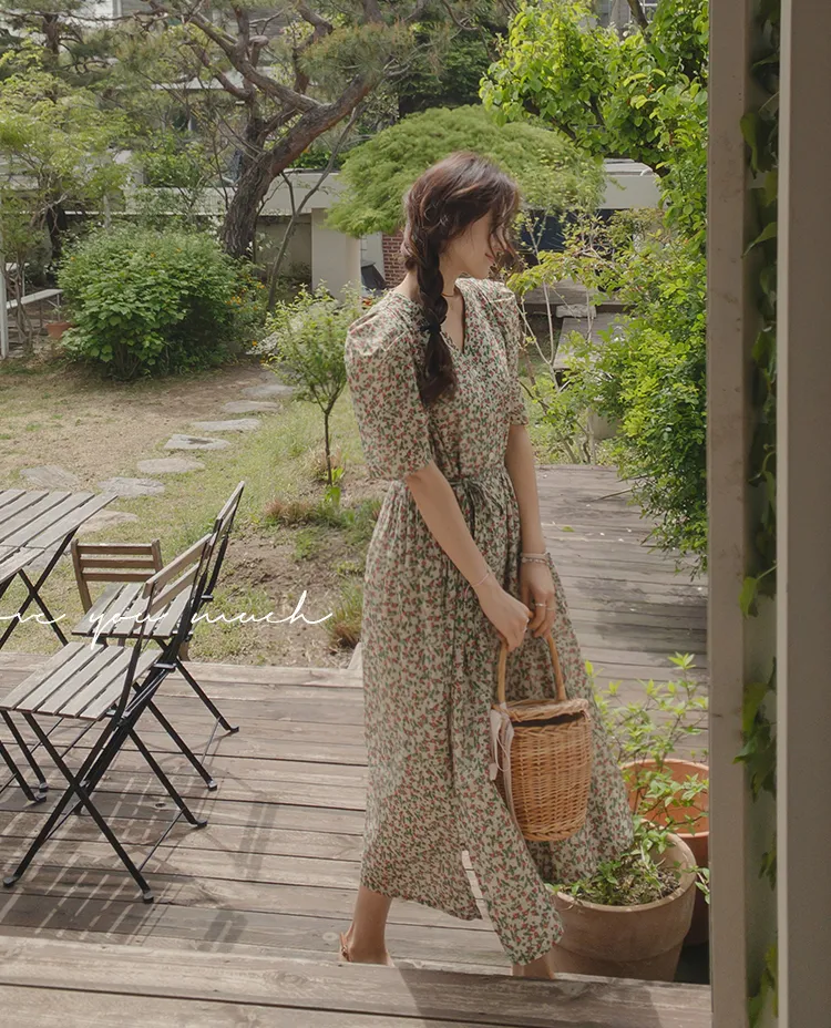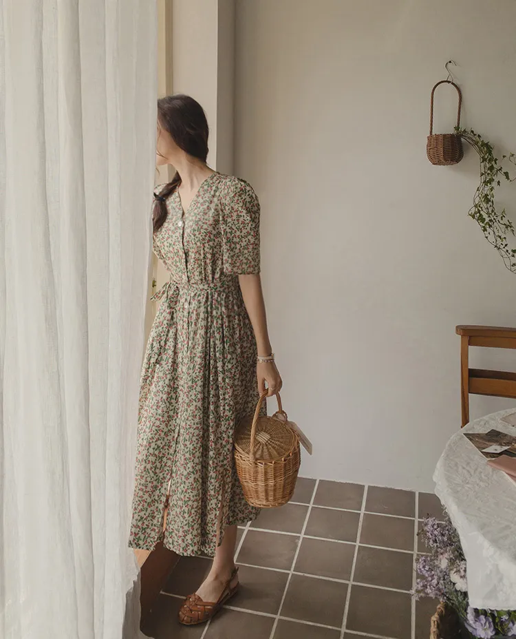 浪漫小花V領排扣泡泡袖連身裙 米色