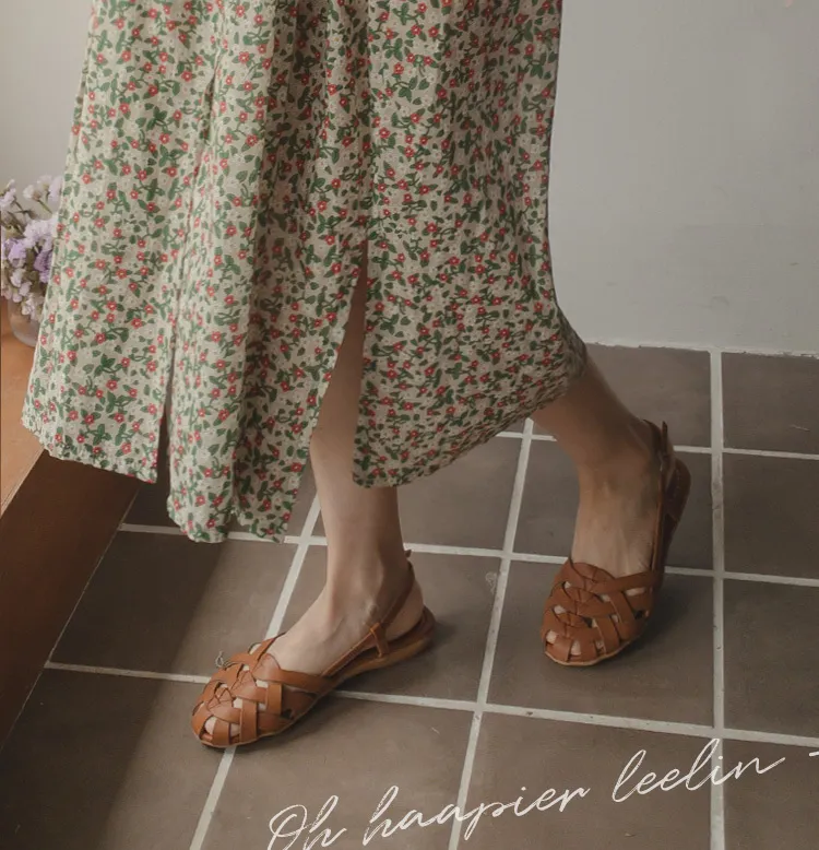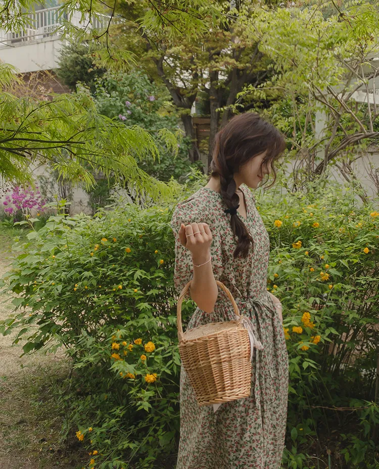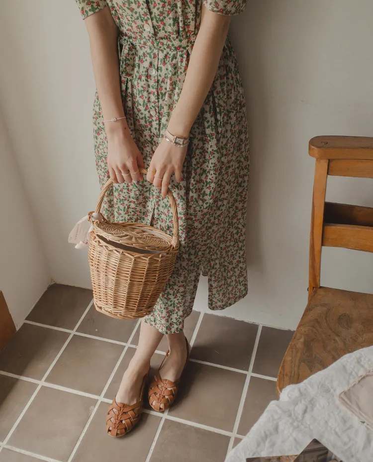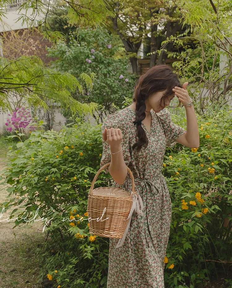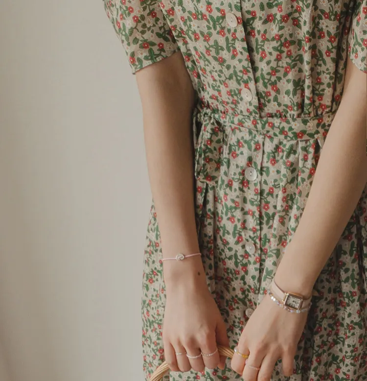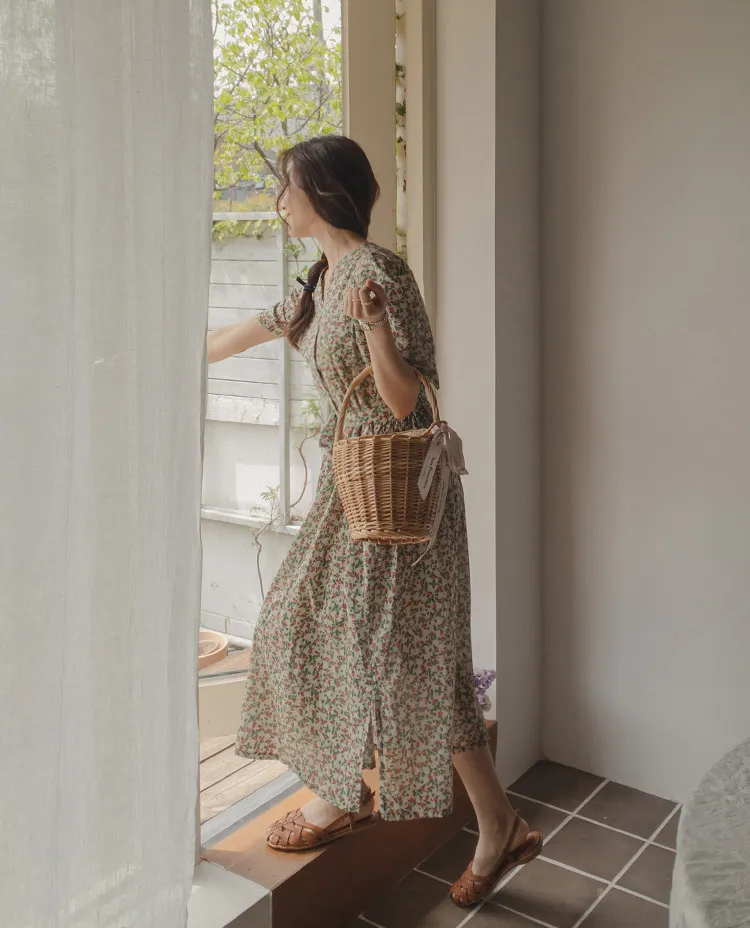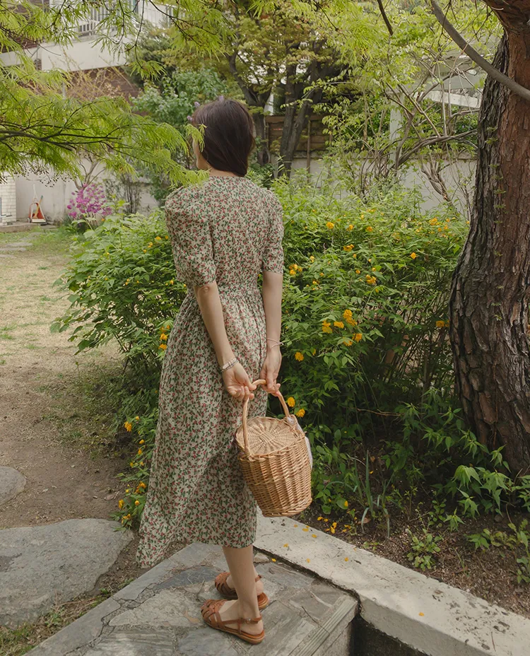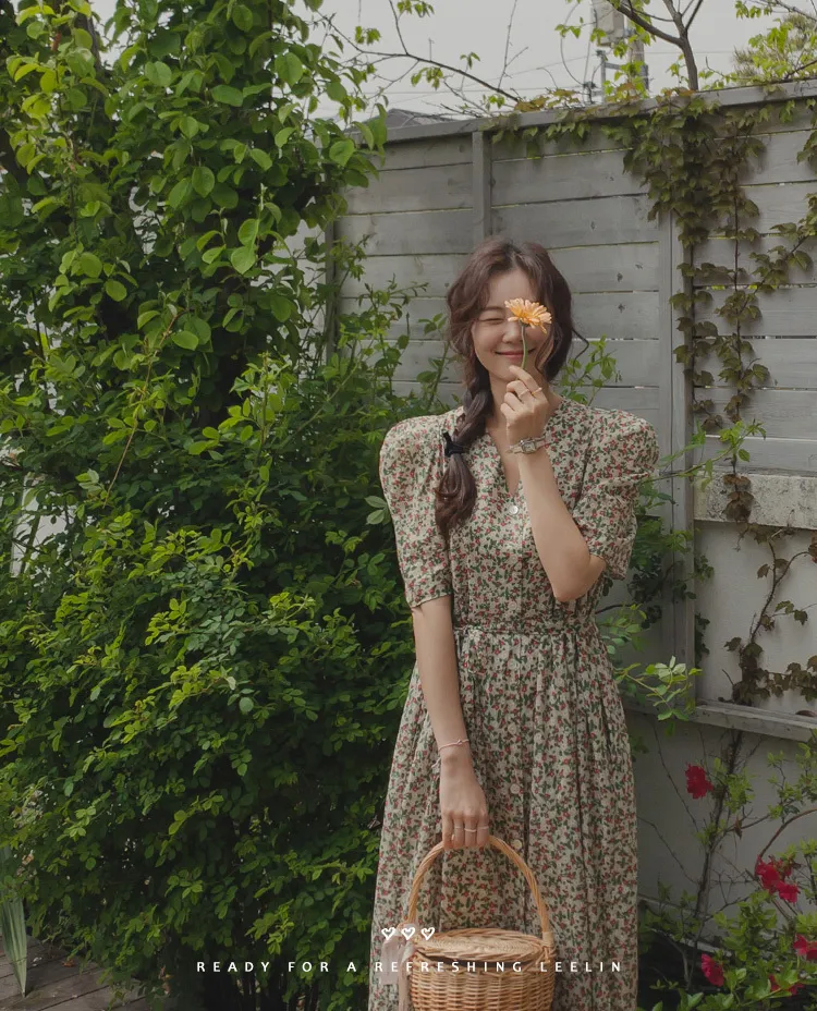 浪漫小花V領排扣泡泡袖連身裙 米色