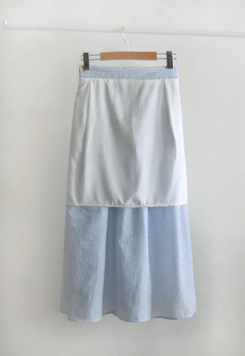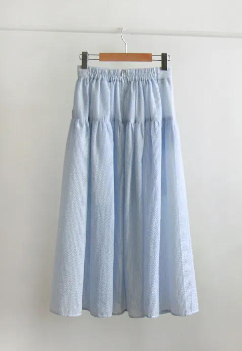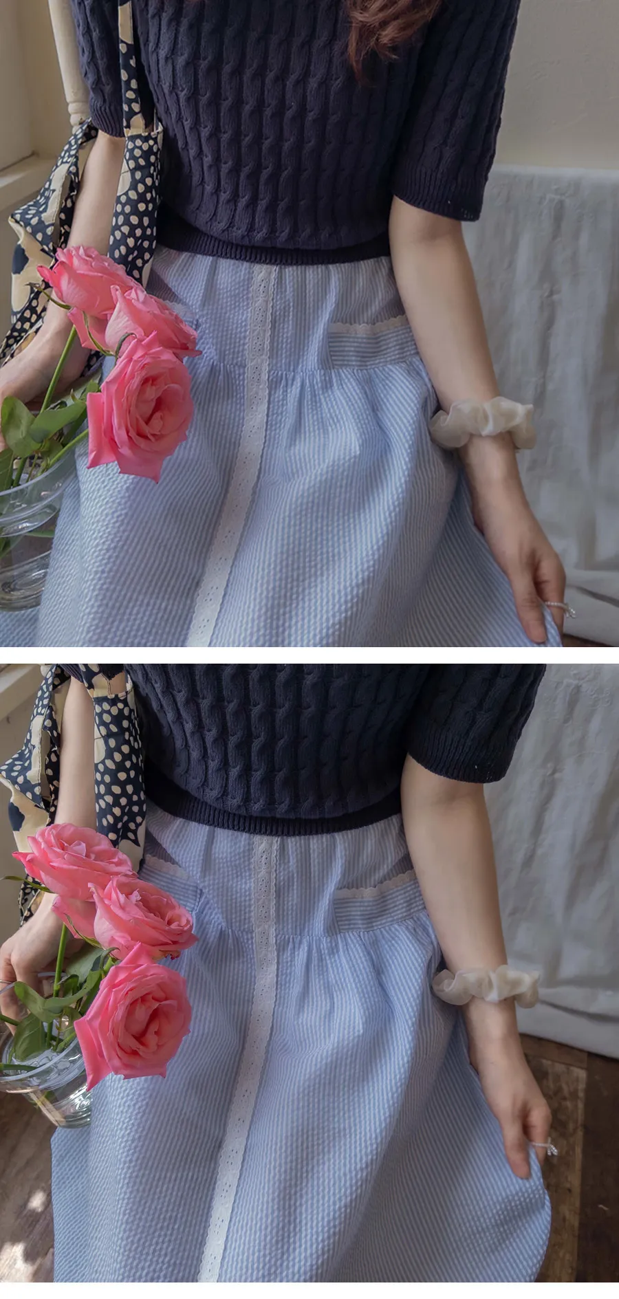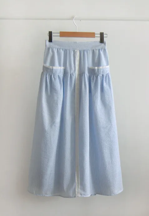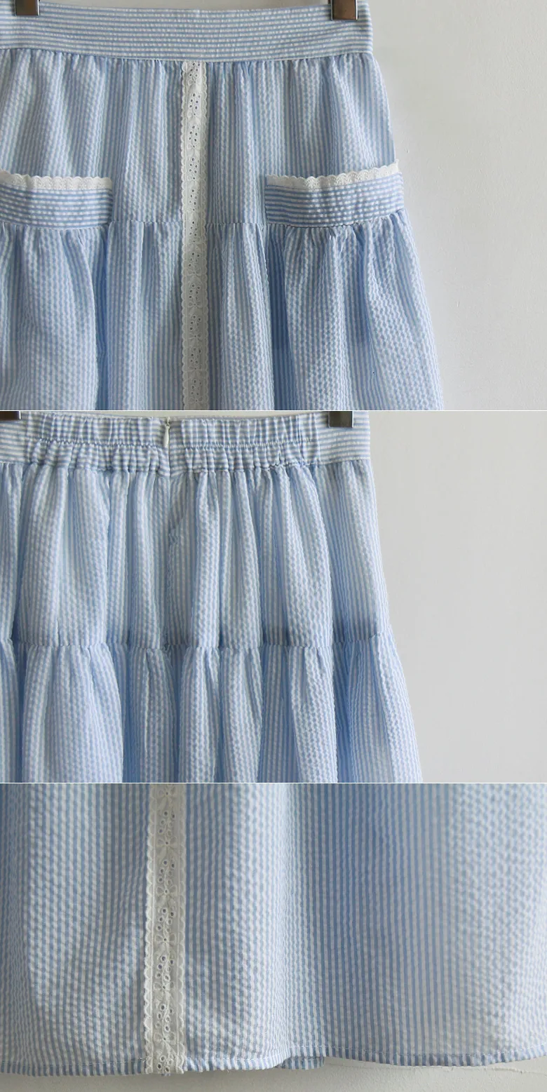 [聚酯纖維襯裡] [腰後部的帶子處理] [後拉鍊結構] [條紋圖案帶來歡快的感覺] [帶有波浪蕾絲裝飾的口袋很漂亮] [不用擔心皺紋] [結構有微妙的剪裁褶皺][邊緣合身的裙子從現在到夏天]