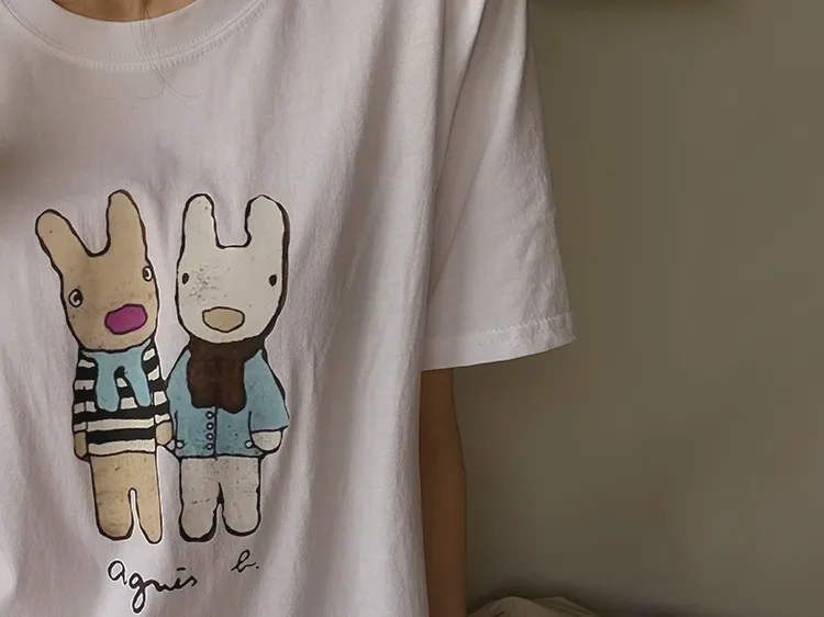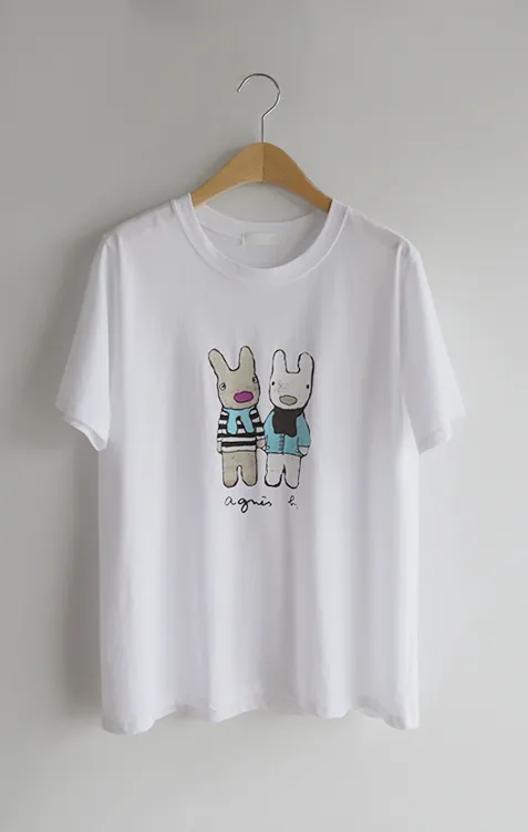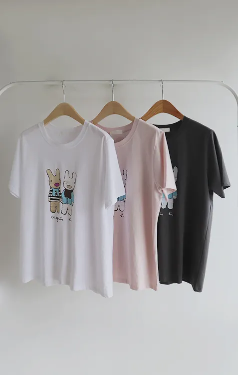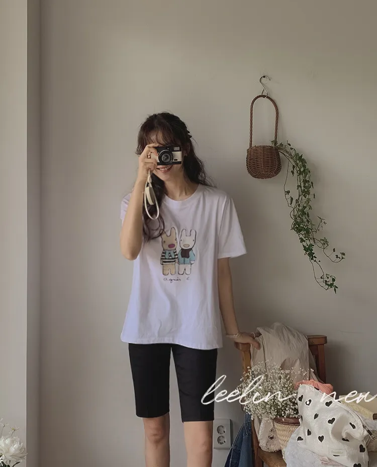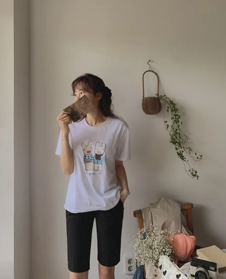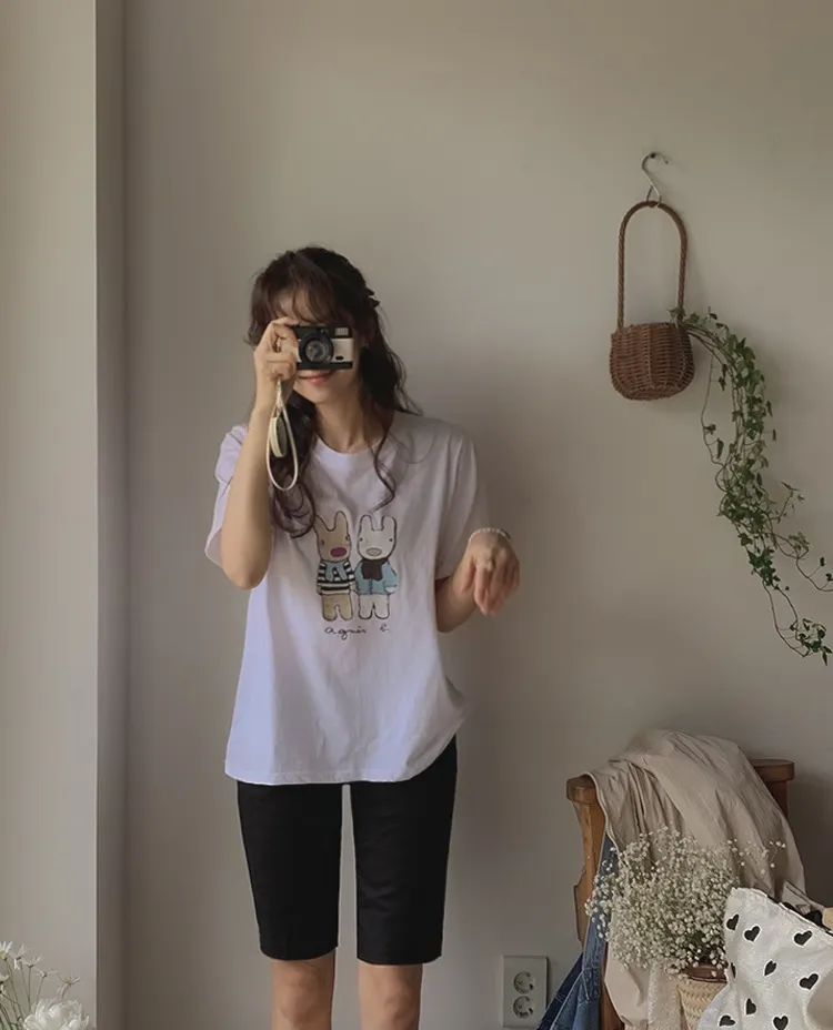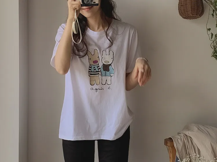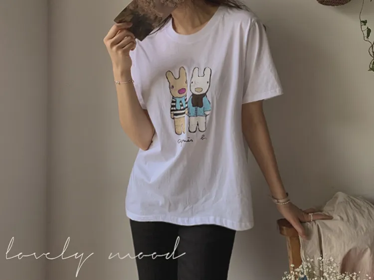 [可愛兔子角色印花的基本款T卹♥] [柔軟棉質面料] [穿著舒適,寬鬆版型,遮蓋身形~] [推薦工作裝、日常裝、休閒裝]