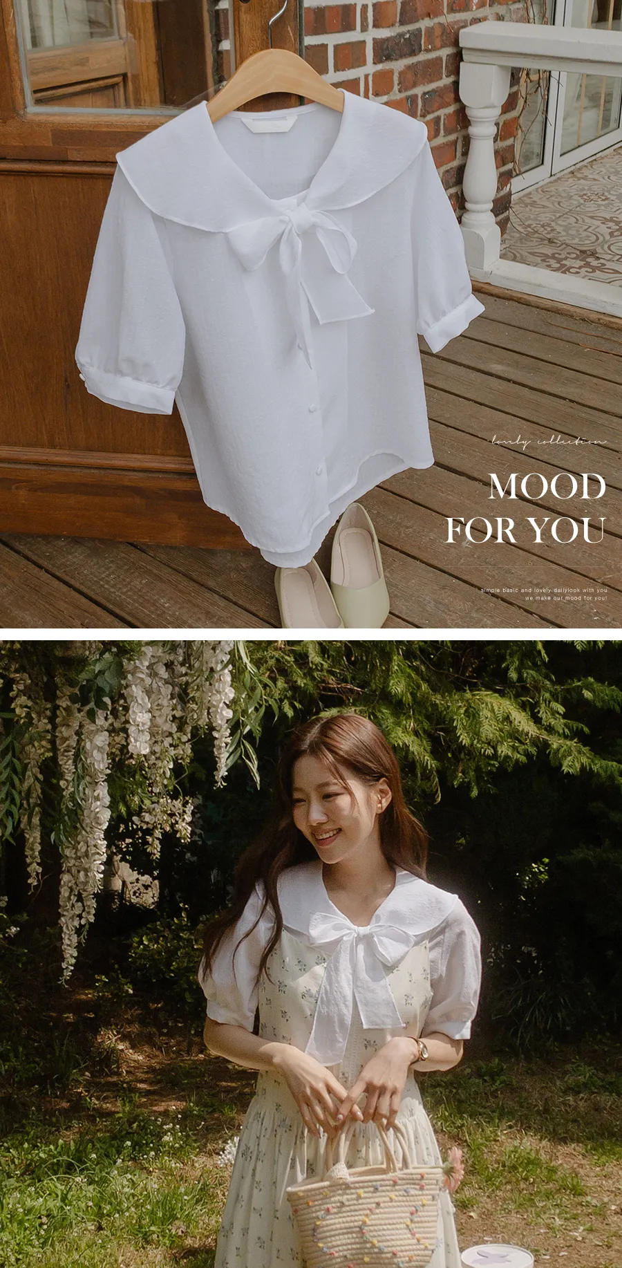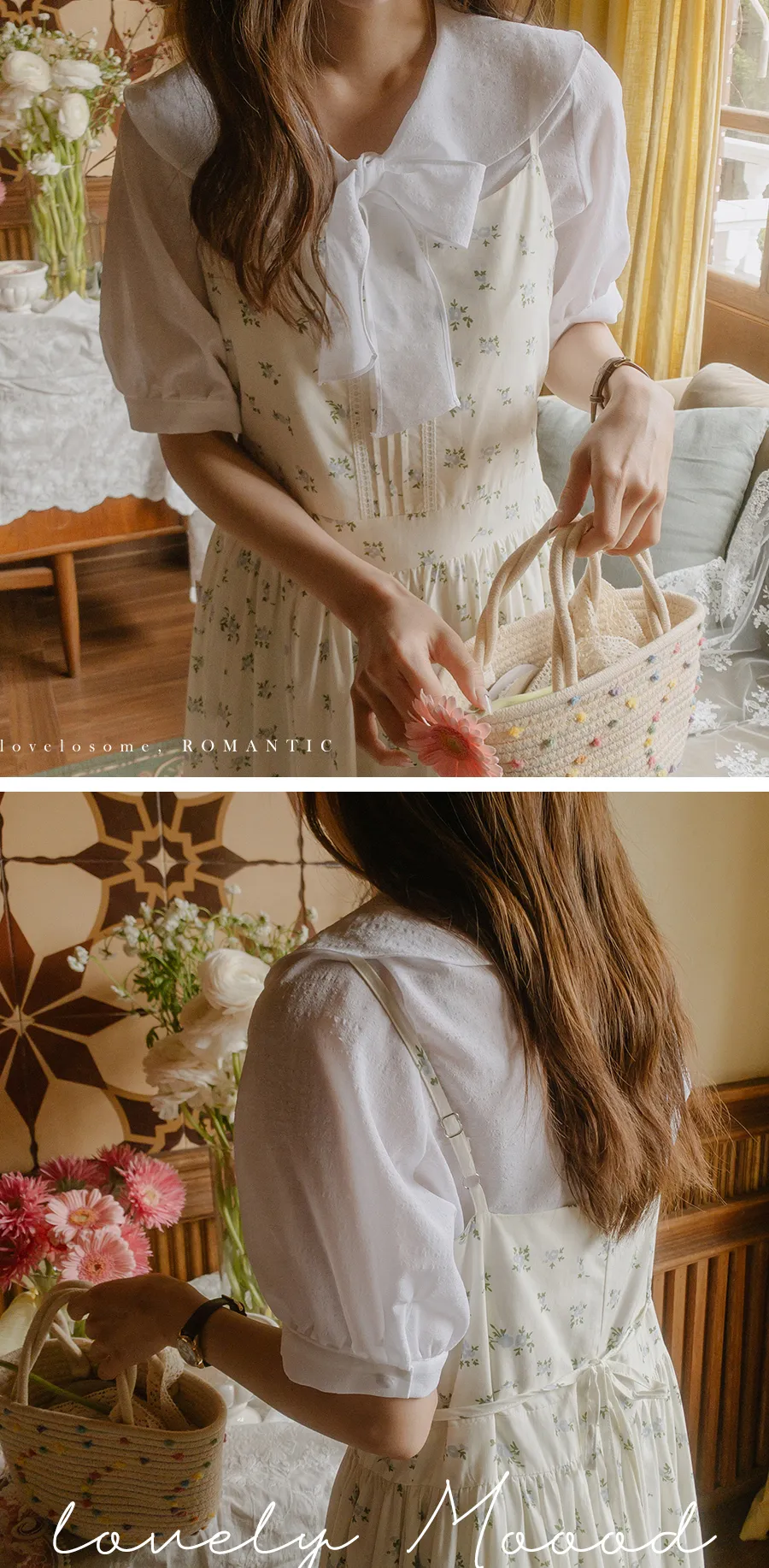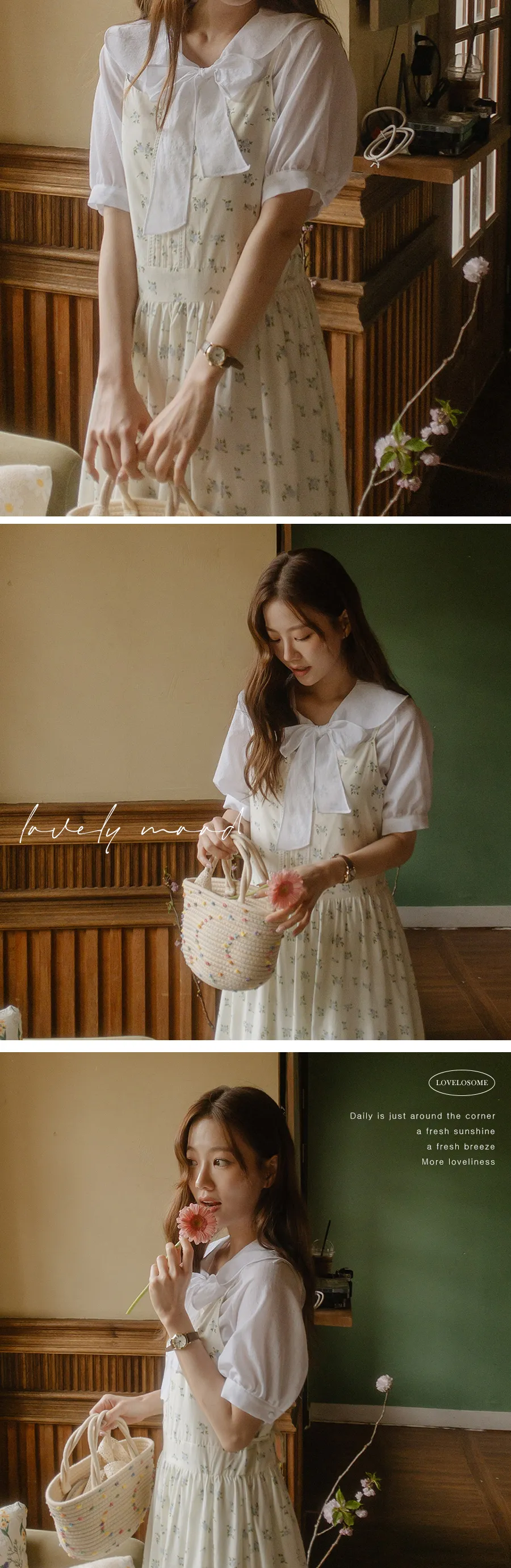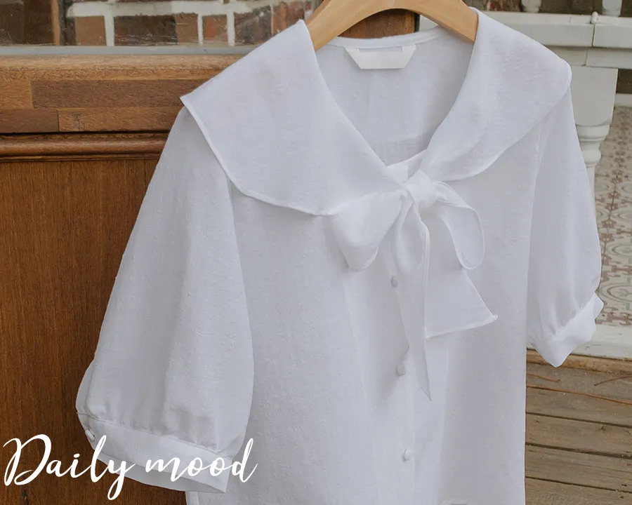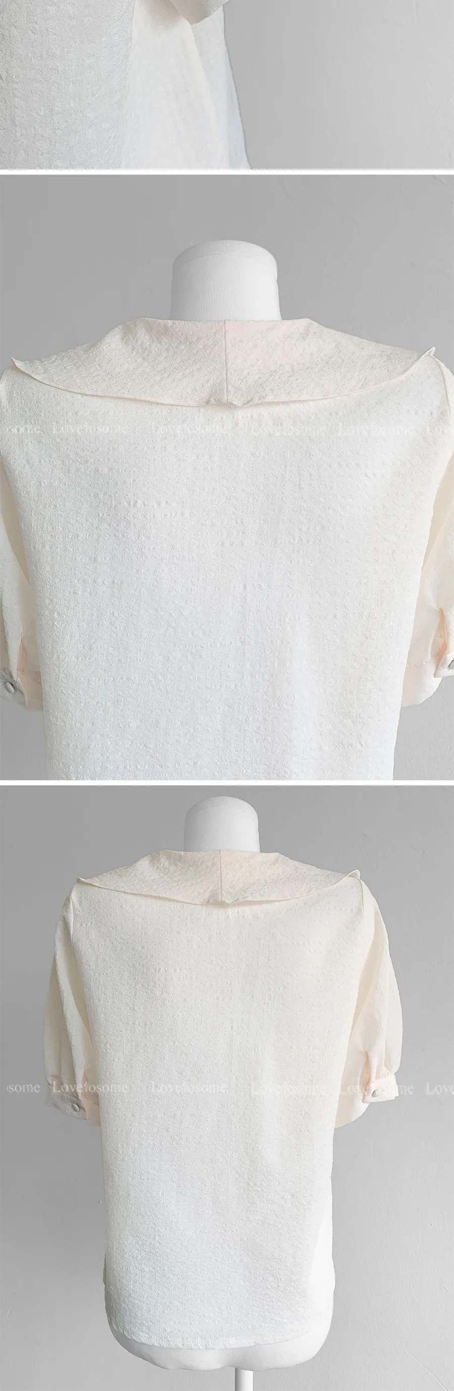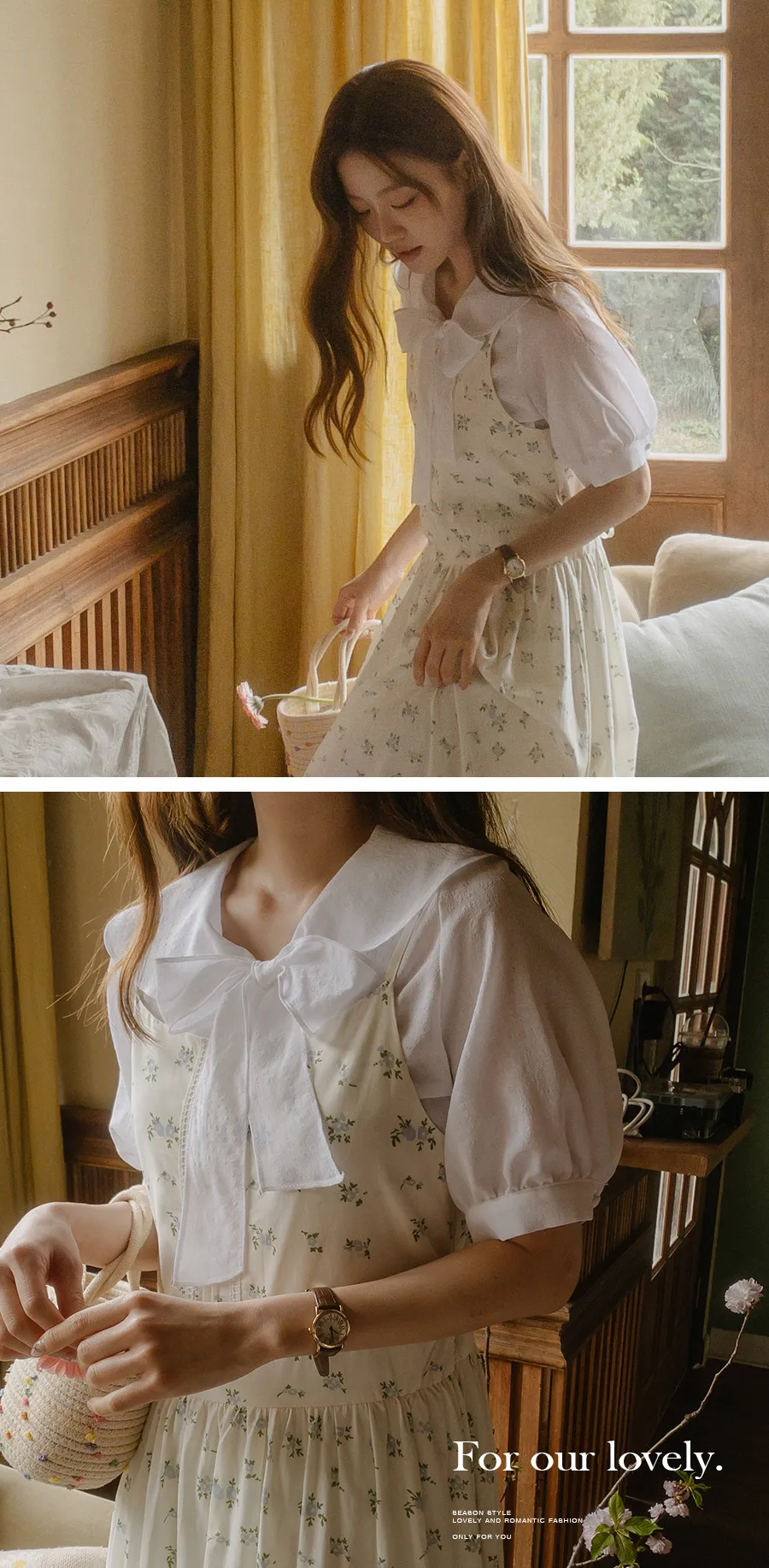 領子設計帶來的活潑氣氛!再用綁帶綁起來,那就更可愛了! 顏色以柔和的白色、奶油色、粉紅色和淡藍色作為點綴。