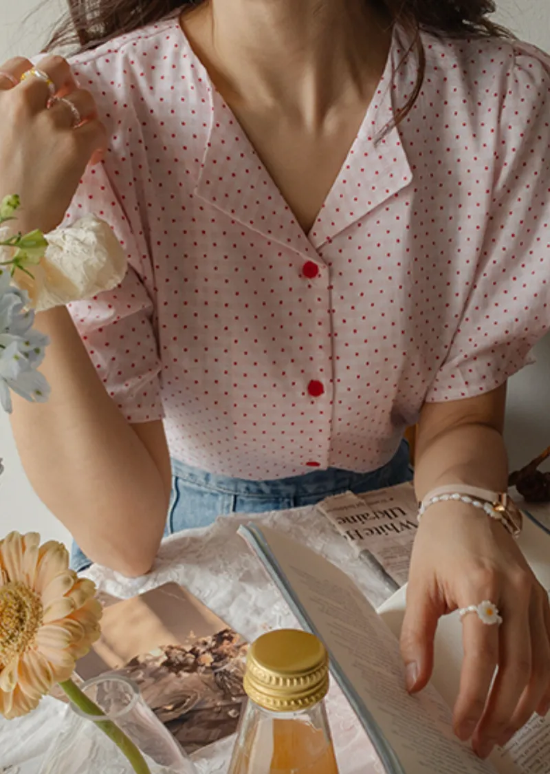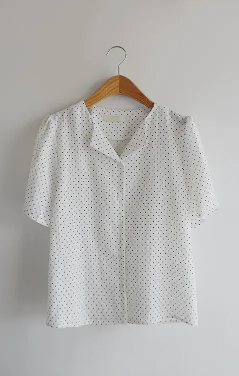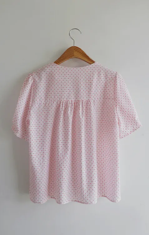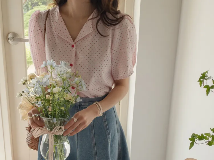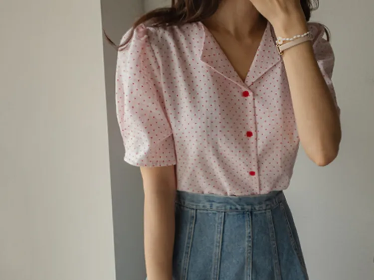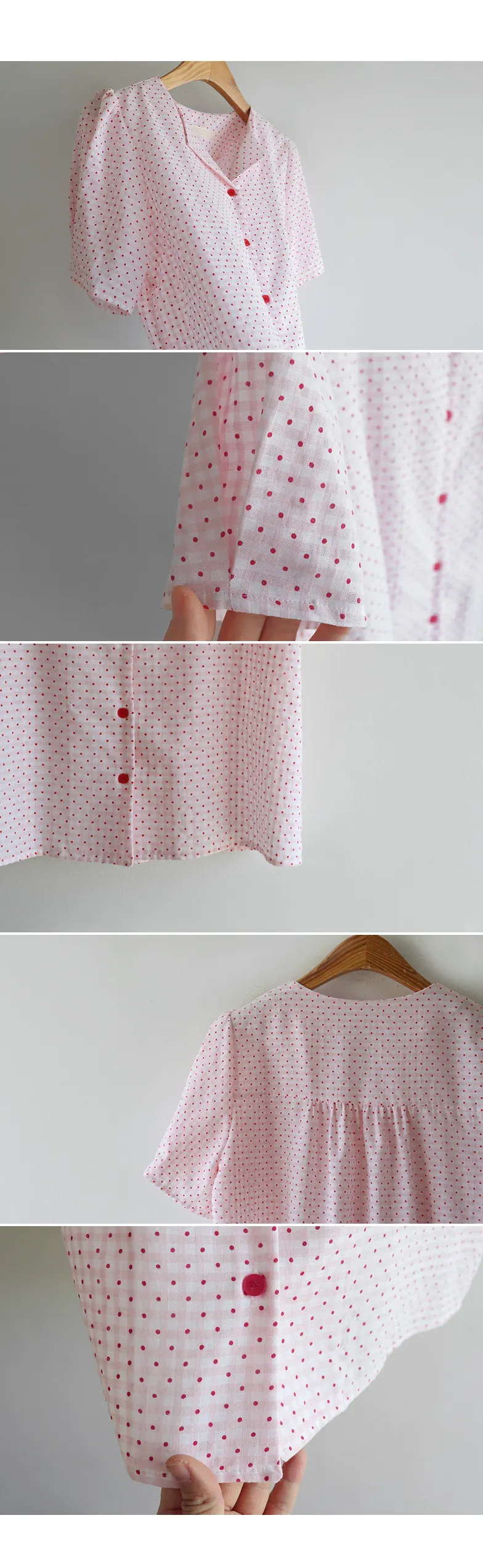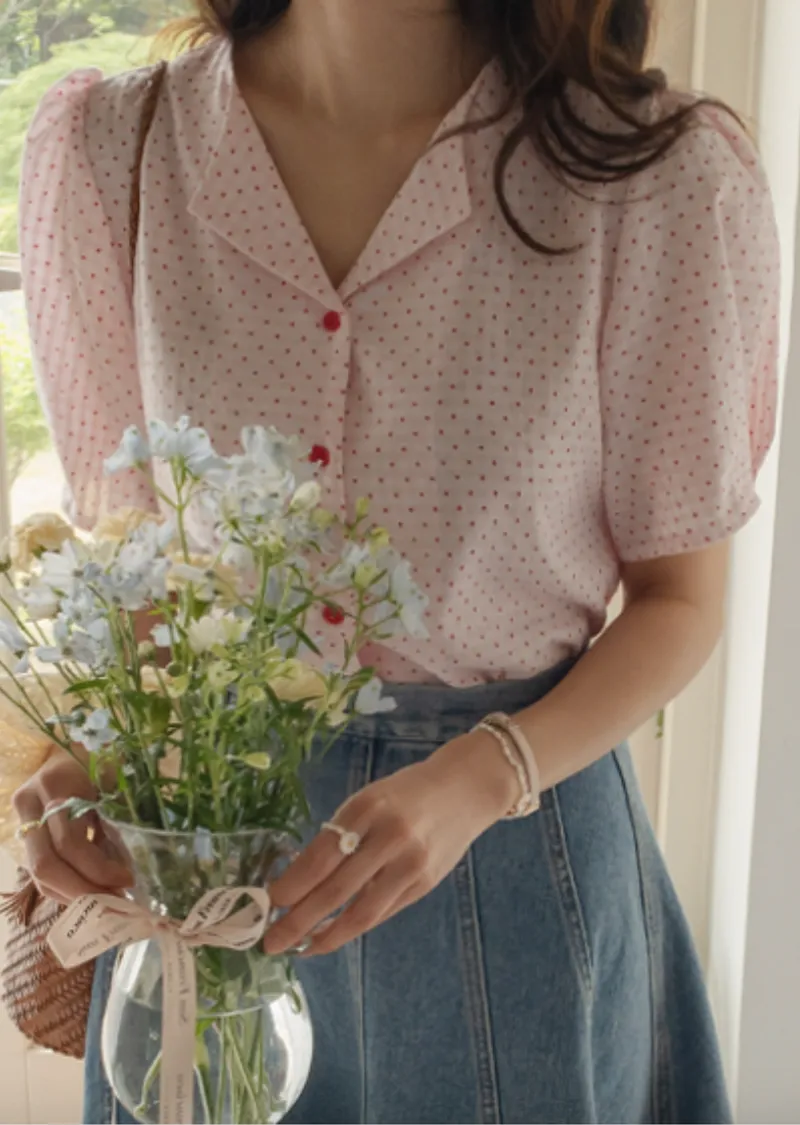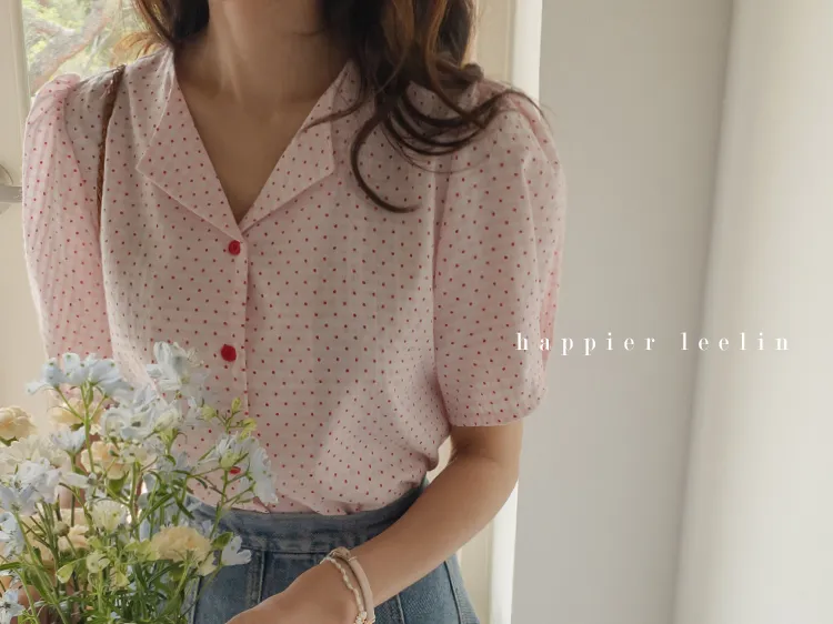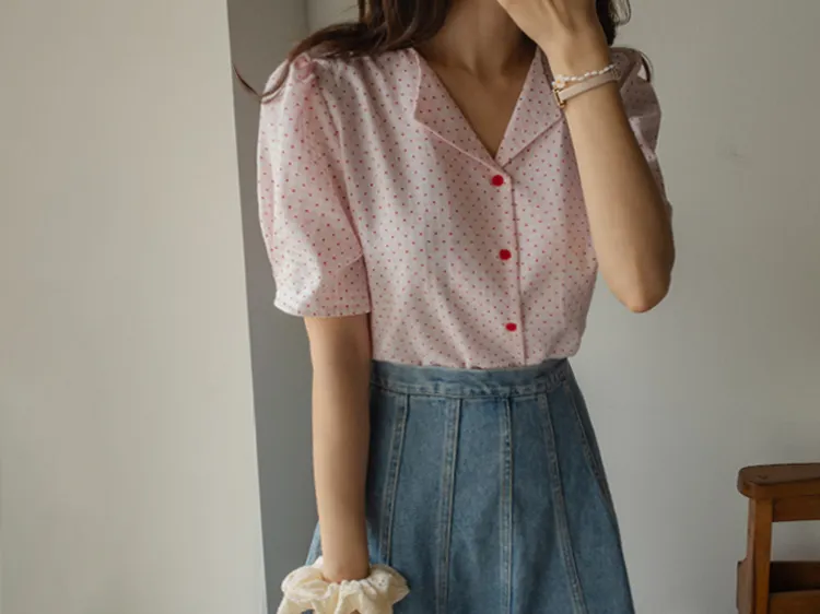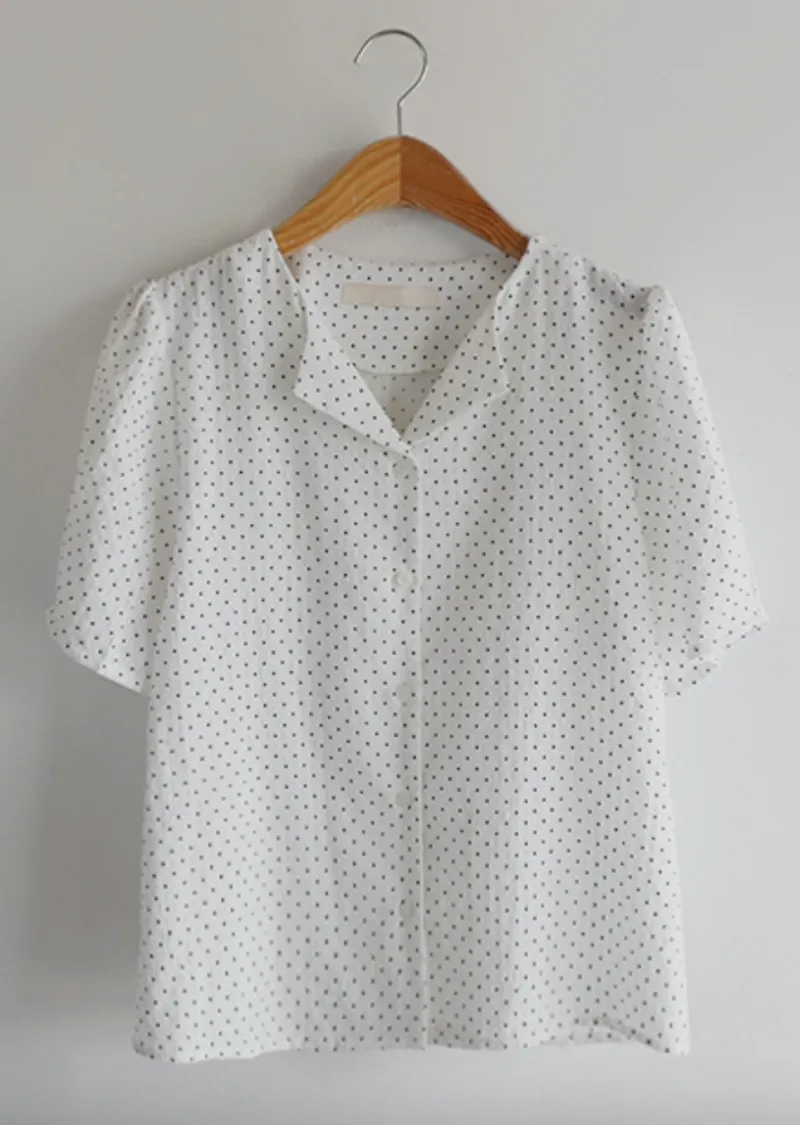可愛圓點點袖末針摺泡泡袖排扣上衣