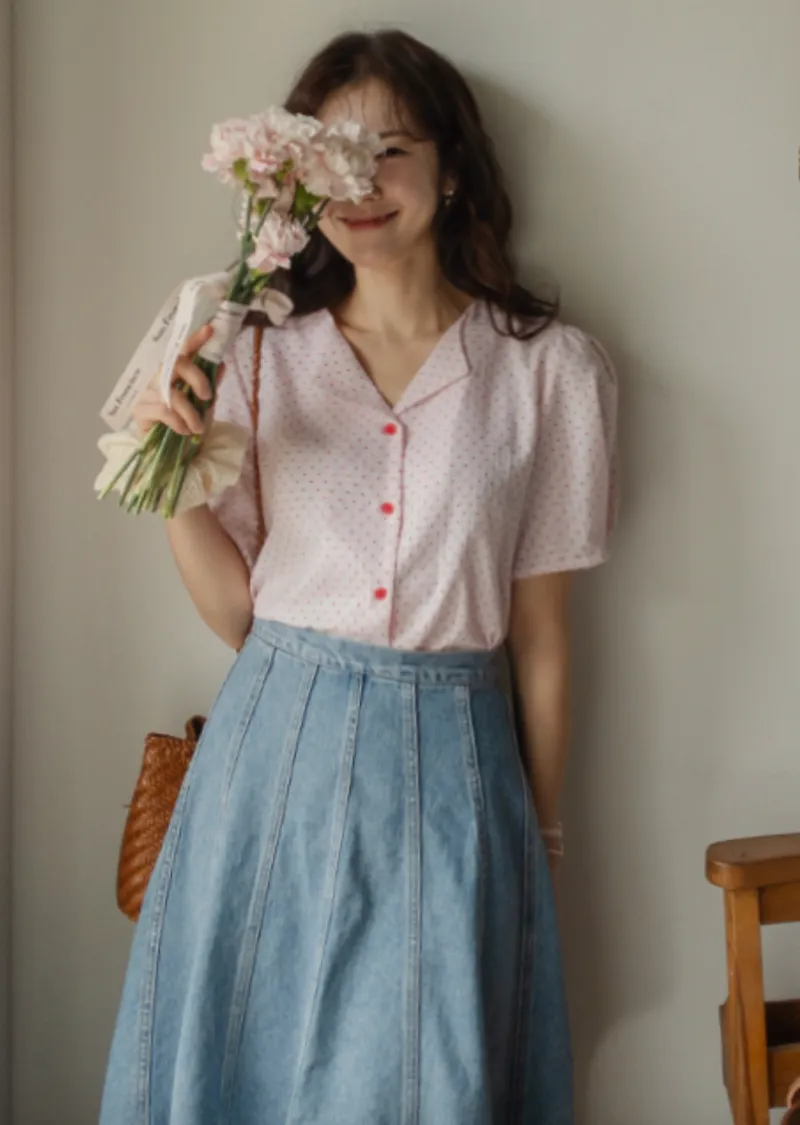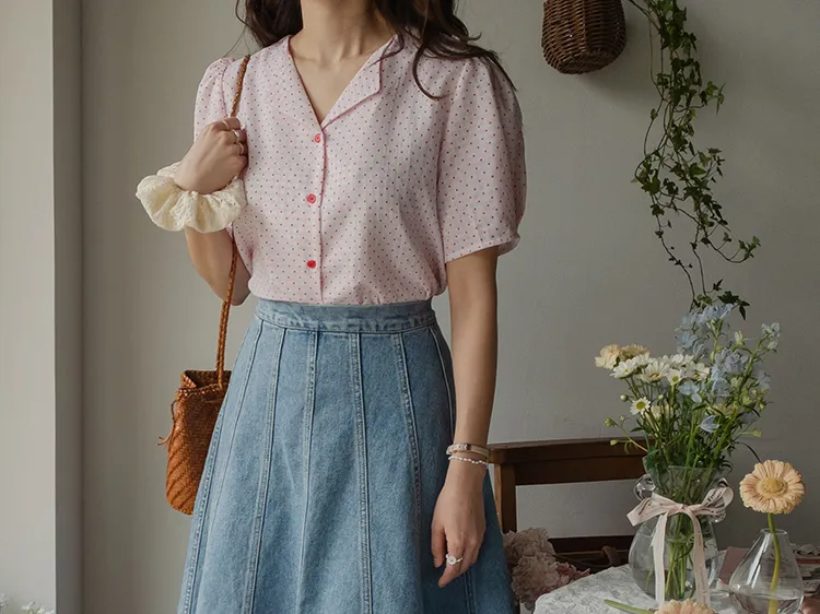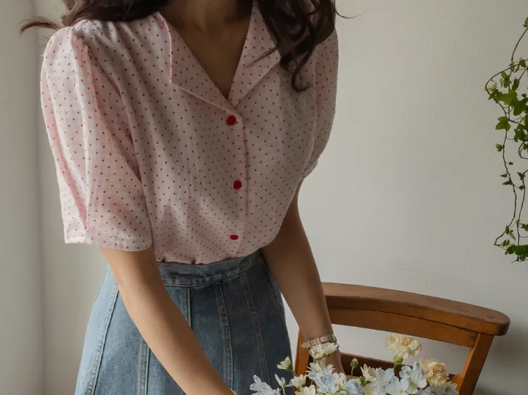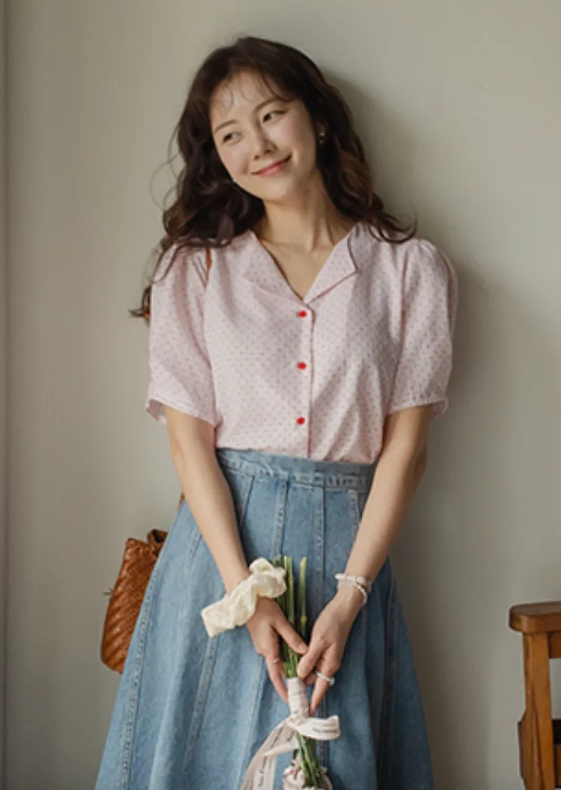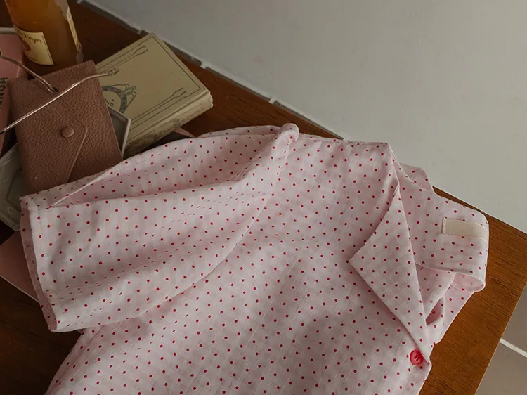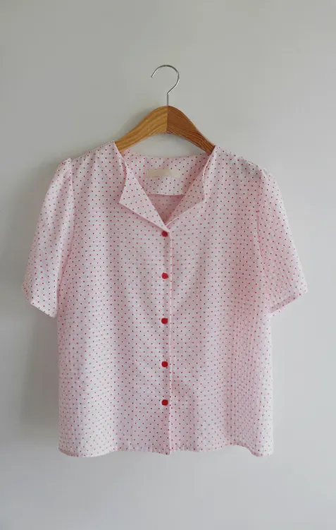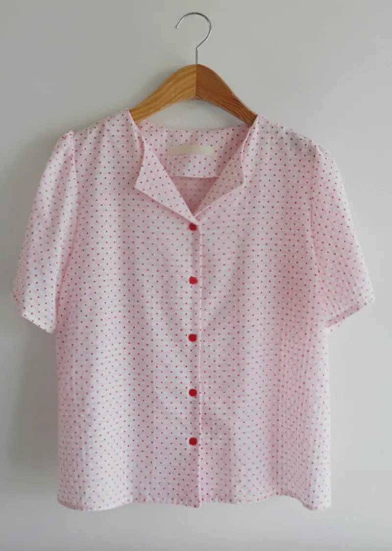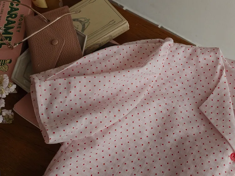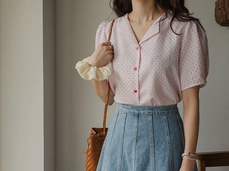 可愛圓點點袖末針摺泡泡袖排扣上衣