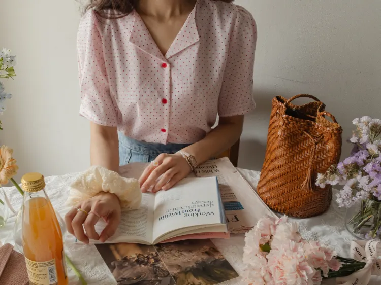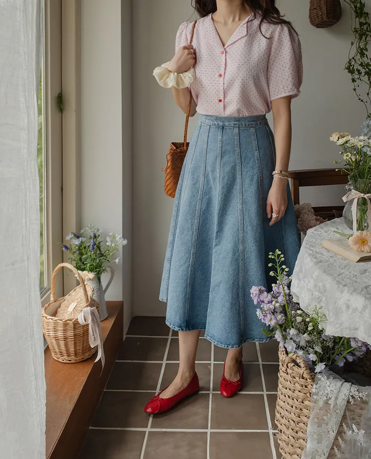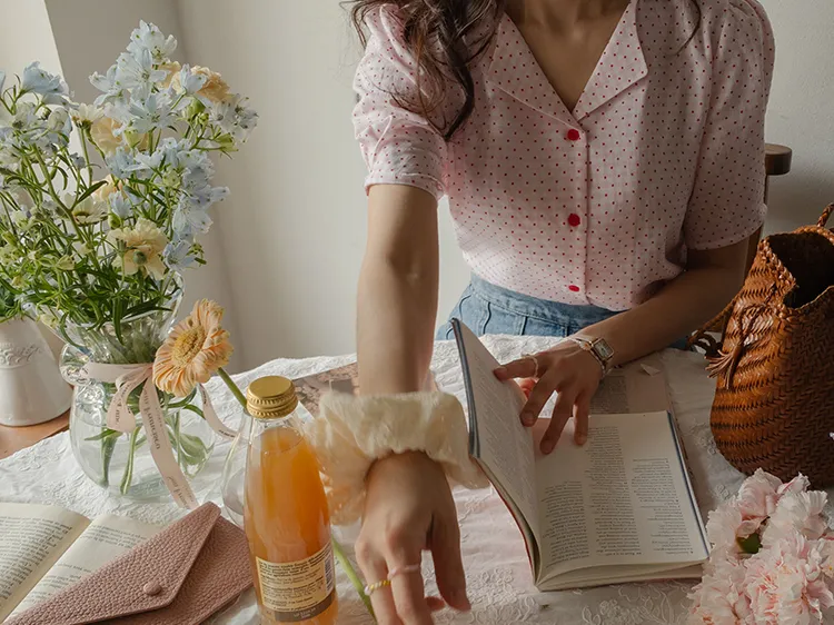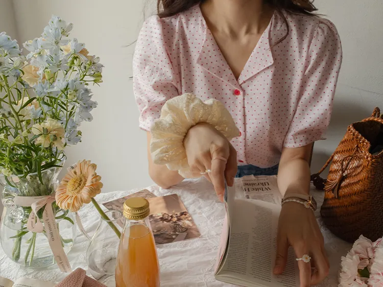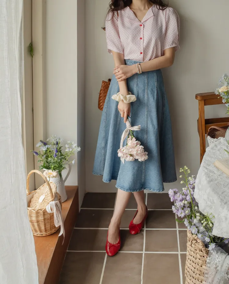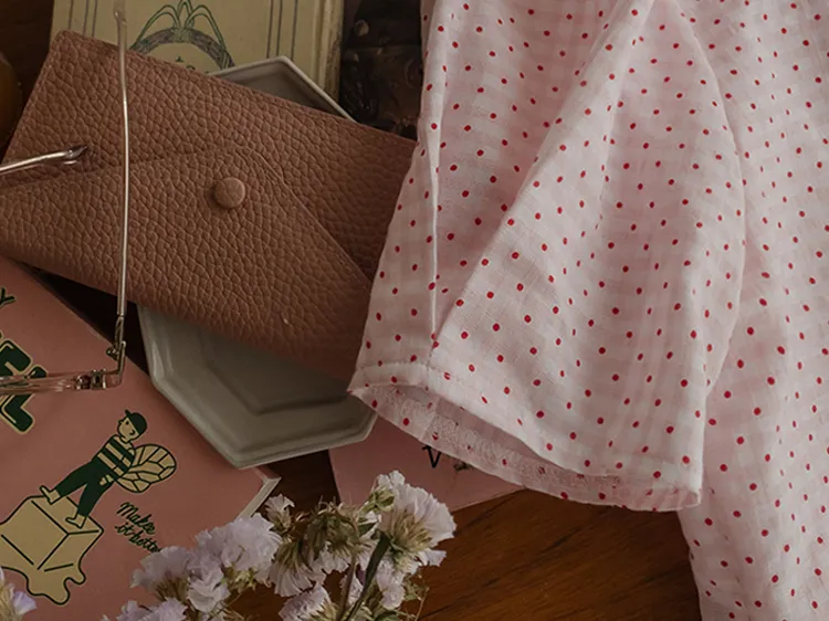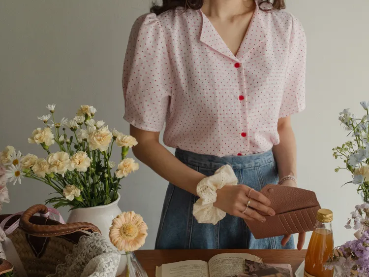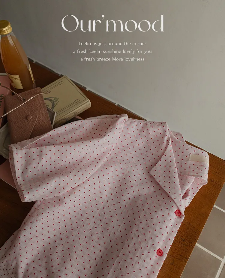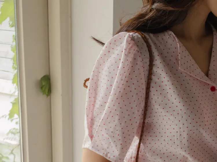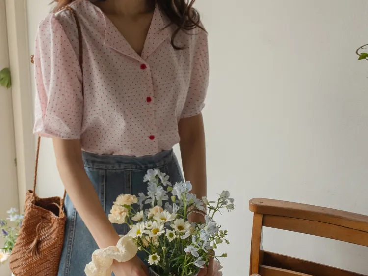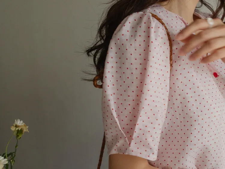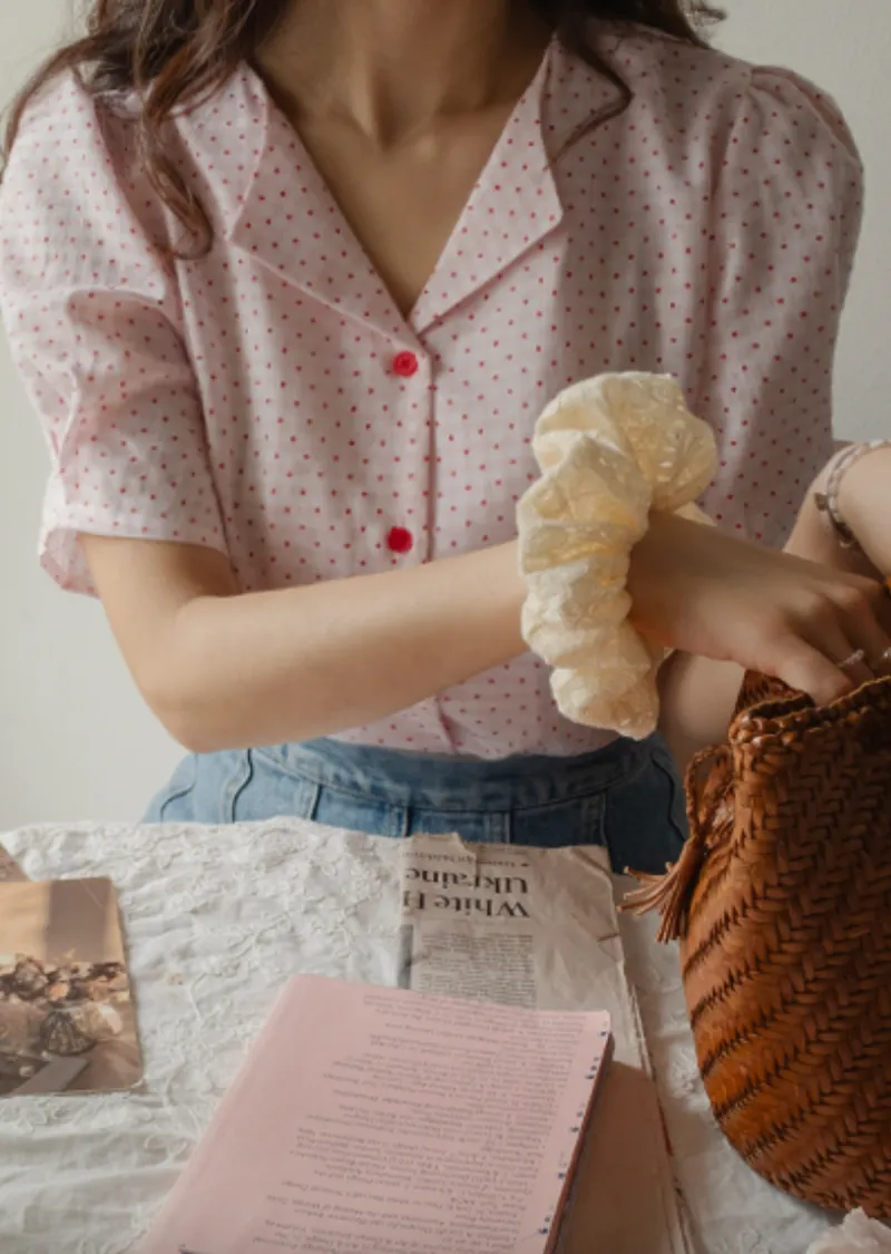 可愛圓點點袖末針摺泡泡袖排扣上衣