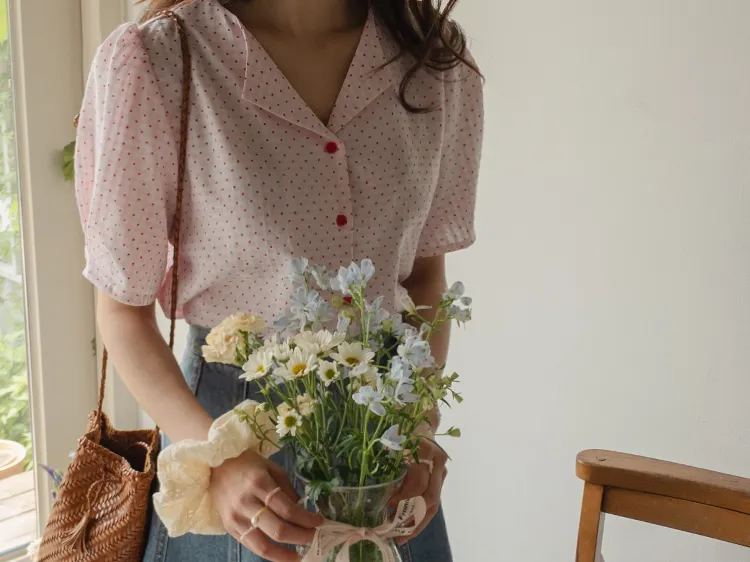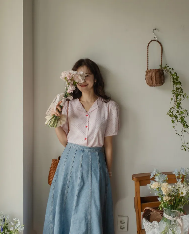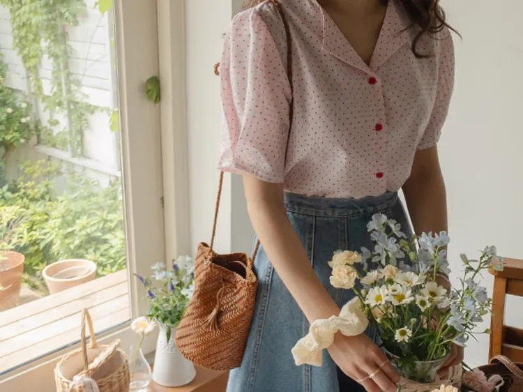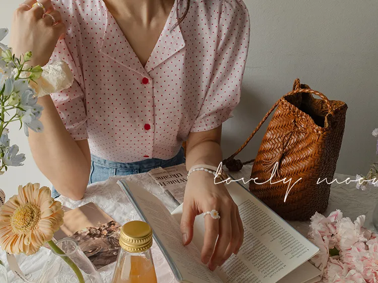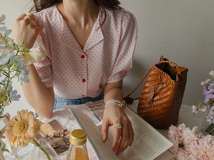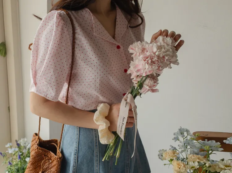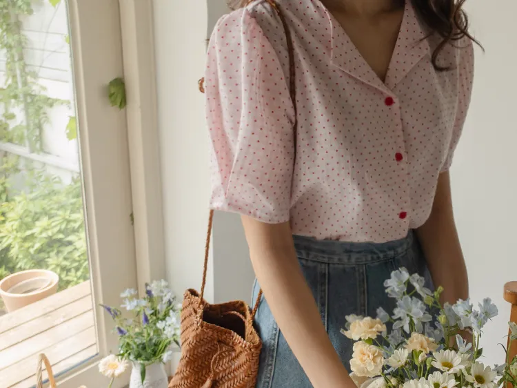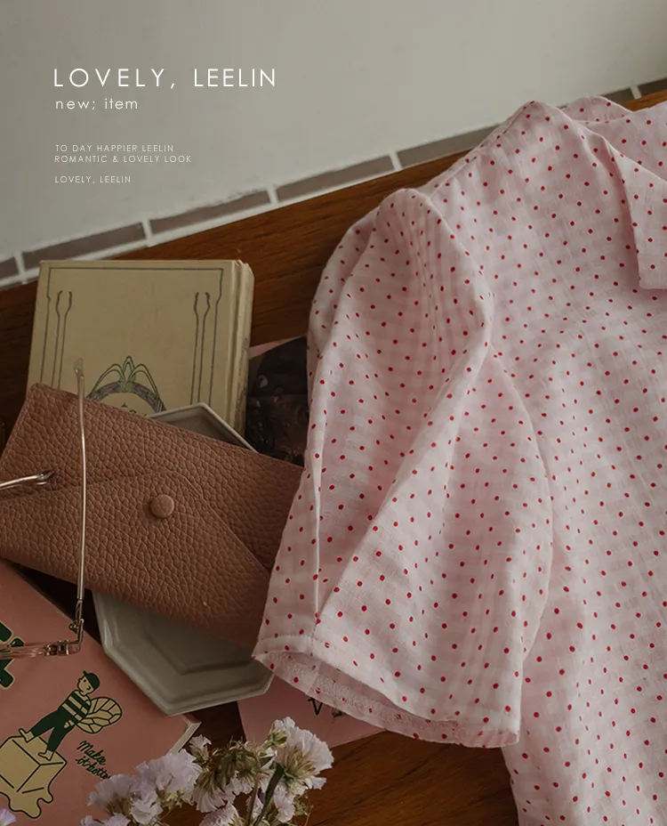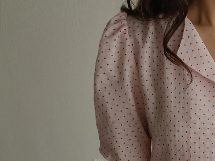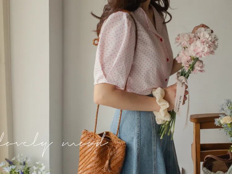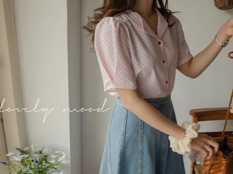 [平靜的圓點圖案,充滿可愛的心情] [像花蕾一樣蓬鬆的可愛泡泡袖] [輕款蓬鬆面料,涼爽] [沉穩的圓點圖案感受到可愛的心情,搭配可愛的泡泡袖,這是一件有亮點的短袖襯衫][肩膀上有褶皺,用別針將袖子的末端塞進去,鼓起的袖線就像花蕾一樣,真是太可愛了♥]