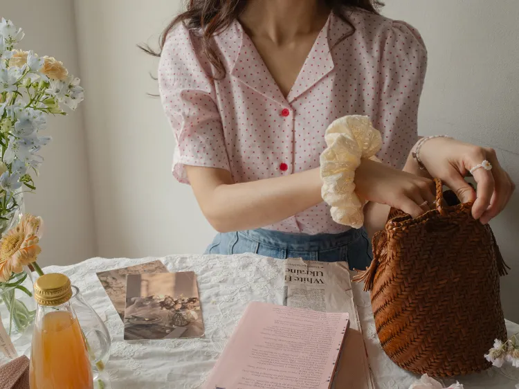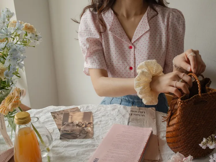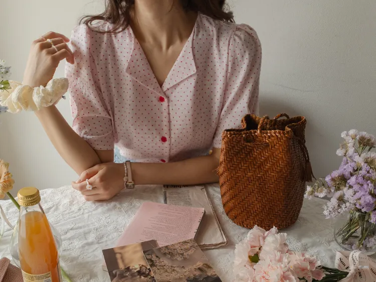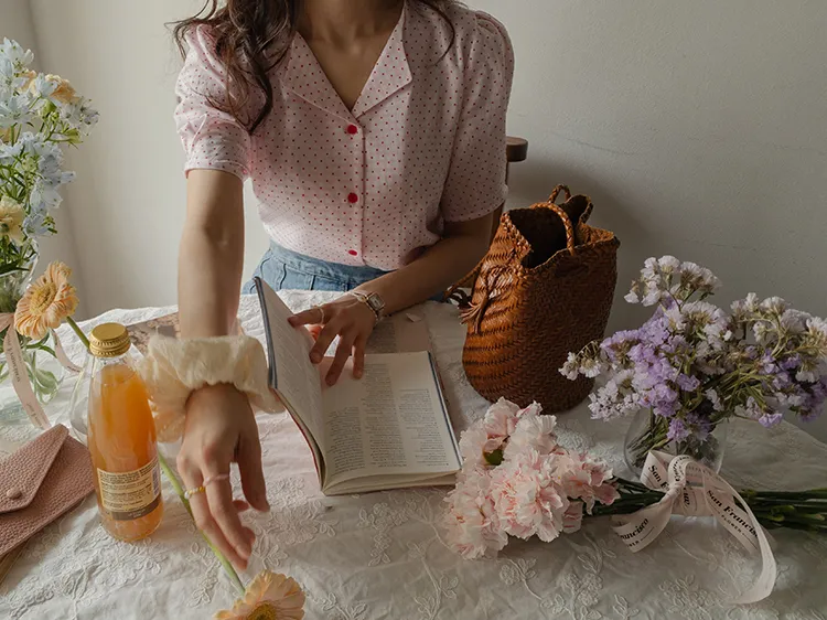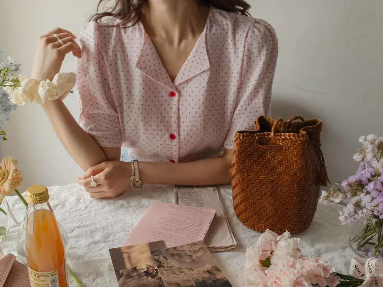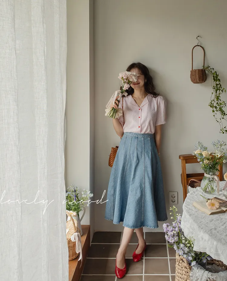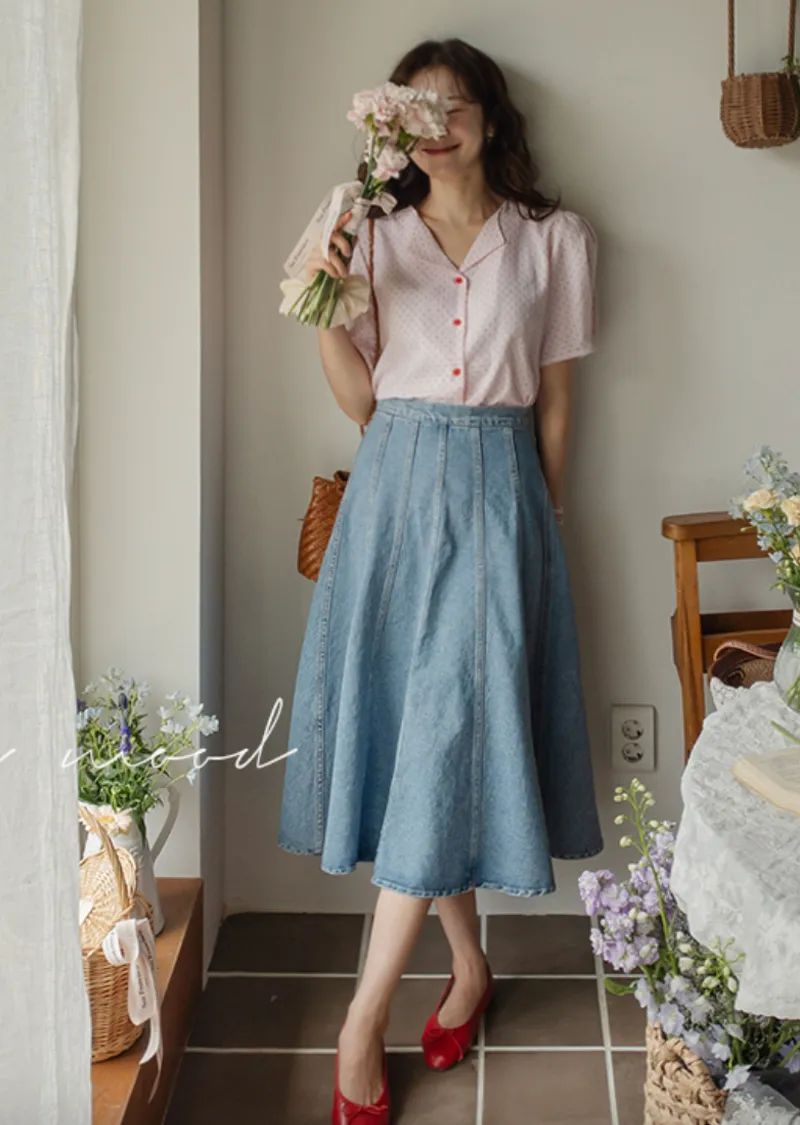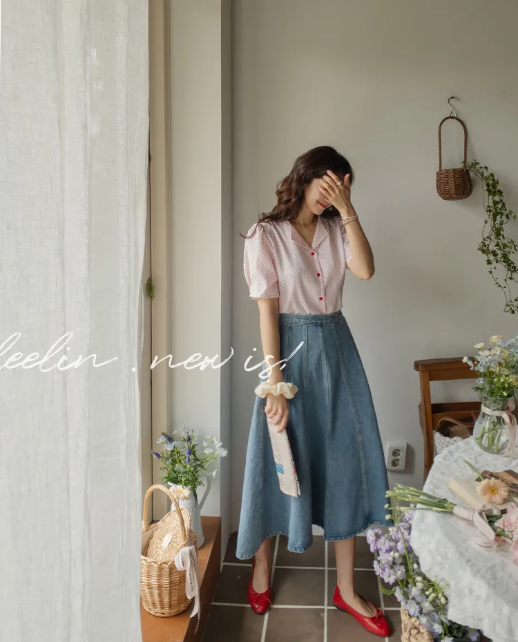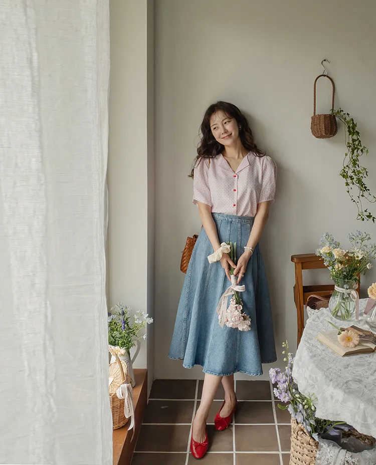 [平靜的圓點圖案,充滿可愛的心情] [像花蕾一樣蓬鬆的可愛泡泡袖] [輕款蓬鬆面料,涼爽] [沉穩的圓點圖案感受到可愛的心情,搭配可愛的泡泡袖,這是一件有亮點的短袖襯衫][肩膀上有褶皺,用別針將袖子的末端塞進去,鼓起的袖線就像花蕾一樣,真是太可愛了♥]