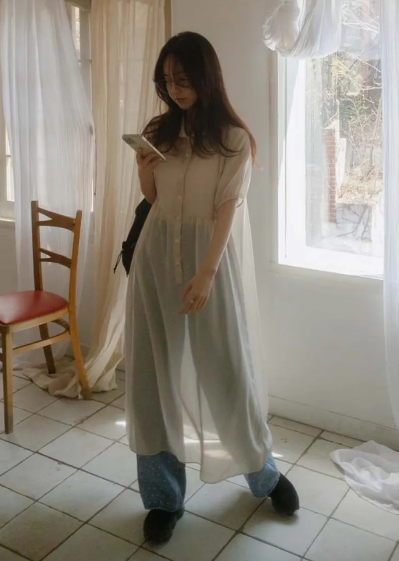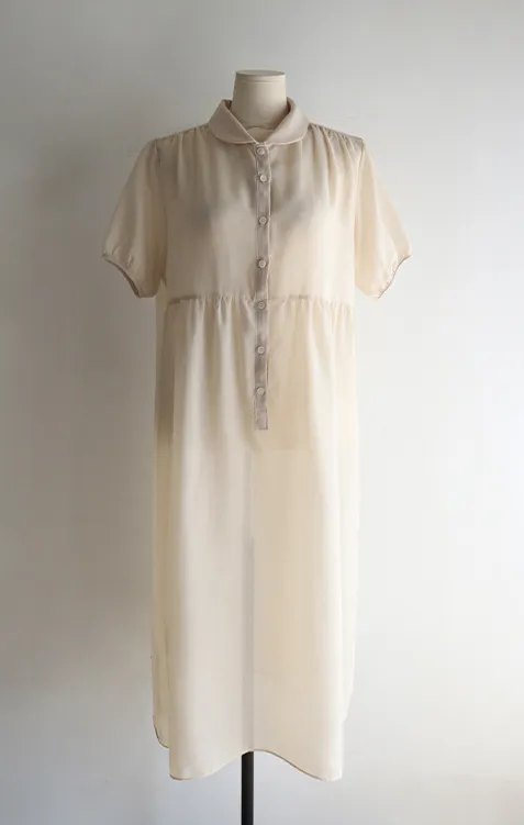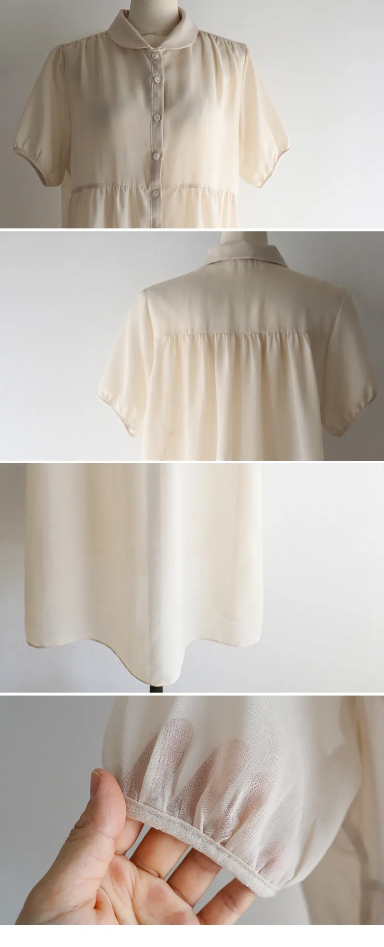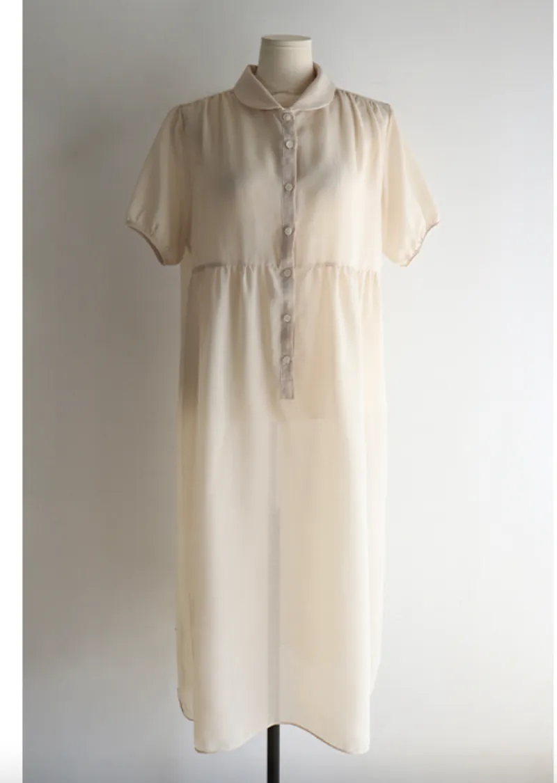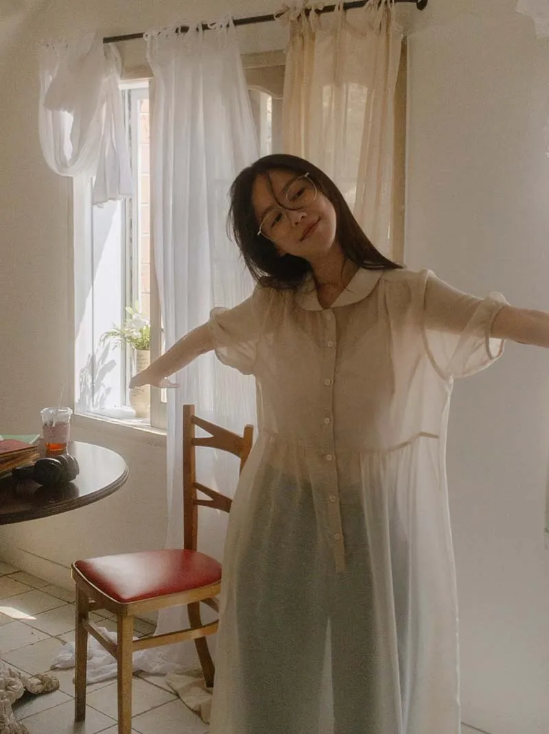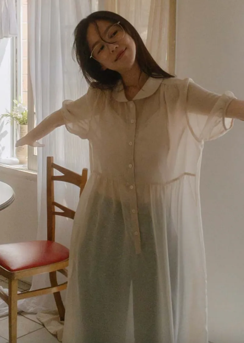 【最小圓領】【雪紡材質】【透視設計】【輕質雪紡材質製成的連身裙,非常適合疊穿:) 】【增加了簡約的圓領和腰線以下的抽褶細節,還能增添可愛的心情!】【純粹的設計因其精緻的氛圍而脫穎而出。 採用透膚設計,與褲子疊穿並作為焦點穿著真是太棒了!】【使用前面的按鈕即可輕鬆開啟和關閉,腰線的剪裁細節位置有點高,甚至還有讓身體線條看起來更長的效果:)】