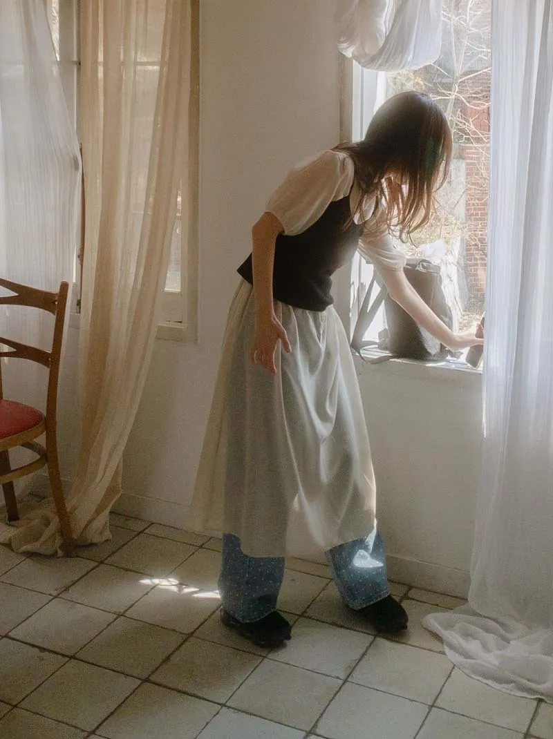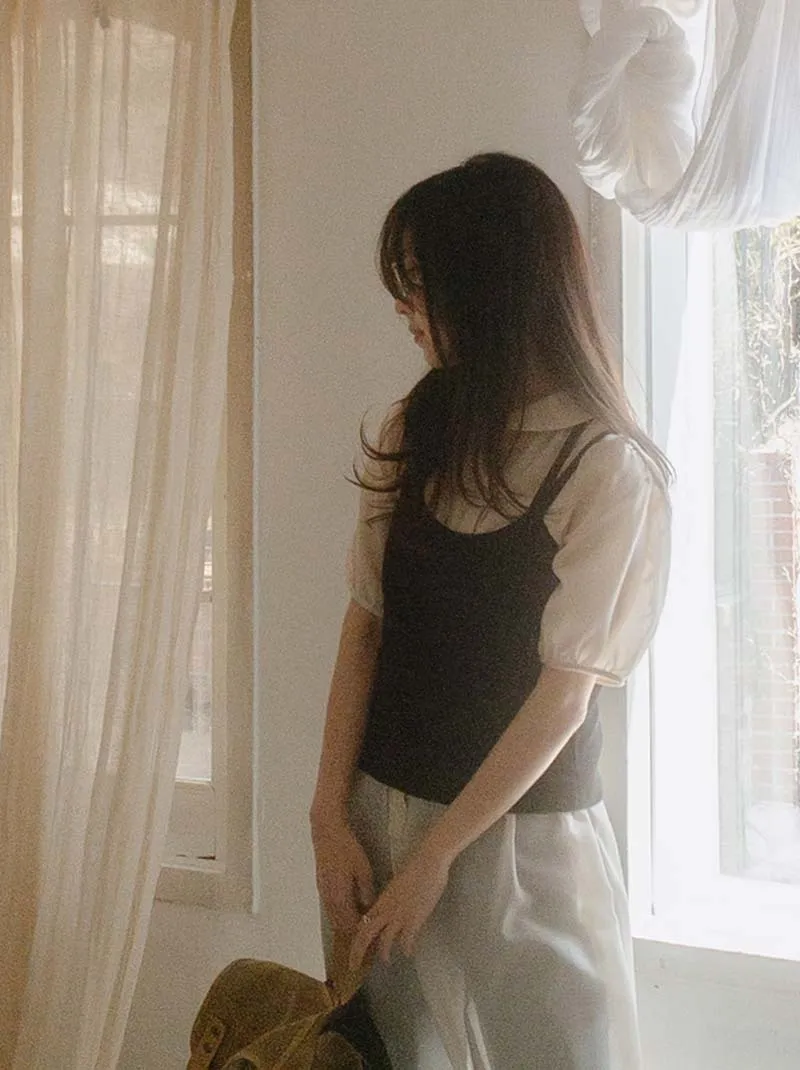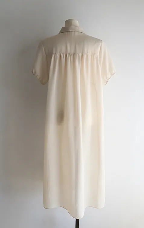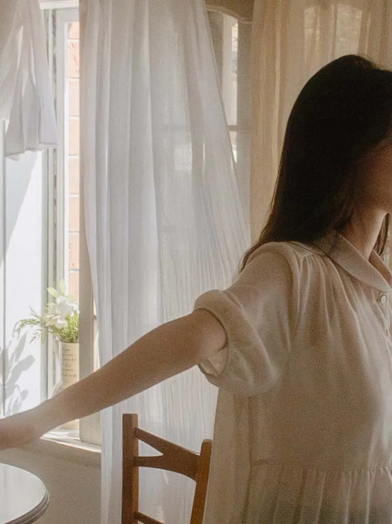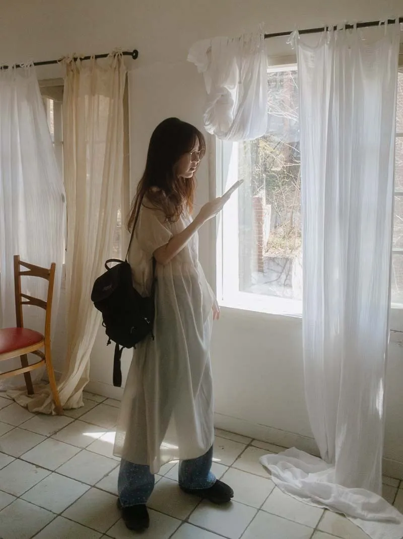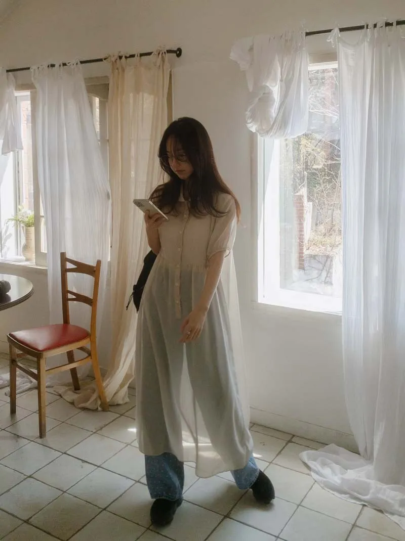 【最小圓領】【雪紡材質】【透視設計】【輕質雪紡材質製成的連身裙,非常適合疊穿:) 】【增加了簡約的圓領和腰線以下的抽褶細節,還能增添可愛的心情!】【純粹的設計因其精緻的氛圍而脫穎而出。 採用透膚設計,與褲子疊穿並作為焦點穿著真是太棒了!】【使用前面的按鈕即可輕鬆開啟和關閉,腰線的剪裁細節位置有點高,甚至還有讓身體線條看起來更長的效果:)】