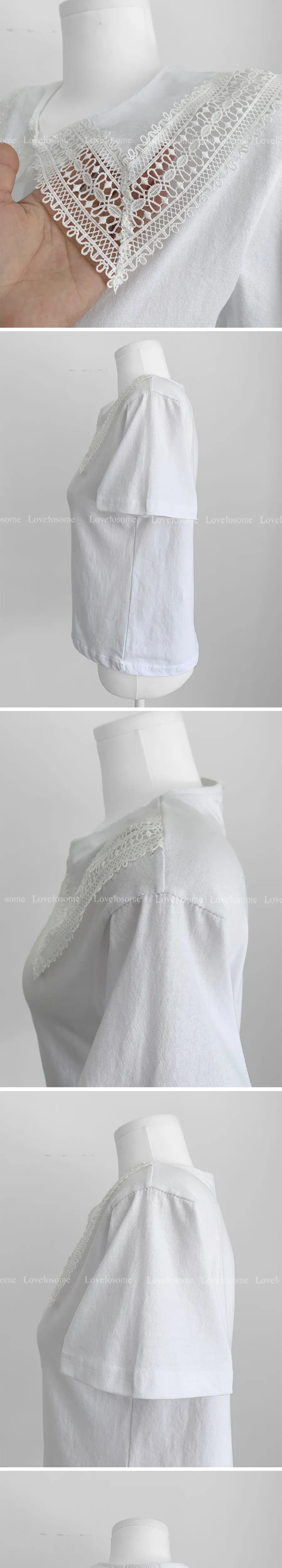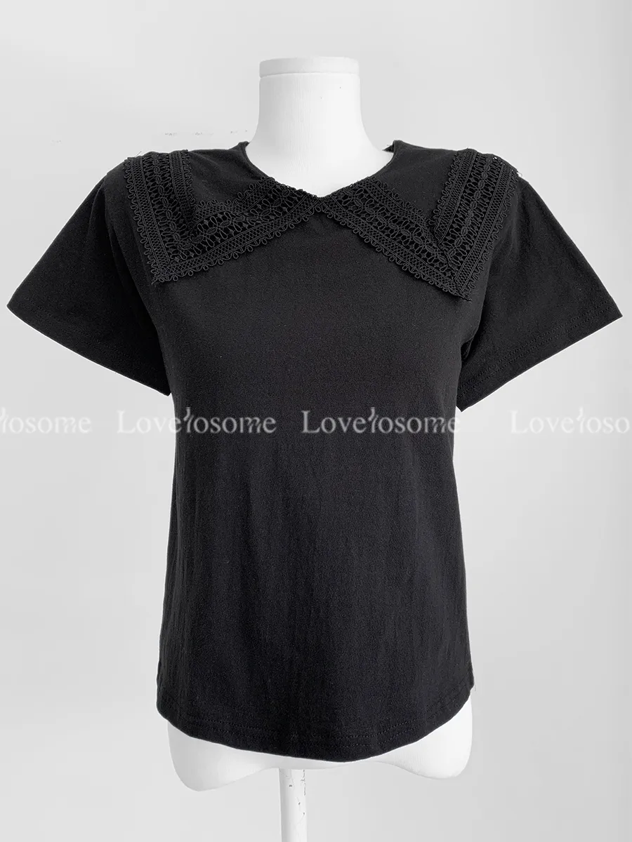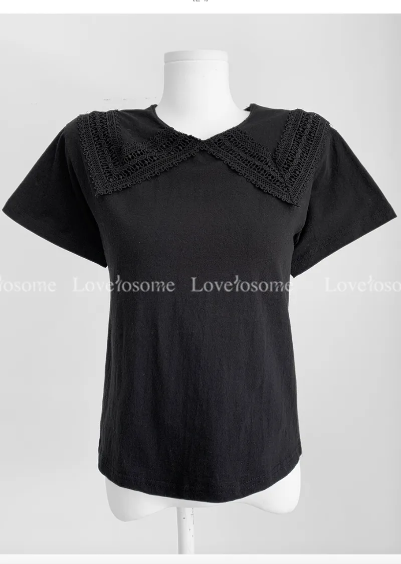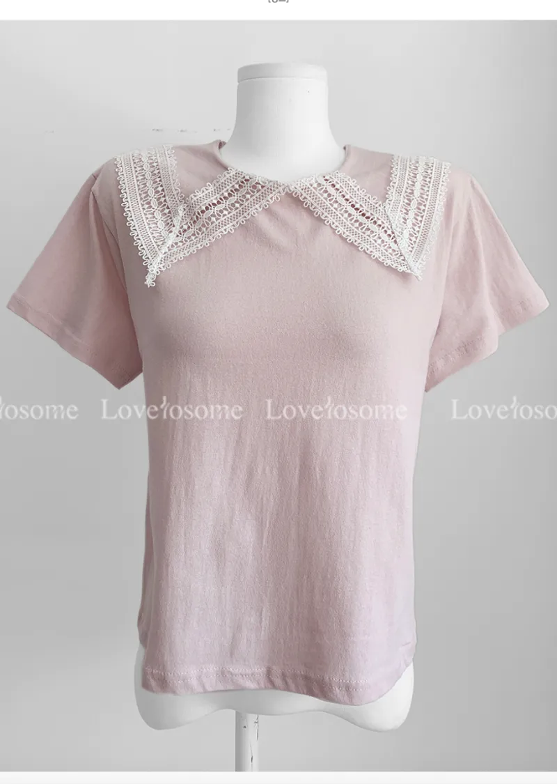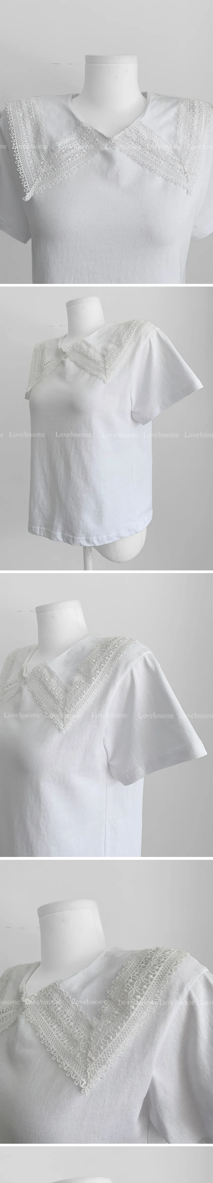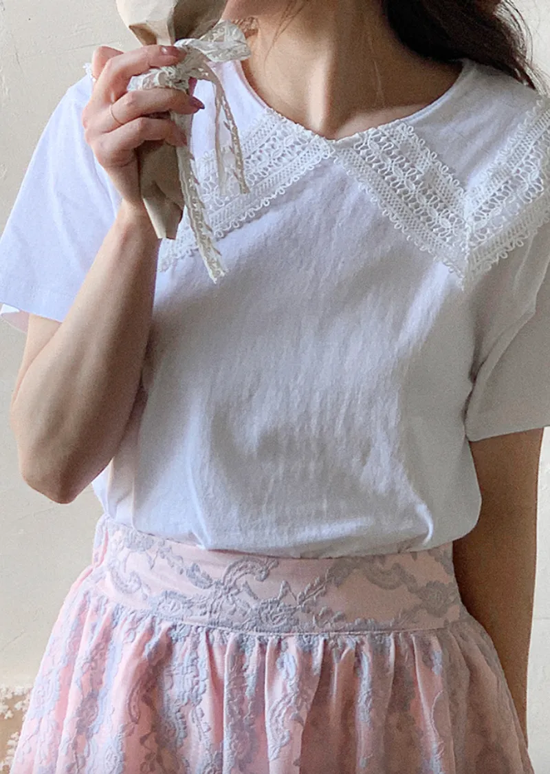 編織蕾絲領設計短袖棉質上衣