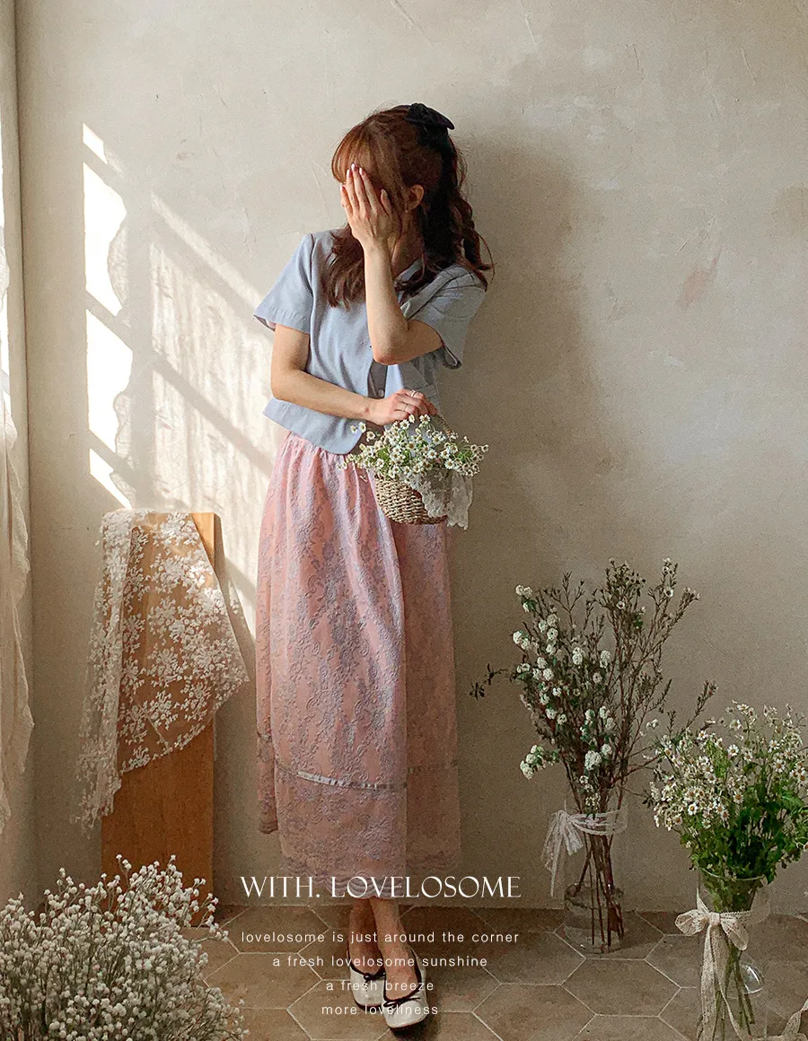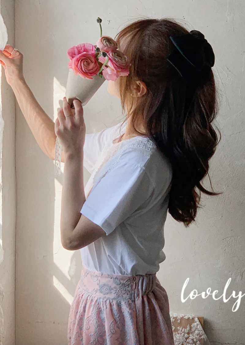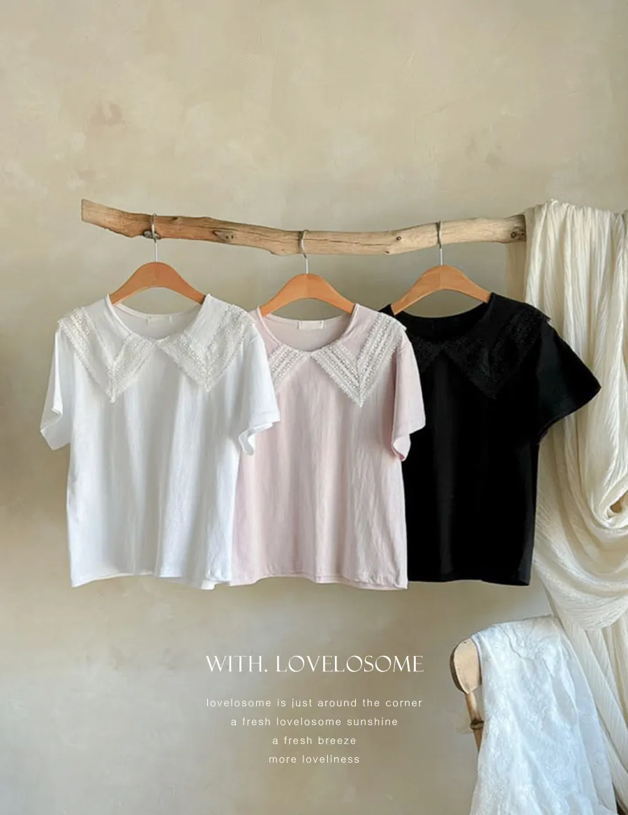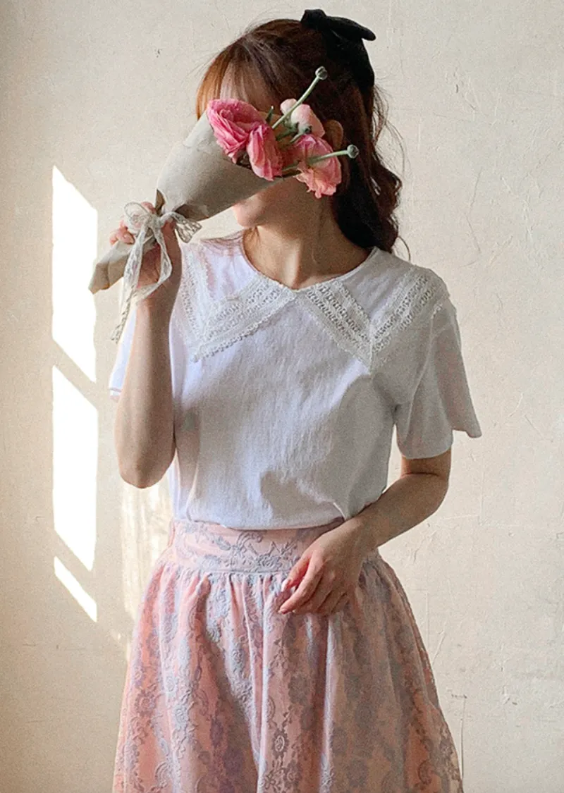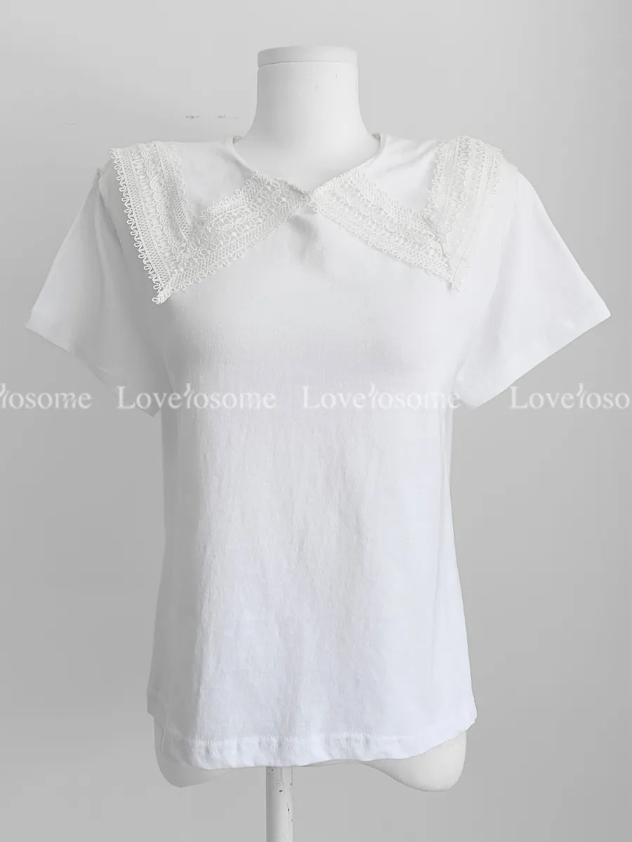 編織蕾絲領設計短袖棉質上衣