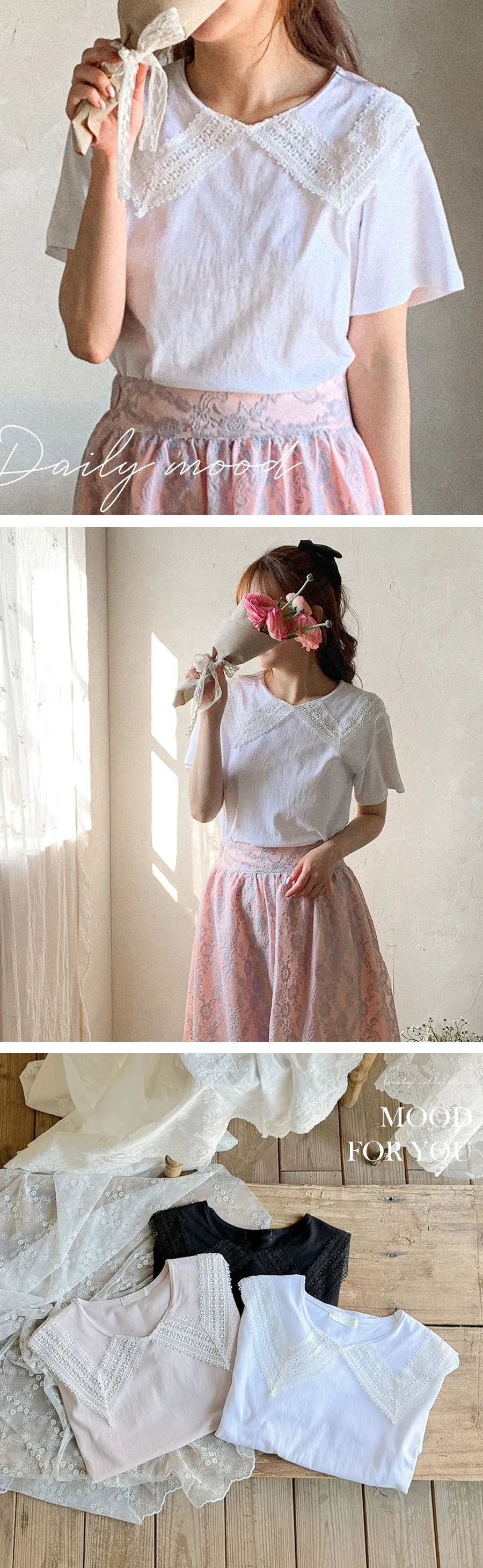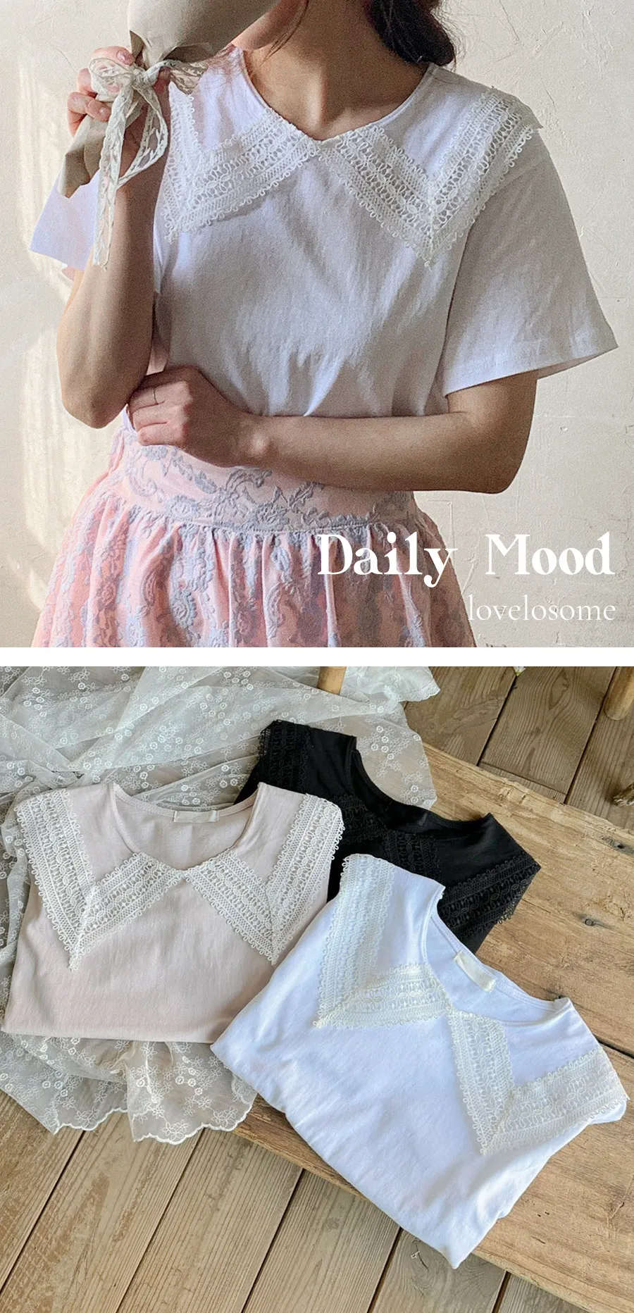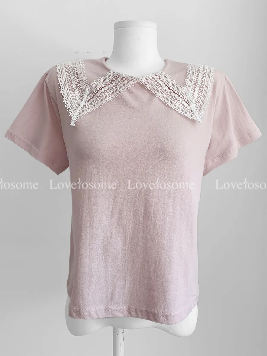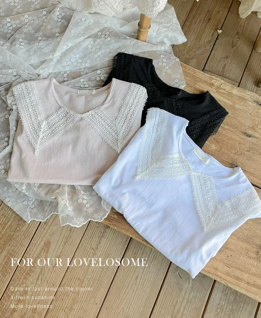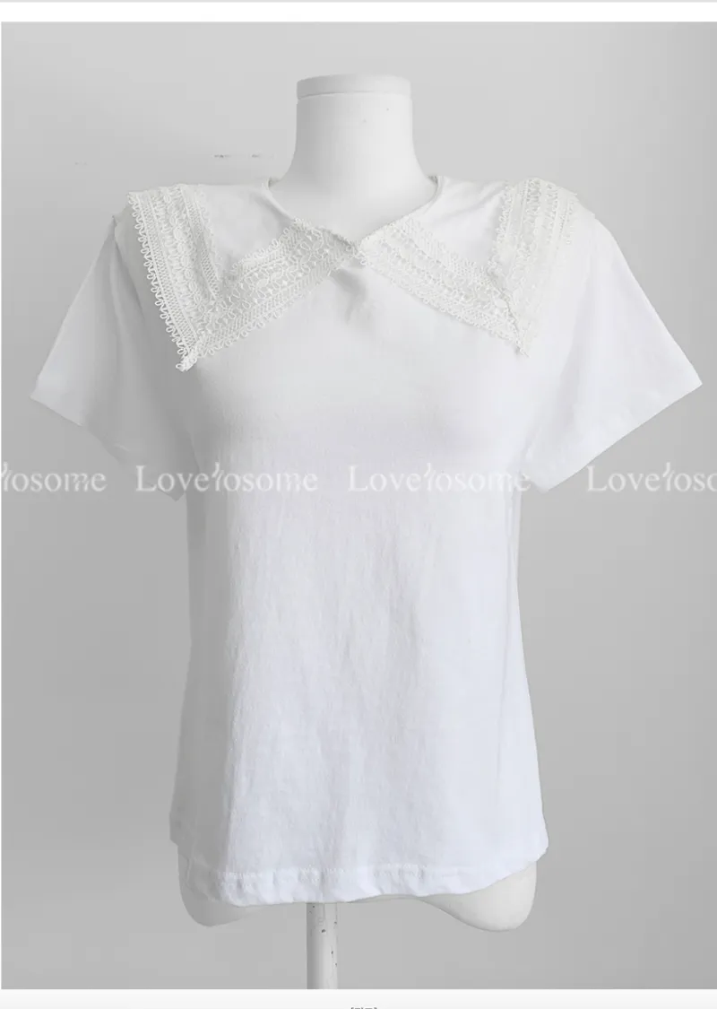 【可愛上衣,搭配領子蕾絲細節♡】【立體領子蕾絲編織!】【蕾絲大領,為素色的T卹增添了可愛點~♡】 【輪廓寬鬆,標準版型,袖長寬鬆,穿起來很舒服】