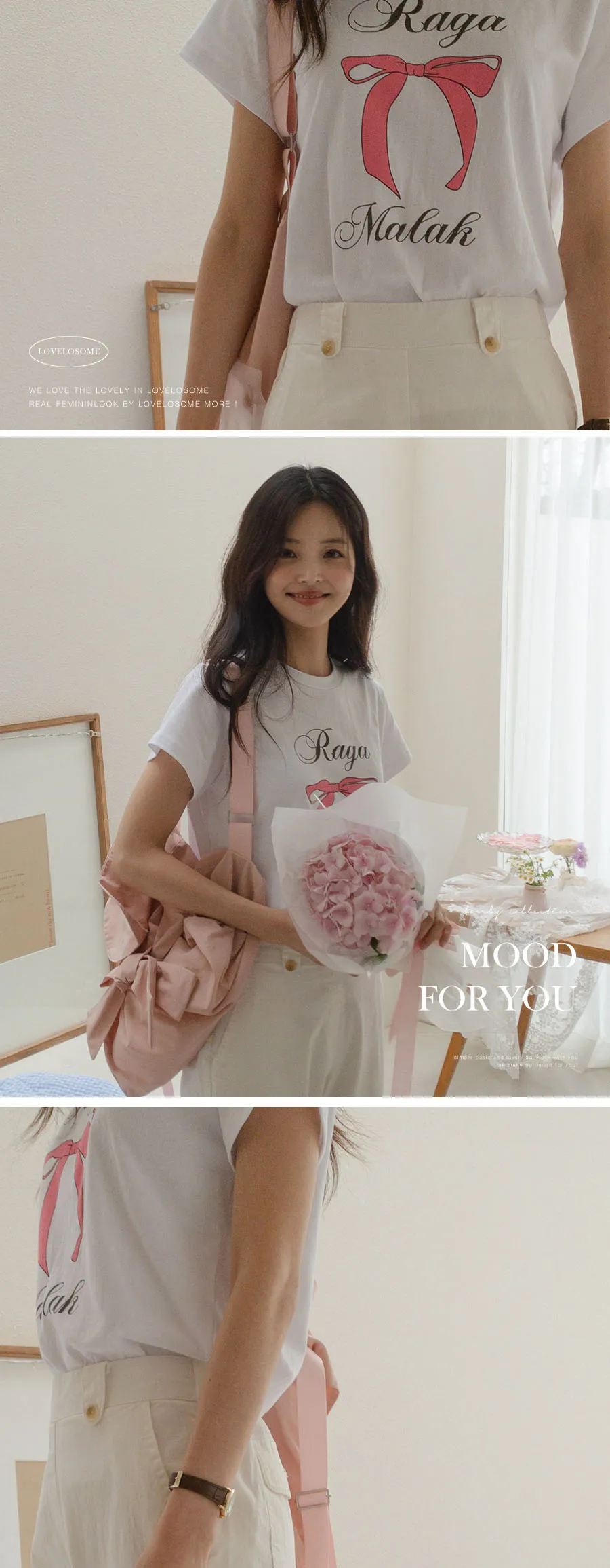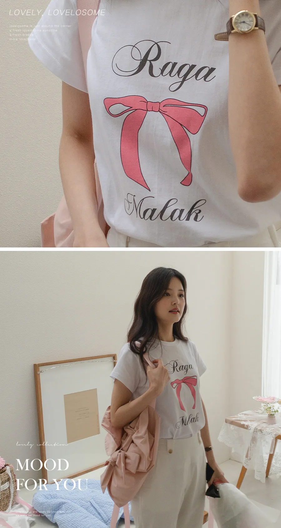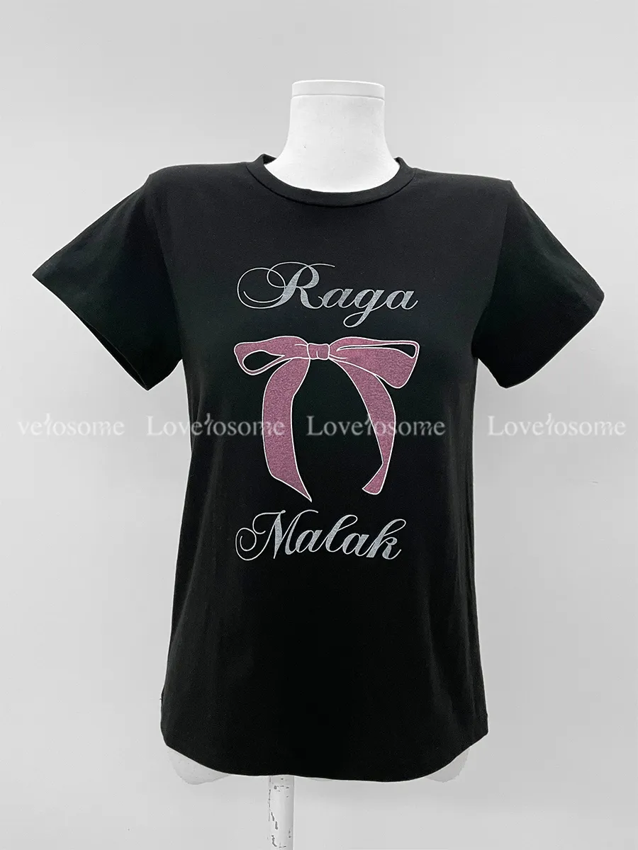 可愛粉紅絲帶印花短袖T卹,以基本版型和蝴蝶結的甜美短袖T卹。一款充滿可愛活潑情調的短袖T卹,俐落的圓領設計以及字母+絲帶的細節。