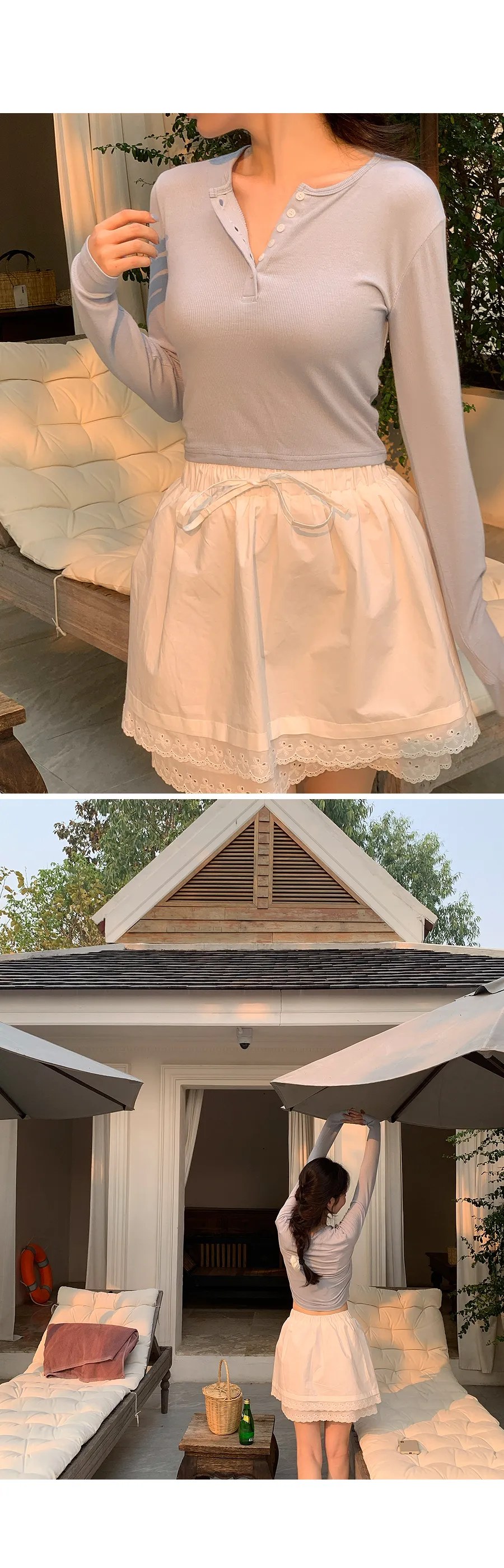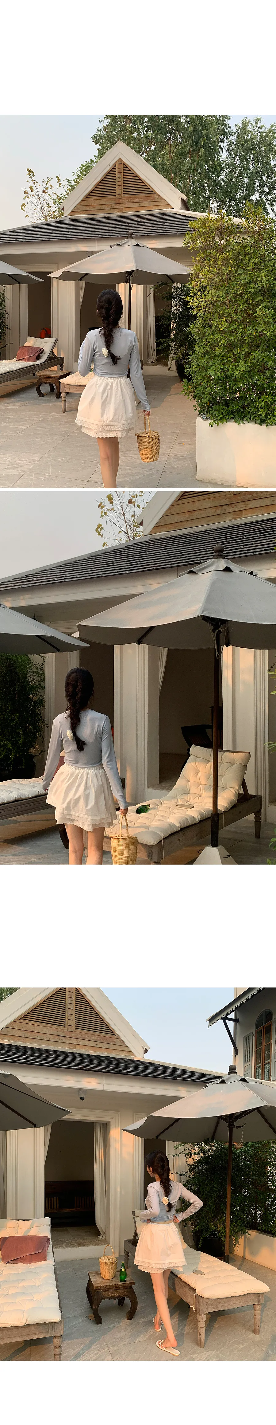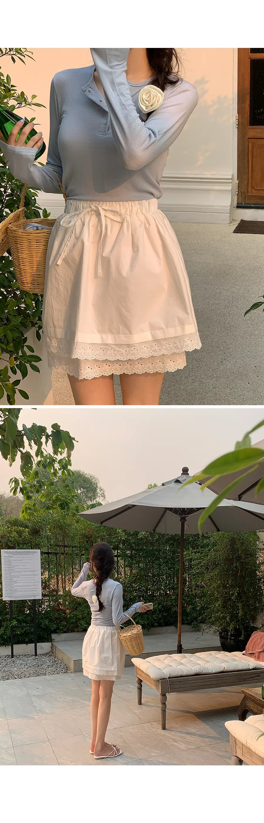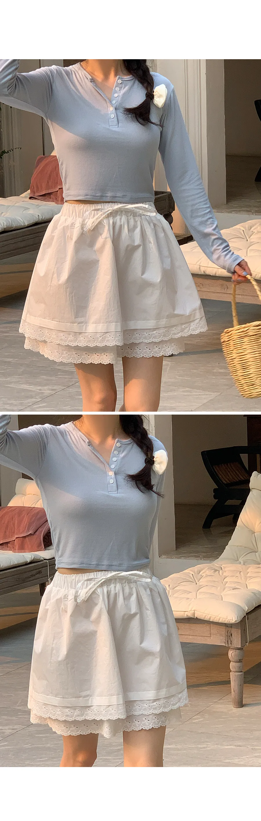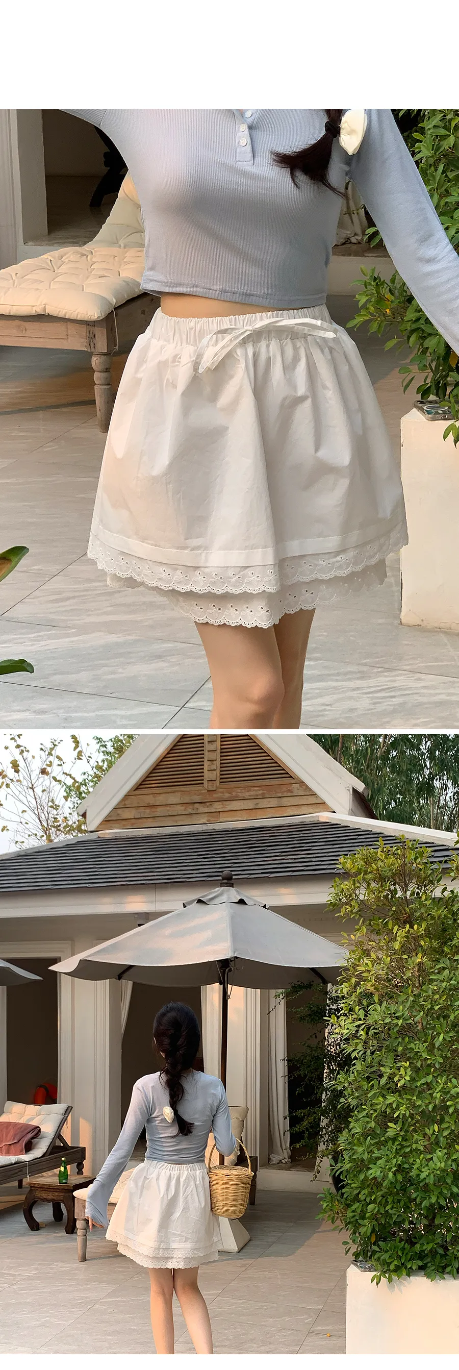 可愛雙層次刺繡蕾絲腰部綁帶短裙