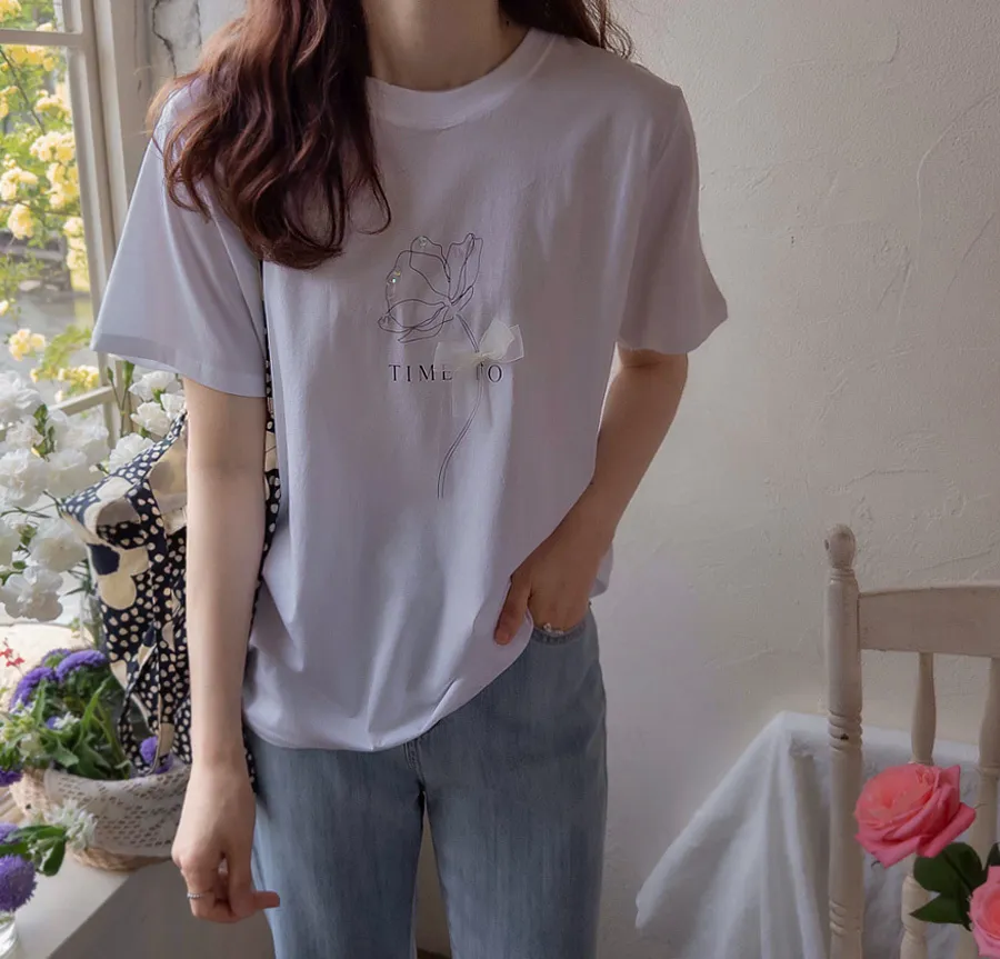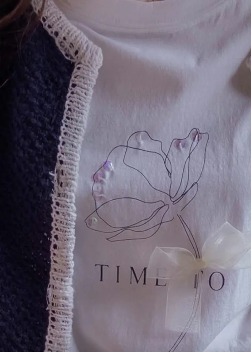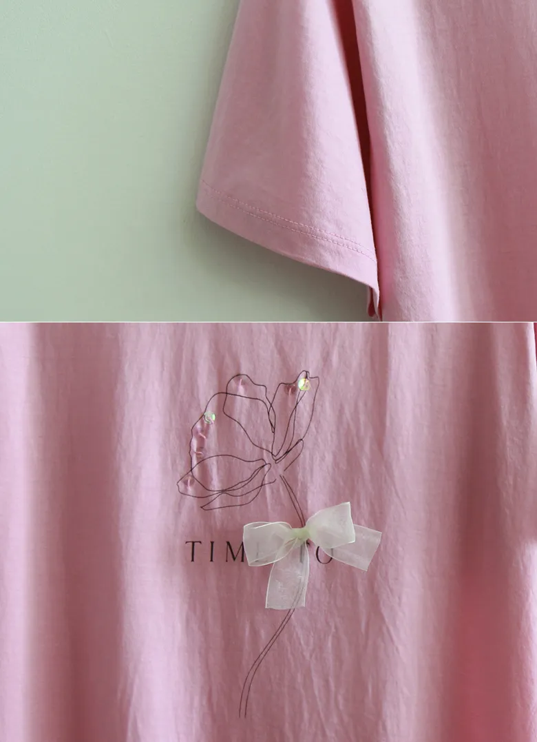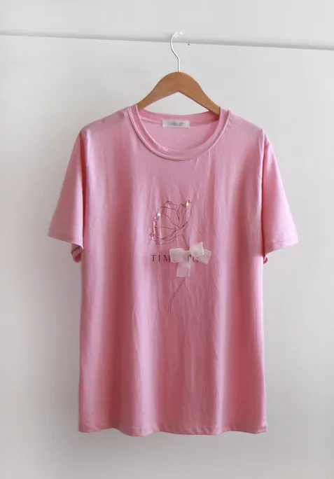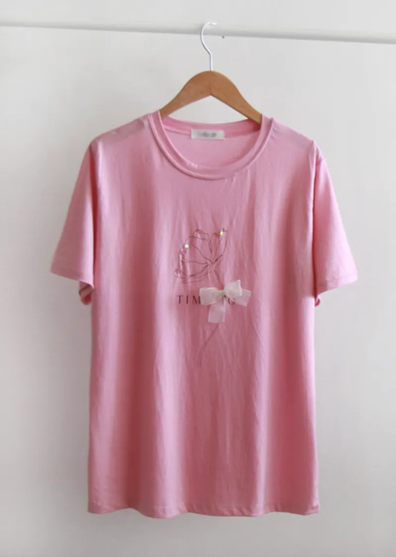 優雅點綴蝴蝶結珠串裝飾花朵短袖上衣