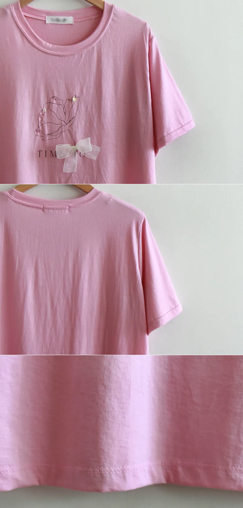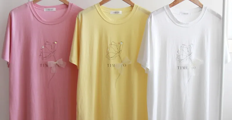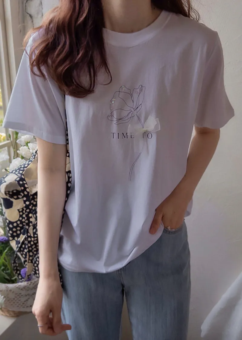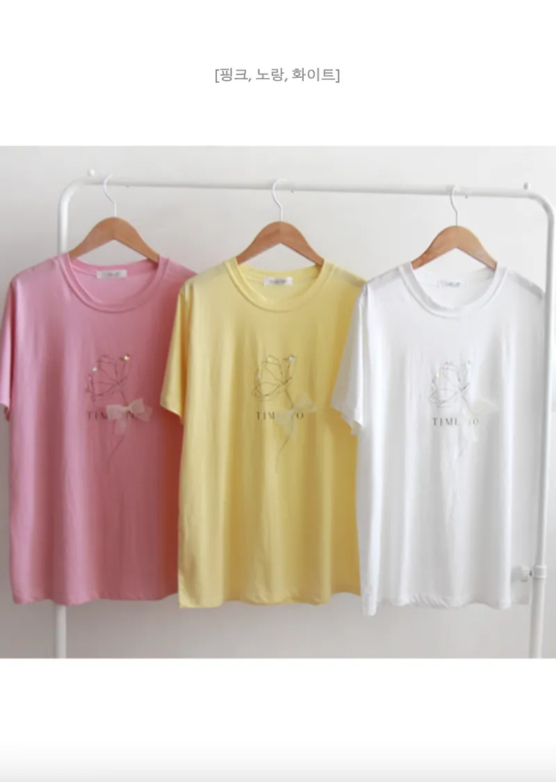 優雅點綴蝴蝶結珠串裝飾花朵短袖上衣