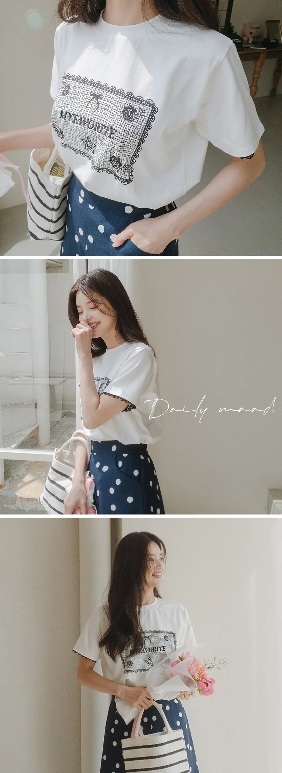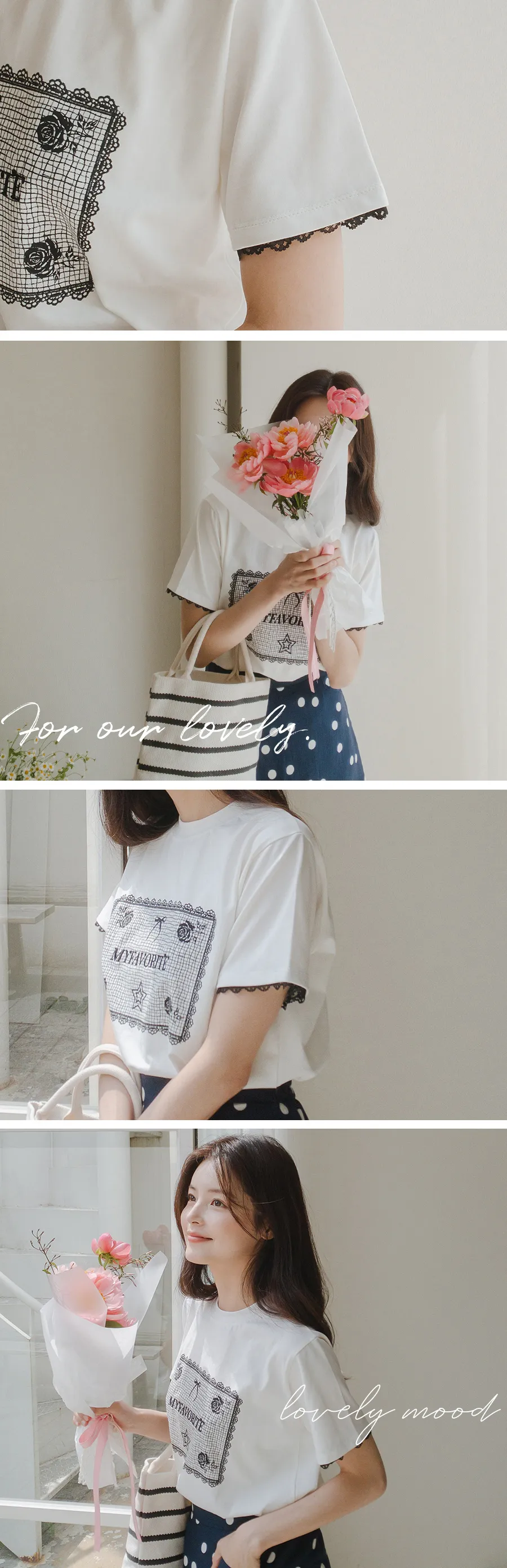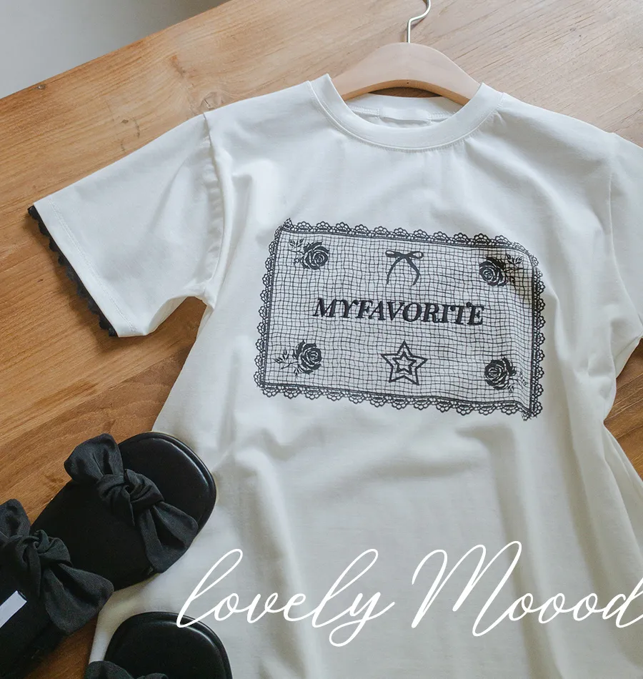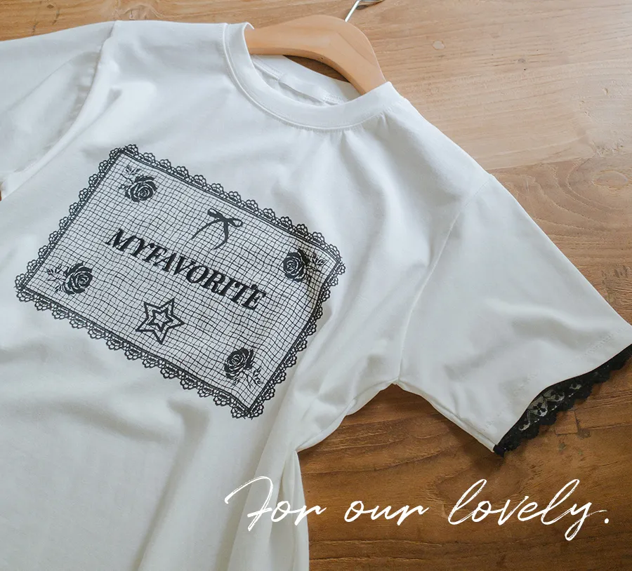 一款充滿可愛緞帶蕾絲的短袖T卹。 採用基本版型和圓領設計。 適中的半袖線條和蕾絲,給人一種奢華的感覺,繡有蕾絲和花朵絲帶,與外衣搭配也不會被遮擋的設計。 搭配裙子,給人一種可愛又奢華的情調。 搭配基本款休閒褲或牛仔褲也很適合日常穿著!