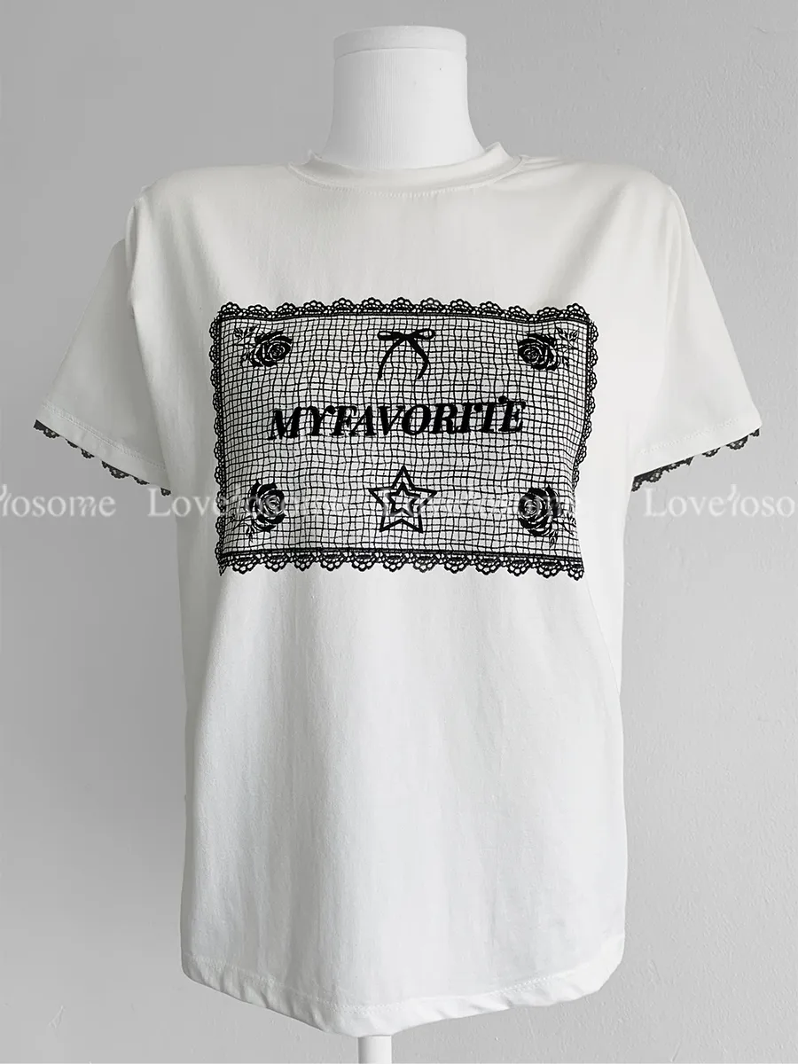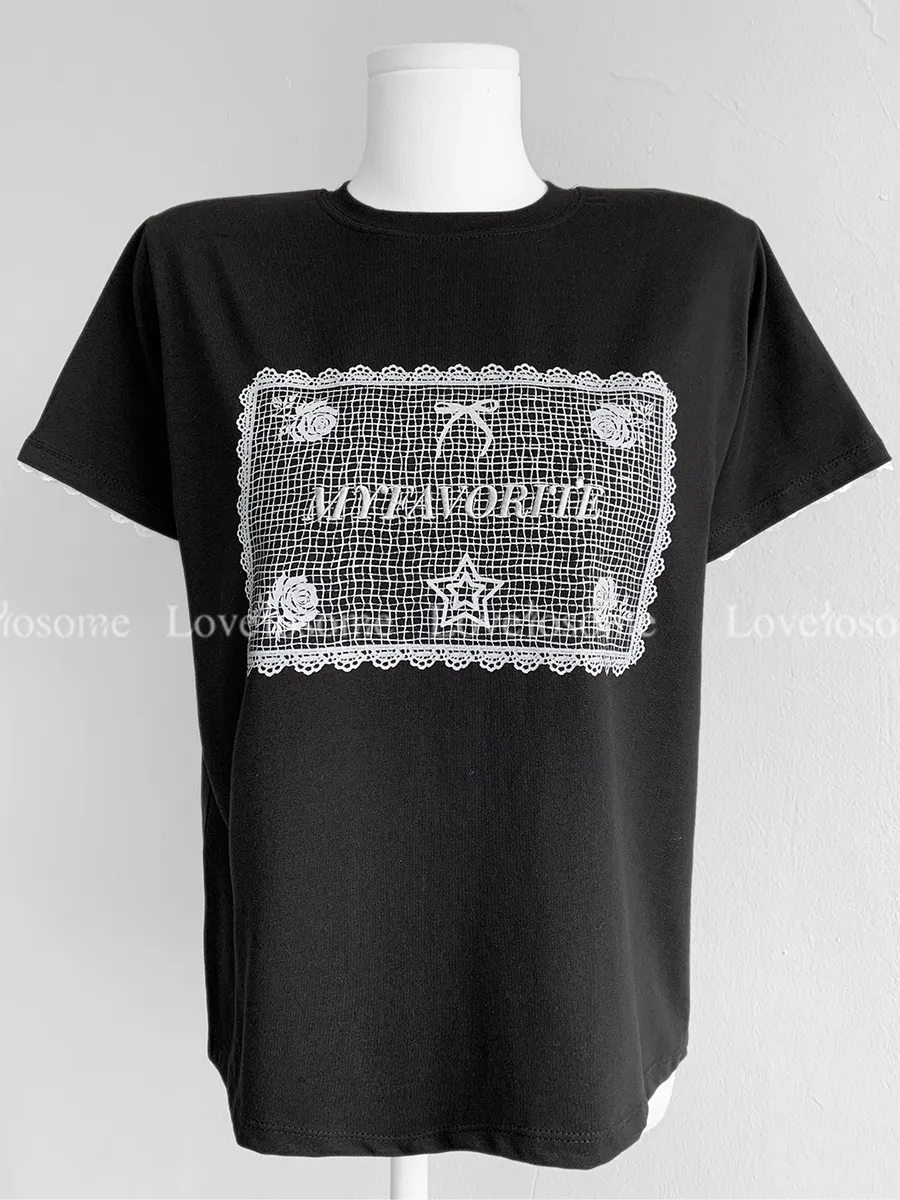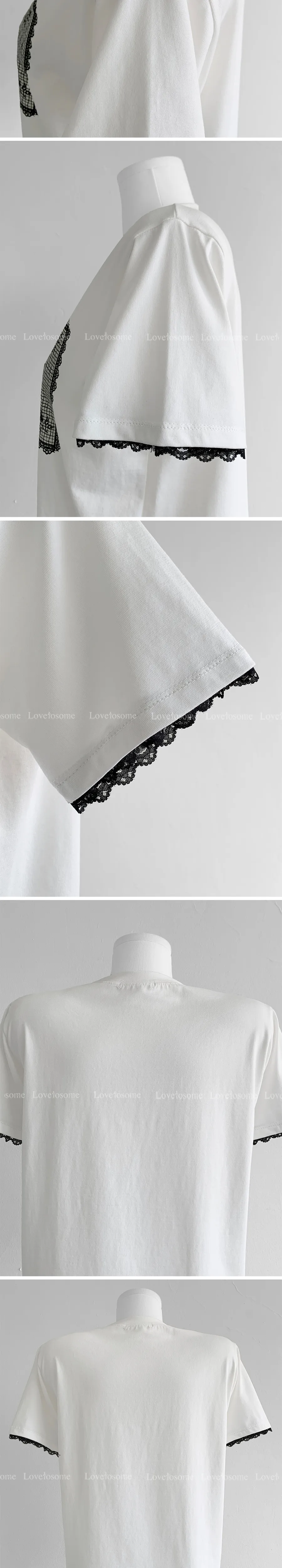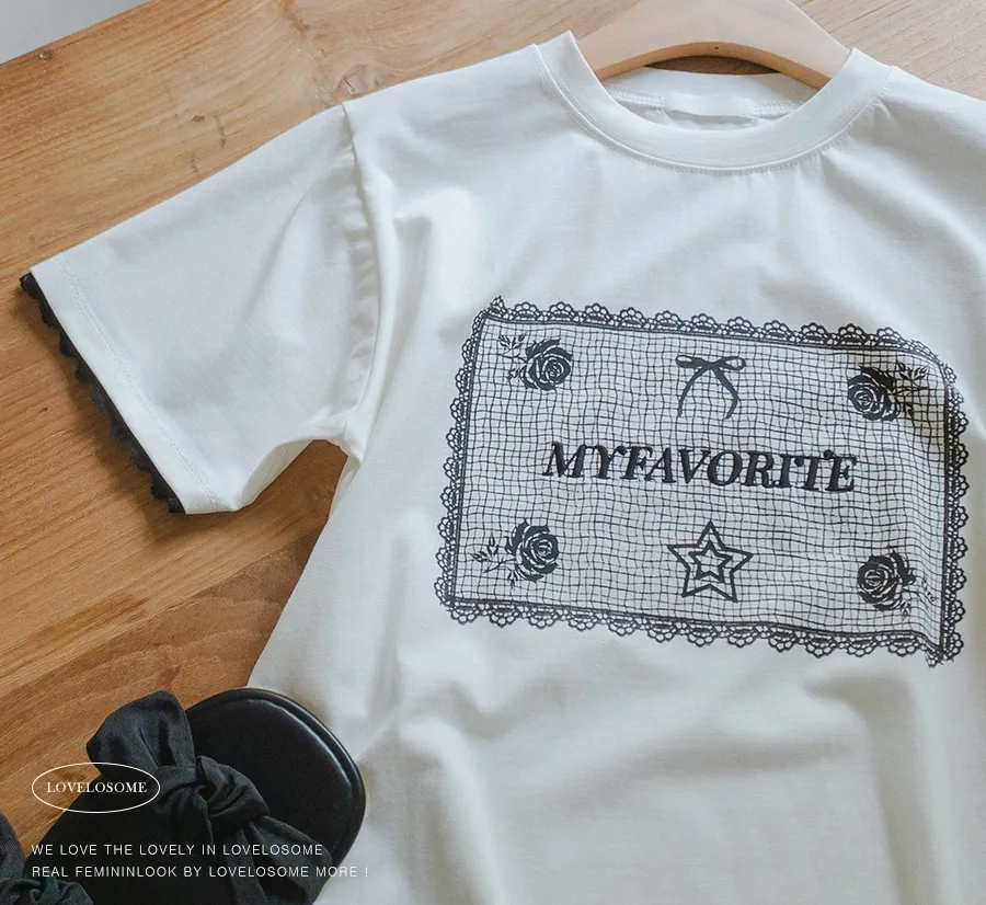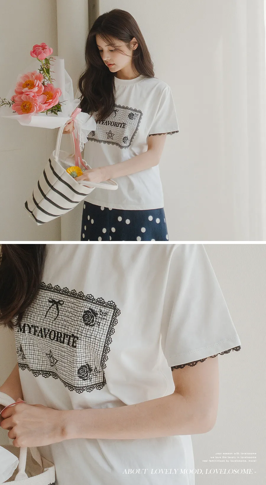 方型蝴蝶結花朵蕾絲印花點綴袖末蕾絲短袖上衣