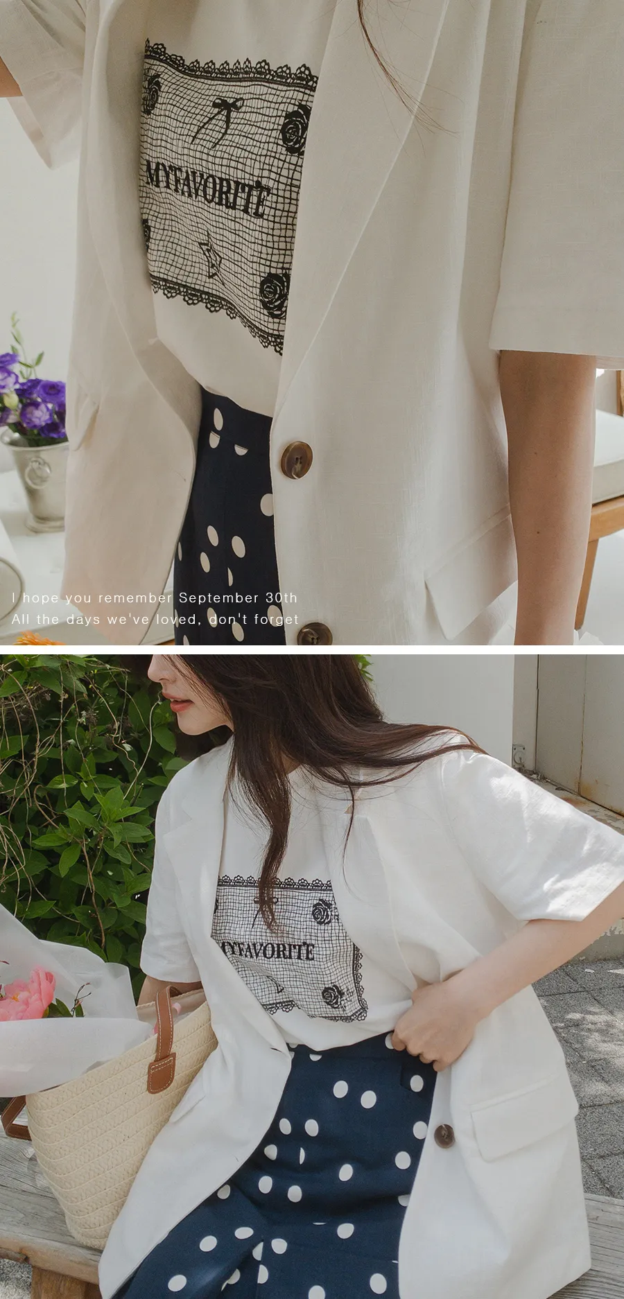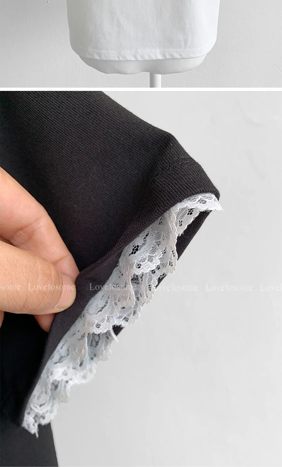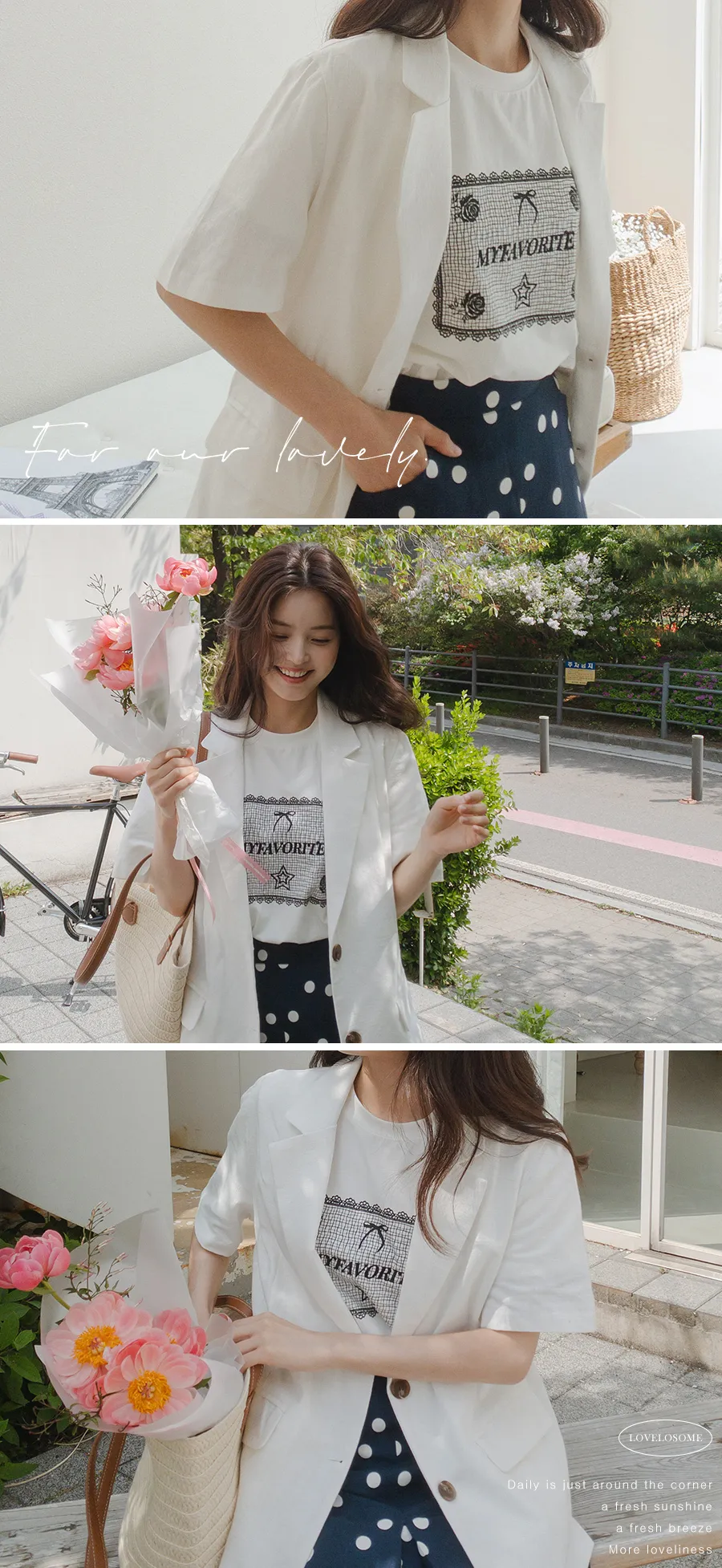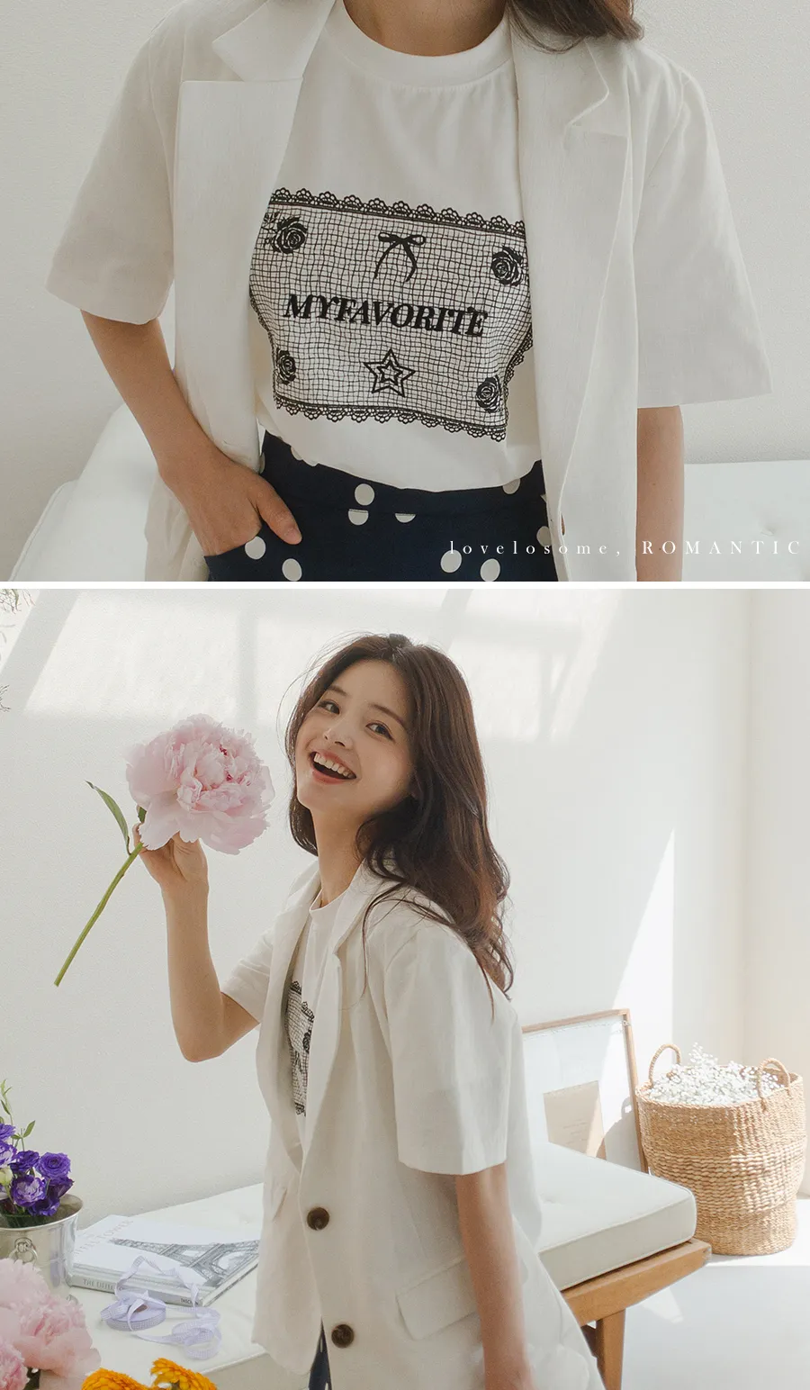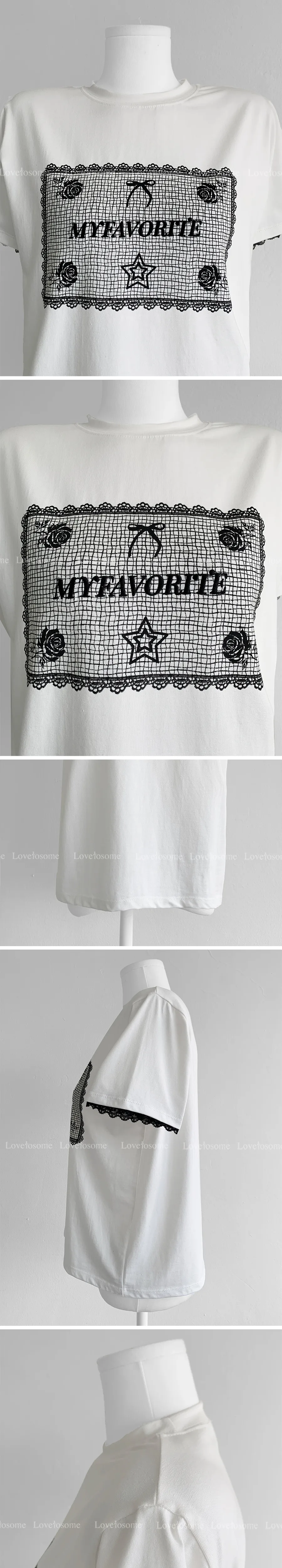 方型蝴蝶結花朵蕾絲印花點綴袖末蕾絲短袖上衣