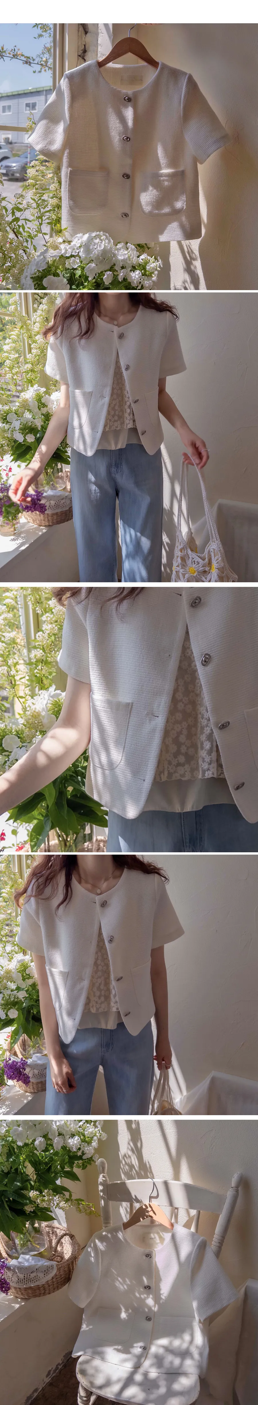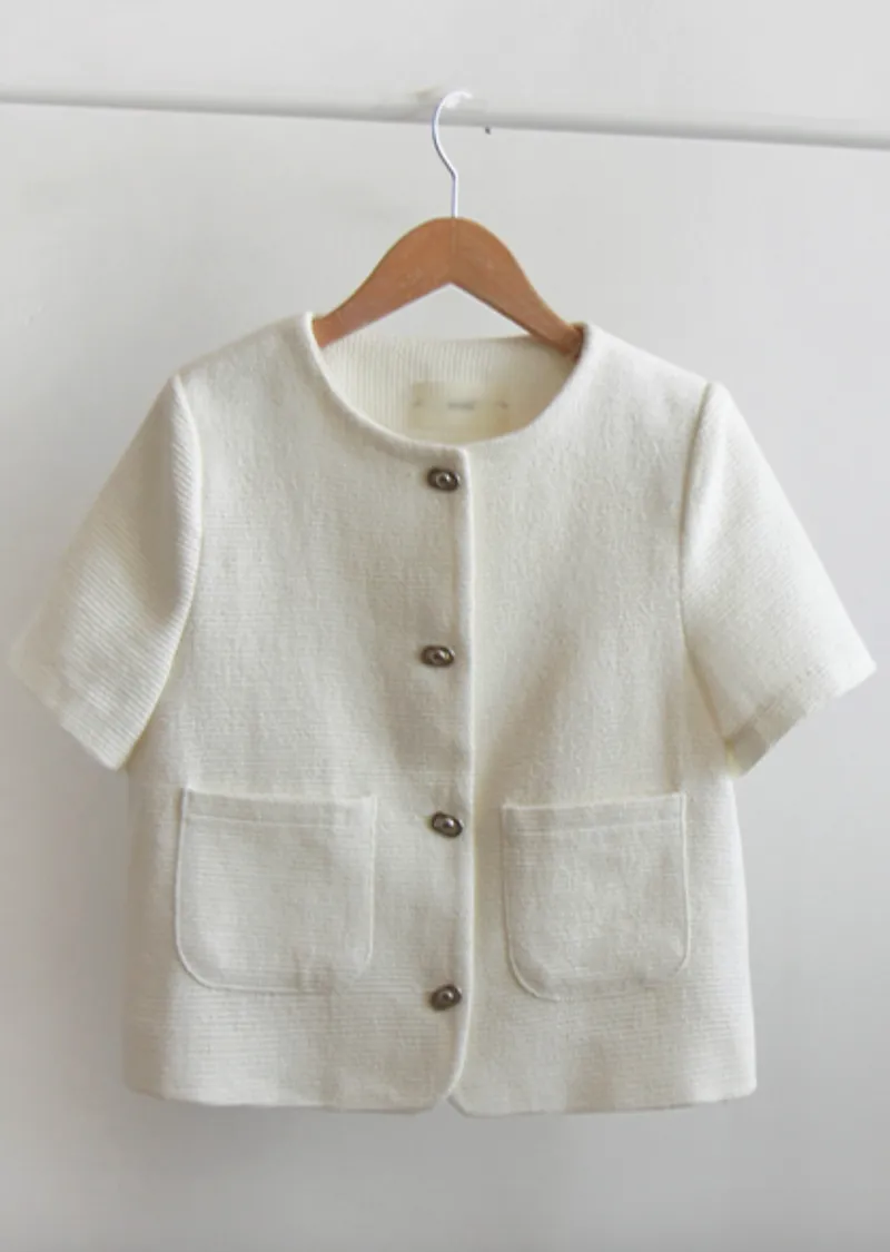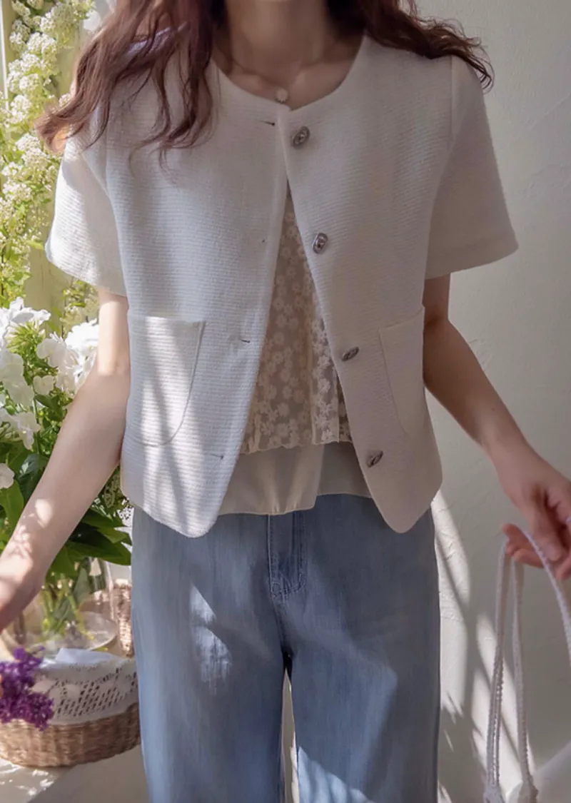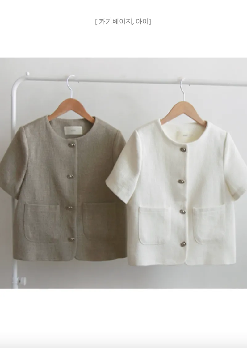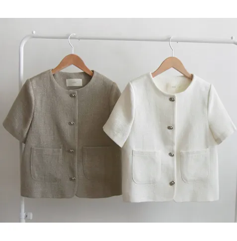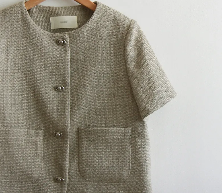 優雅獨特圓型鈕扣口袋短袖亞麻外套