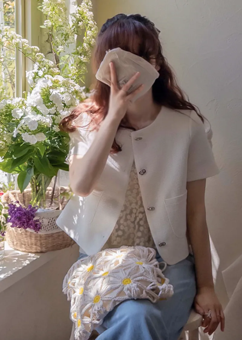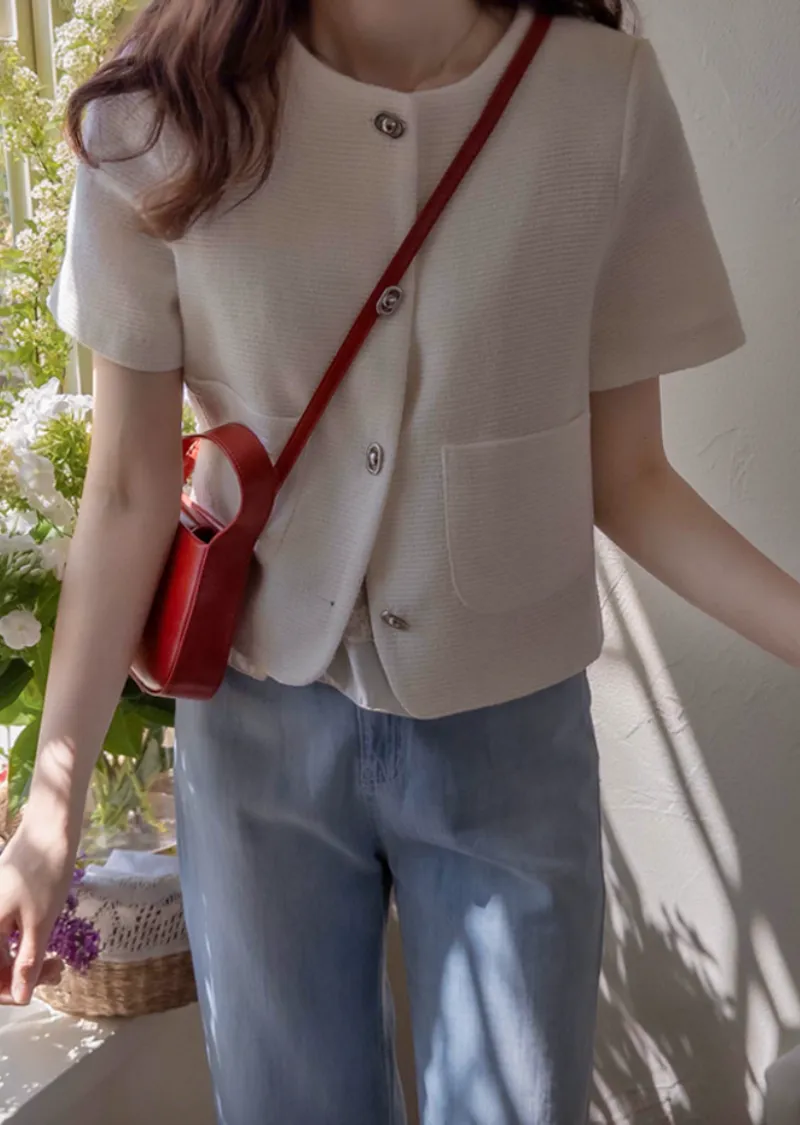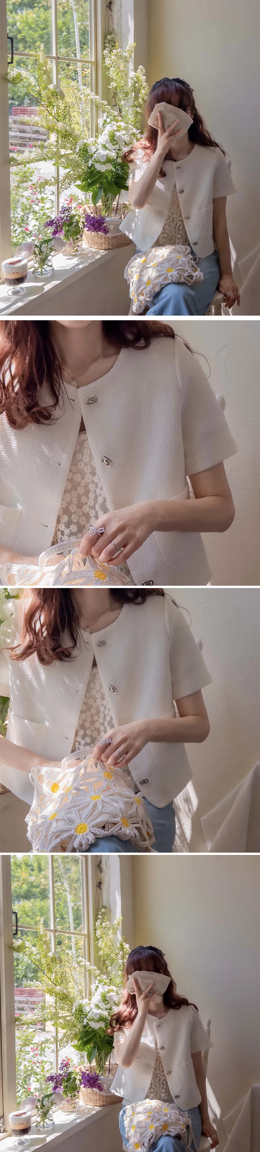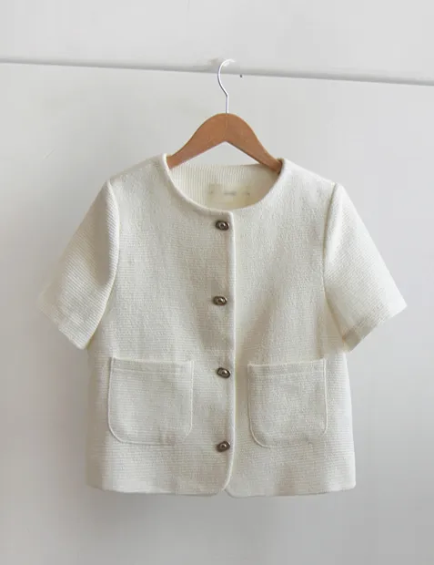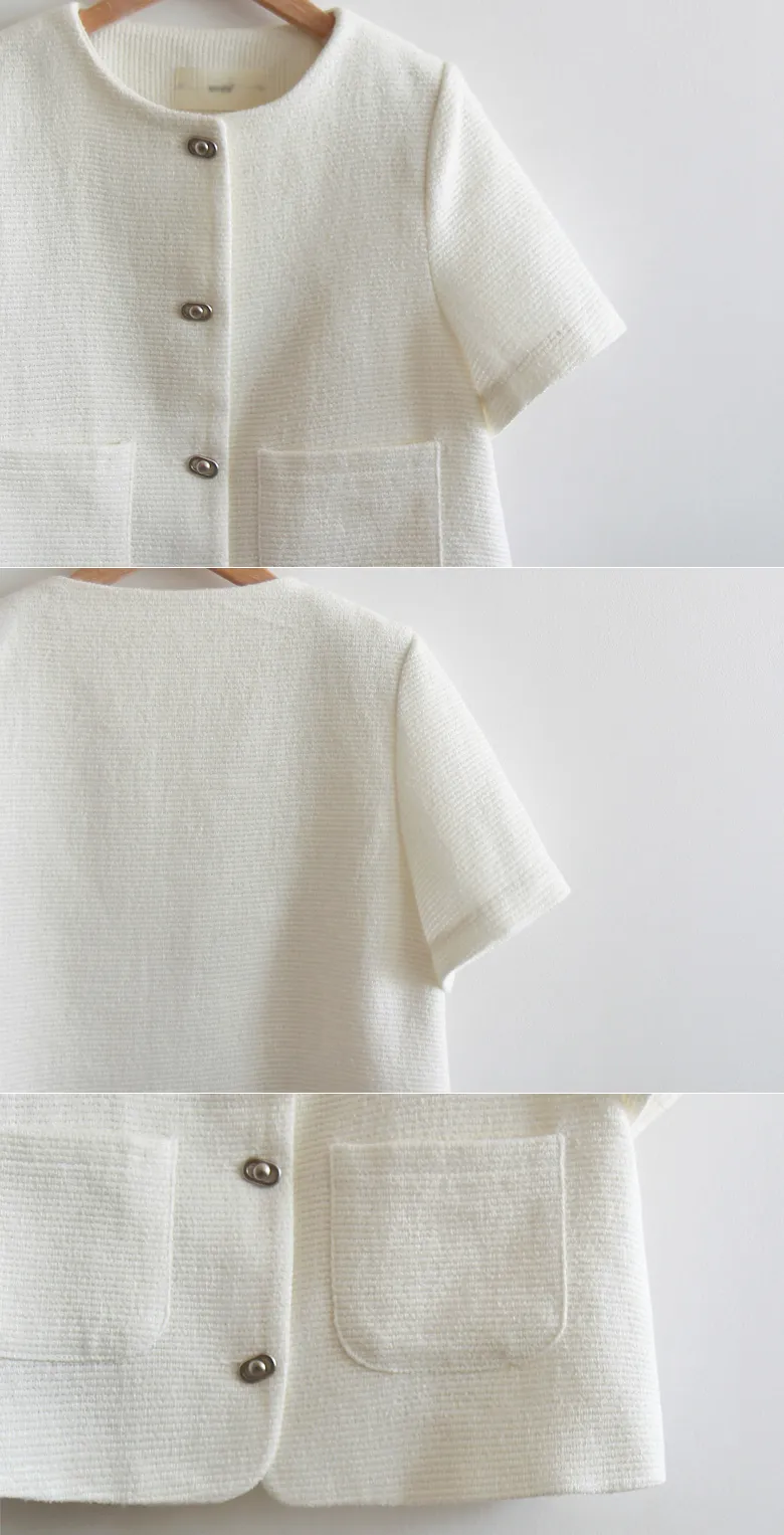 優雅獨特圓型鈕扣口袋短袖亞麻外套